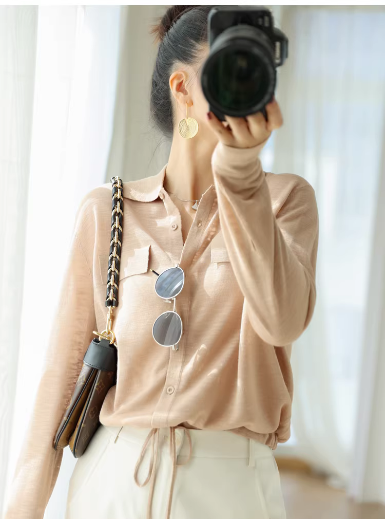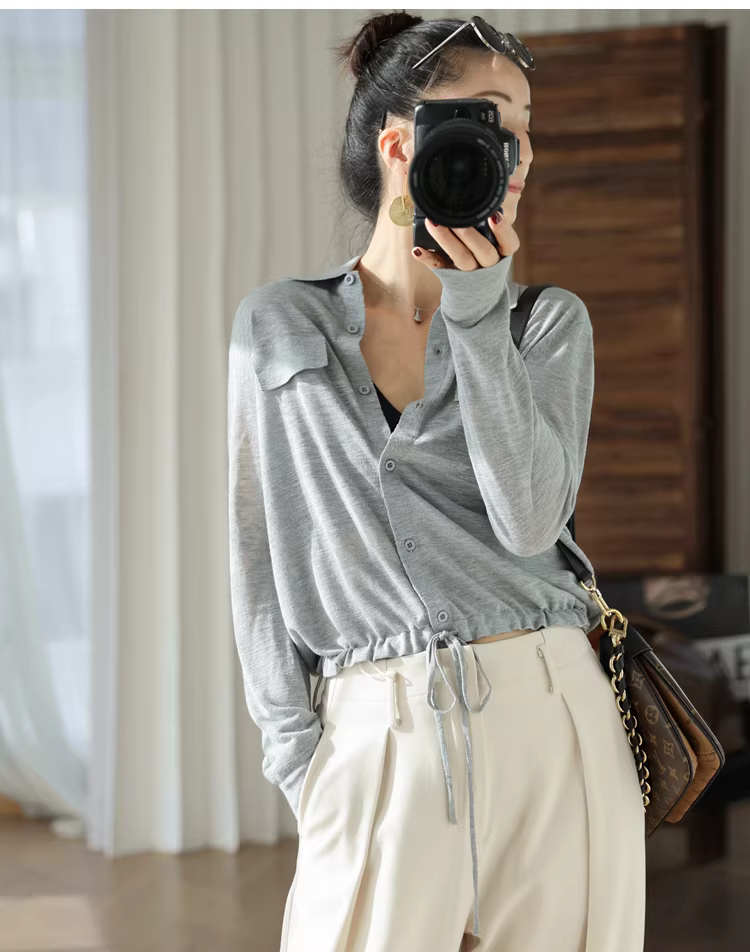 - 【Viscose sợi dài có thể giặt bằng máy】Áo cardigan dệt kim có dây rút ở viền, thoáng khí, nhẹ, thoáng khí, dệt kim mịn 16 gauge dành cho nữ