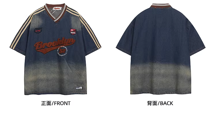 Wukong có sẵn áo thun denim ngắn tay phong cách đại học cổ điển Mỹ đã qua xử lý, dành cho nam và nữ, áo kiểu chữ V thời thượng dành cho cặp đôi mùa hè.