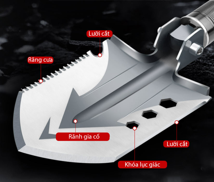 Bộ sản phẩm ngoài xẻng chính còn đi kèm theo nhiều công cụ hỗ trợ cho việc cắm trại dã ngoại: Xẻng đa năng, dao, đánh lửa, còi cứu hộ, đầu phá kính