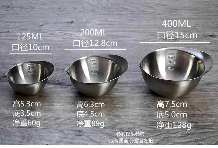 - Xuất khẩu sang Nhật Bản, bát đựng gia vị, nước sốt, bột nhão làm bằng thép không gỉ 304 đạt chuẩn thực phẩm, có vòi rót, cốc đong có vạch chia độ