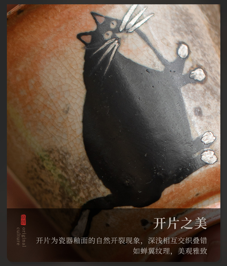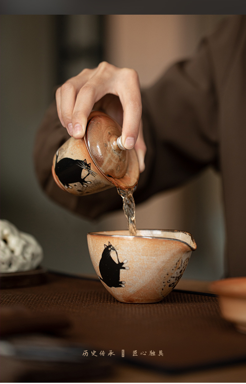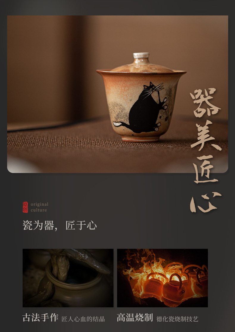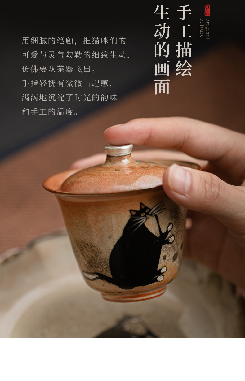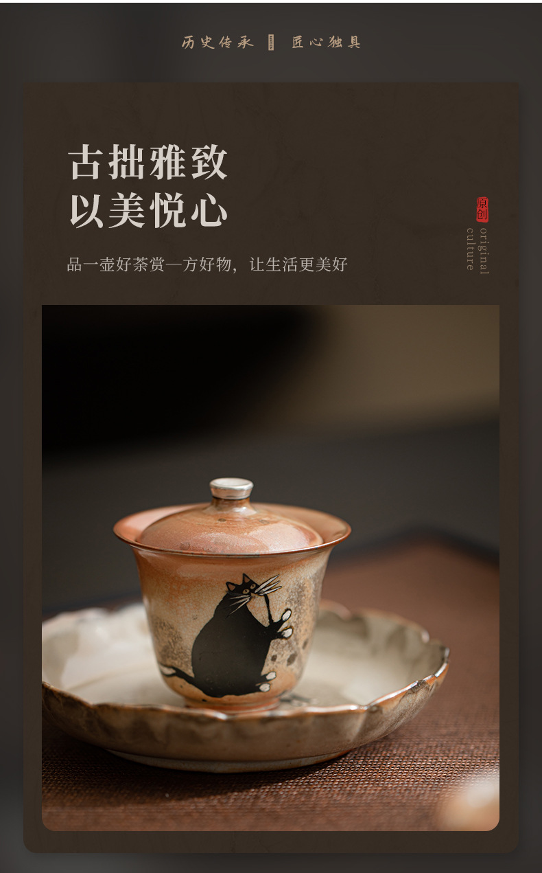 - Zhiye Cat Tingtao Nắp bát thay đổi thứ hai Nắp bát sứ Retro gốm sứ pha trà chén trà Giả Gỗ Thủ Công Bạc vẽ tay