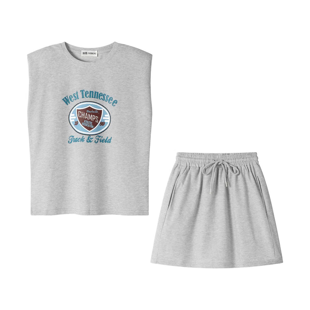 Áo ba lỗ không tay in chữ phong cách Hàn Quốc dành cho nữ, váy ngắn lưng cao đa năng, bộ đồ hai mảnh thời trang mùa hè