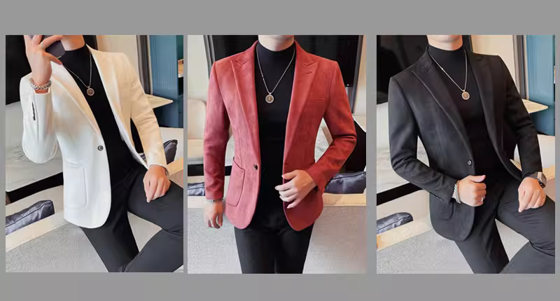 Áo blazer da lộn nam, kiểu mới thu đông 2024, phong cách công sở lịch lãm, cao cấp, thời trang và đơn giản.