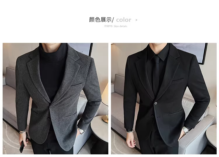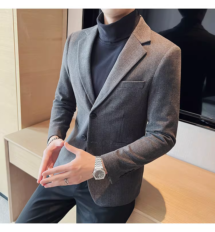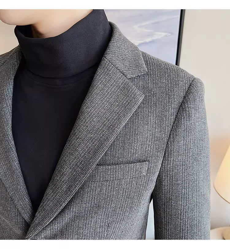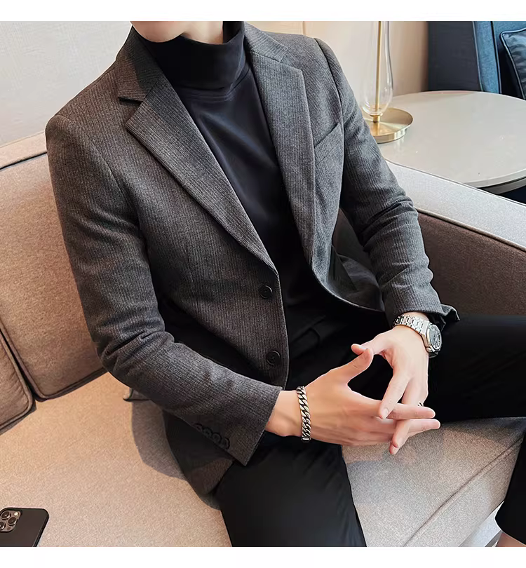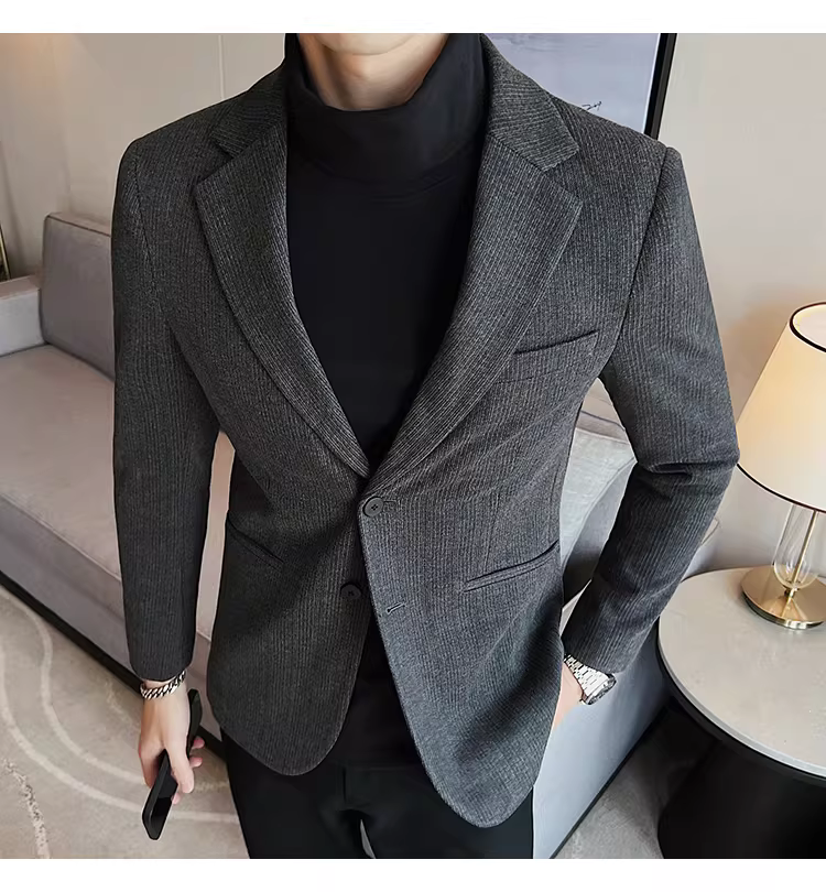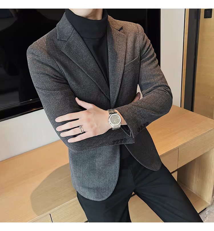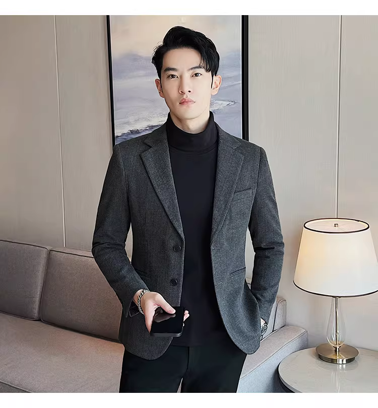 Áo blazer len sọc tối màu dành cho nam, chất liệu dày dặn mùa thu đông, dáng ôm, đơn hàng khuy, kiểu dáng công sở cao cấp.