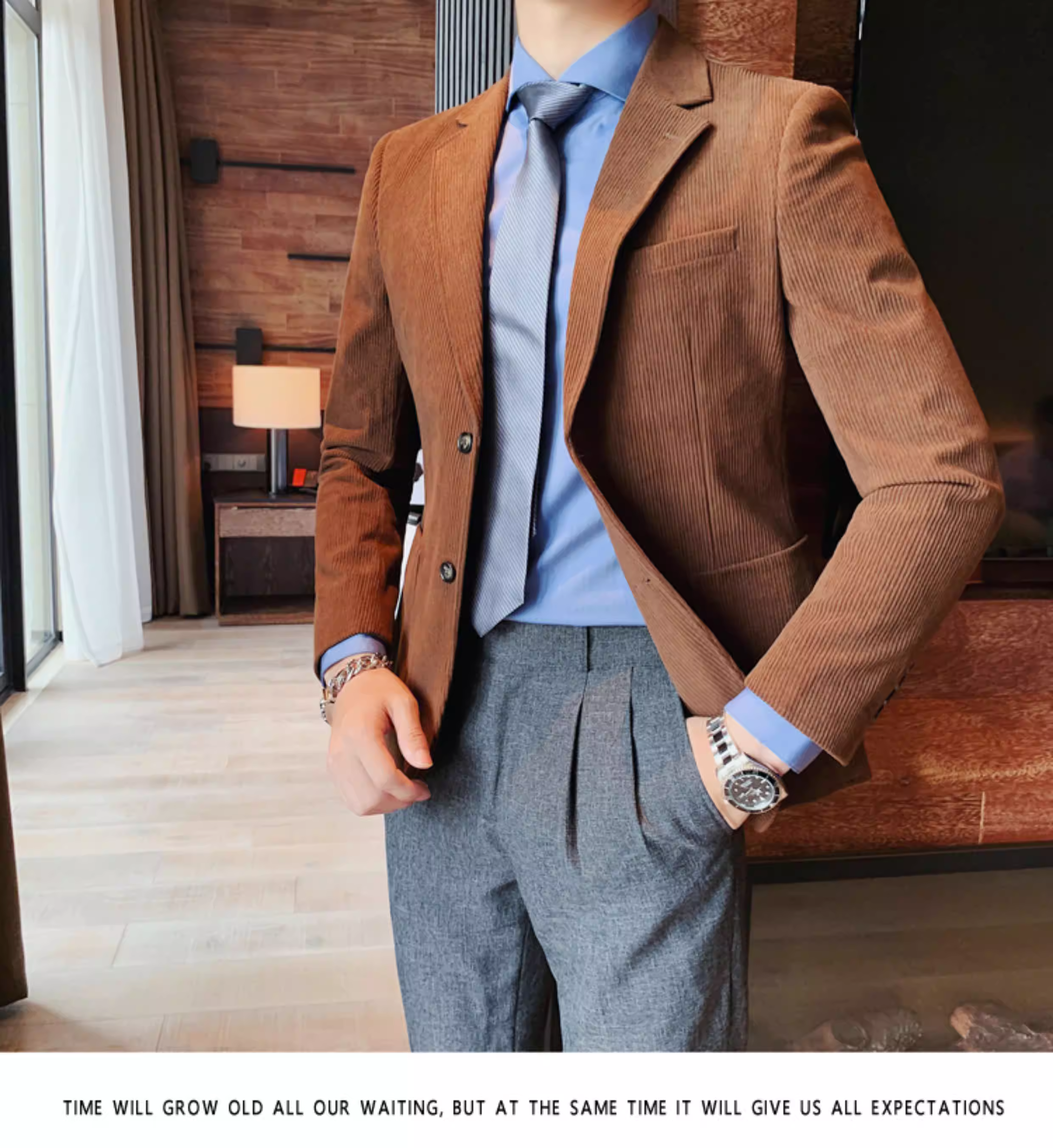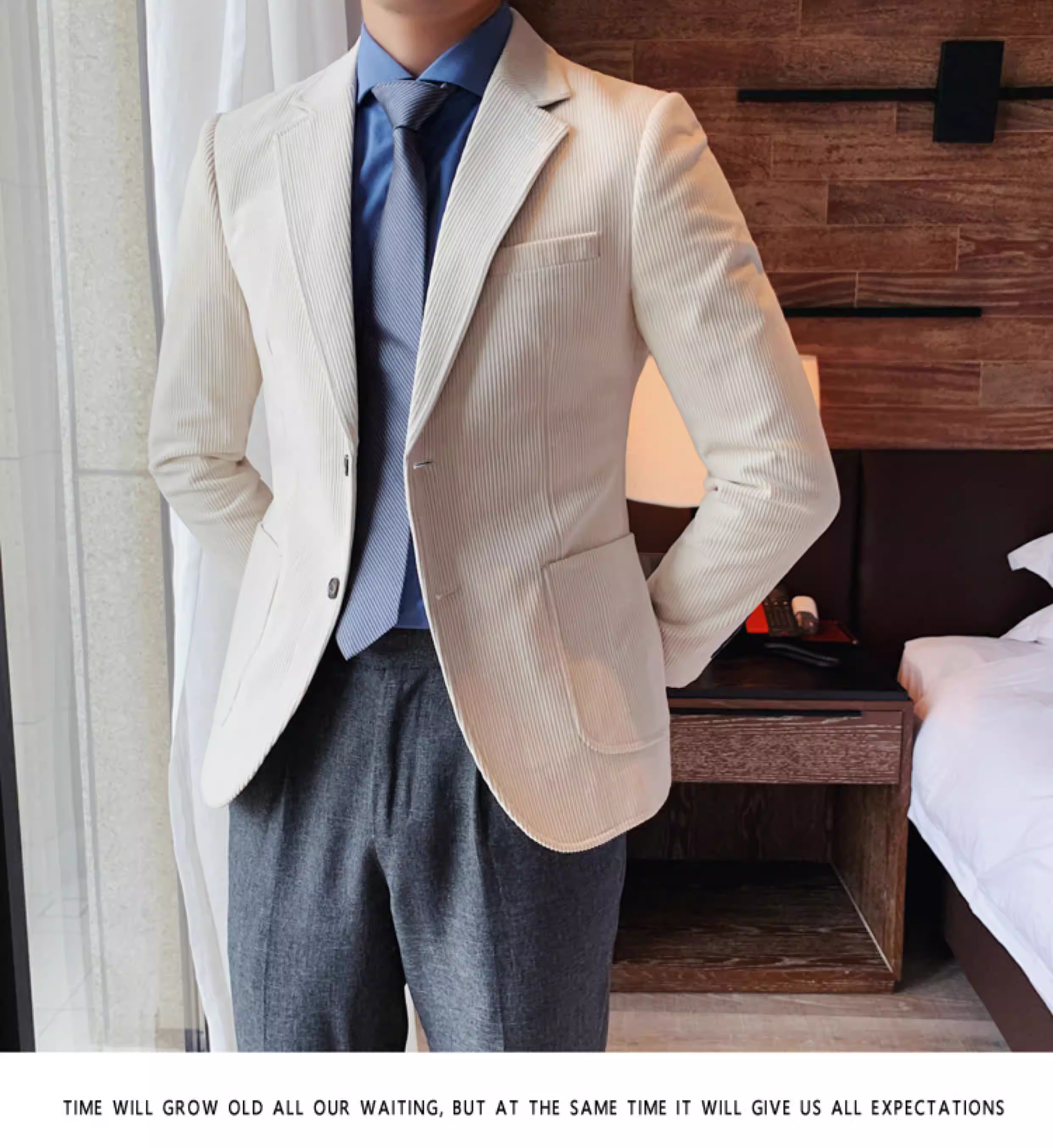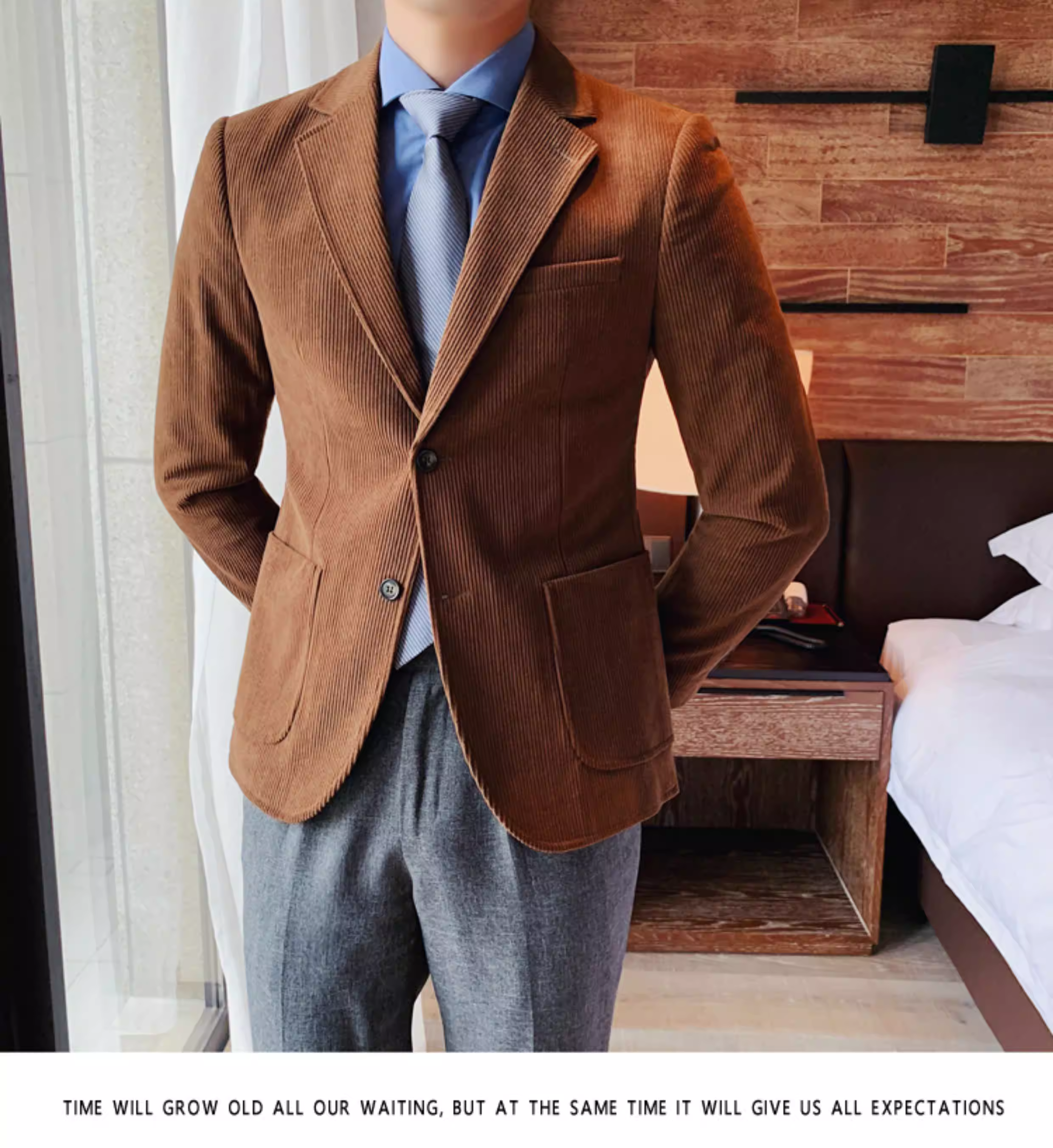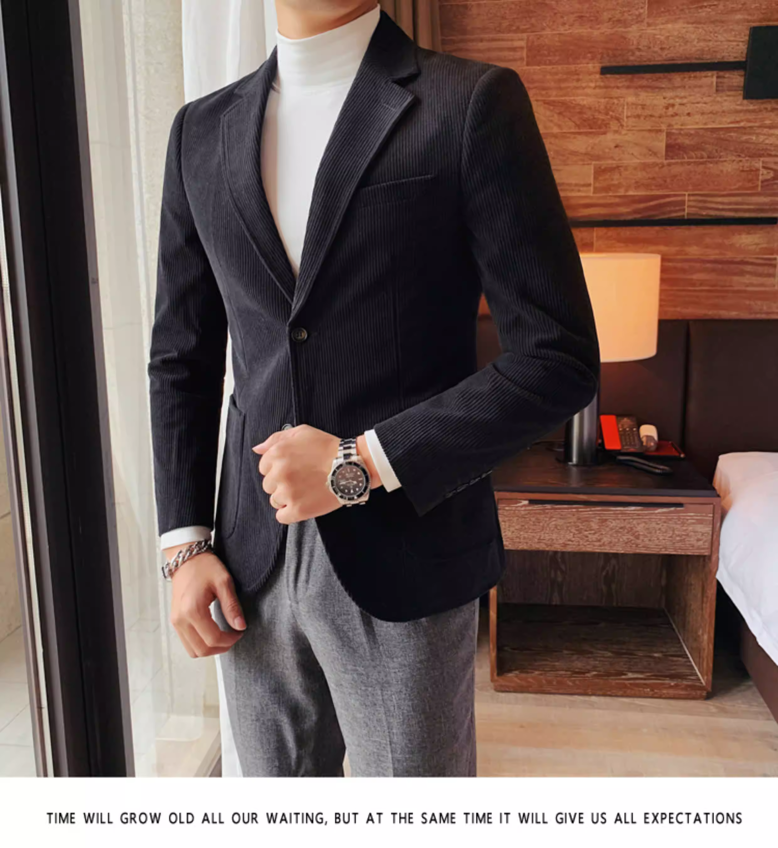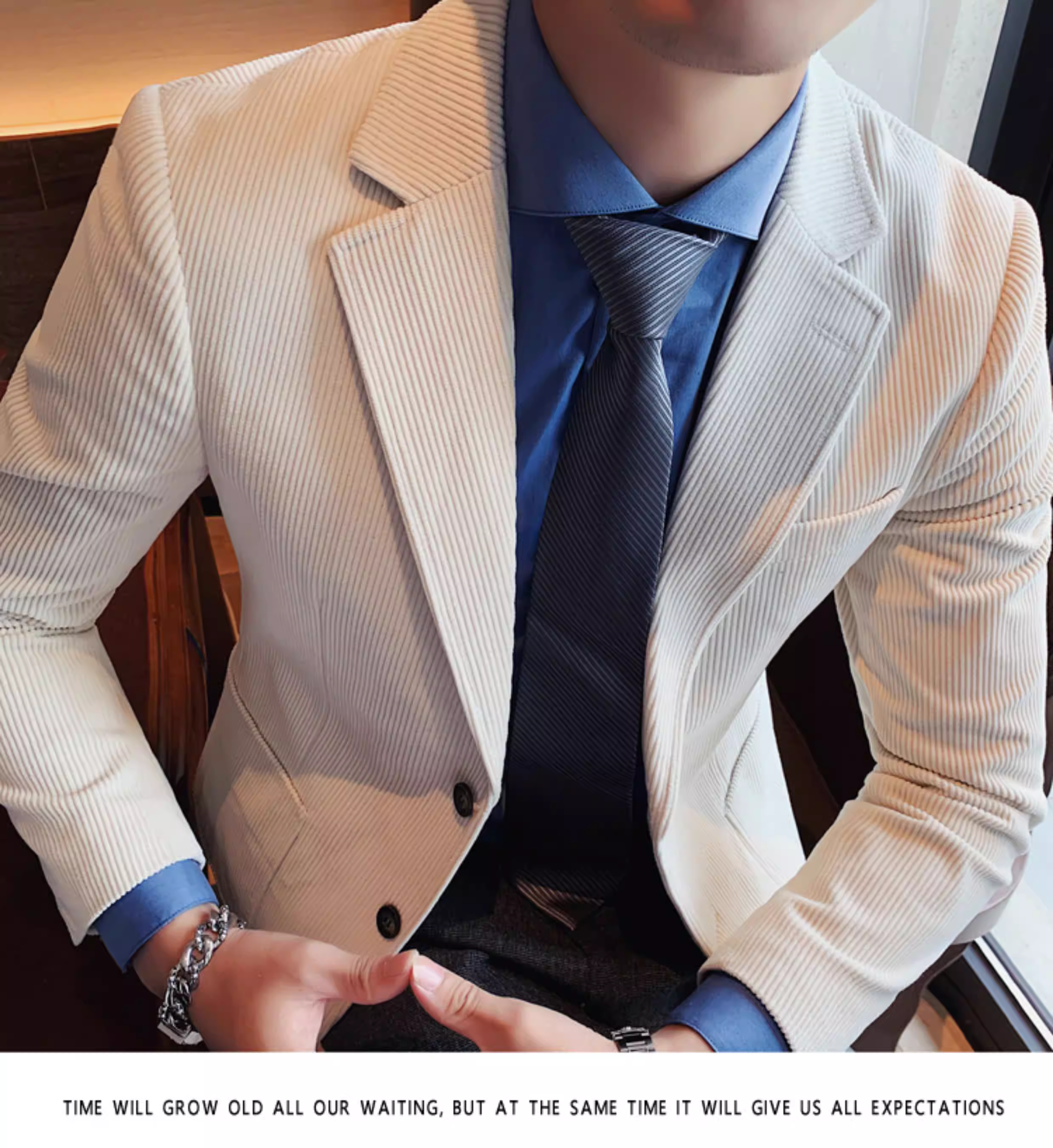- Áo blazer nam chất liệu corduroy, mùa thu đông, dày dặn, thời trang, hợp xu hướng, kiểu dáng sọc cá tính, dáng ôm, đơn hàng khuy.