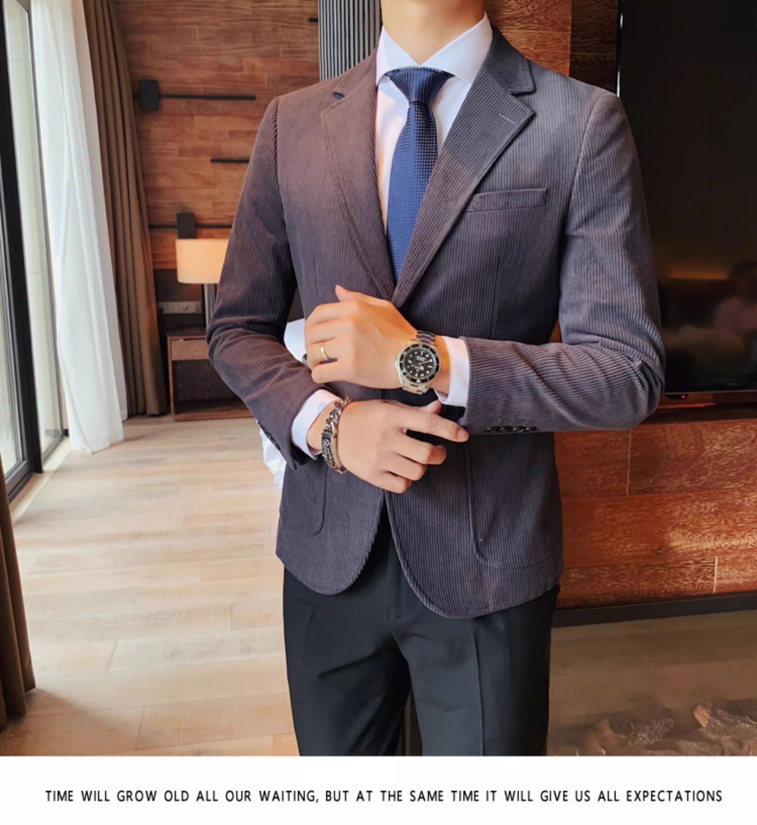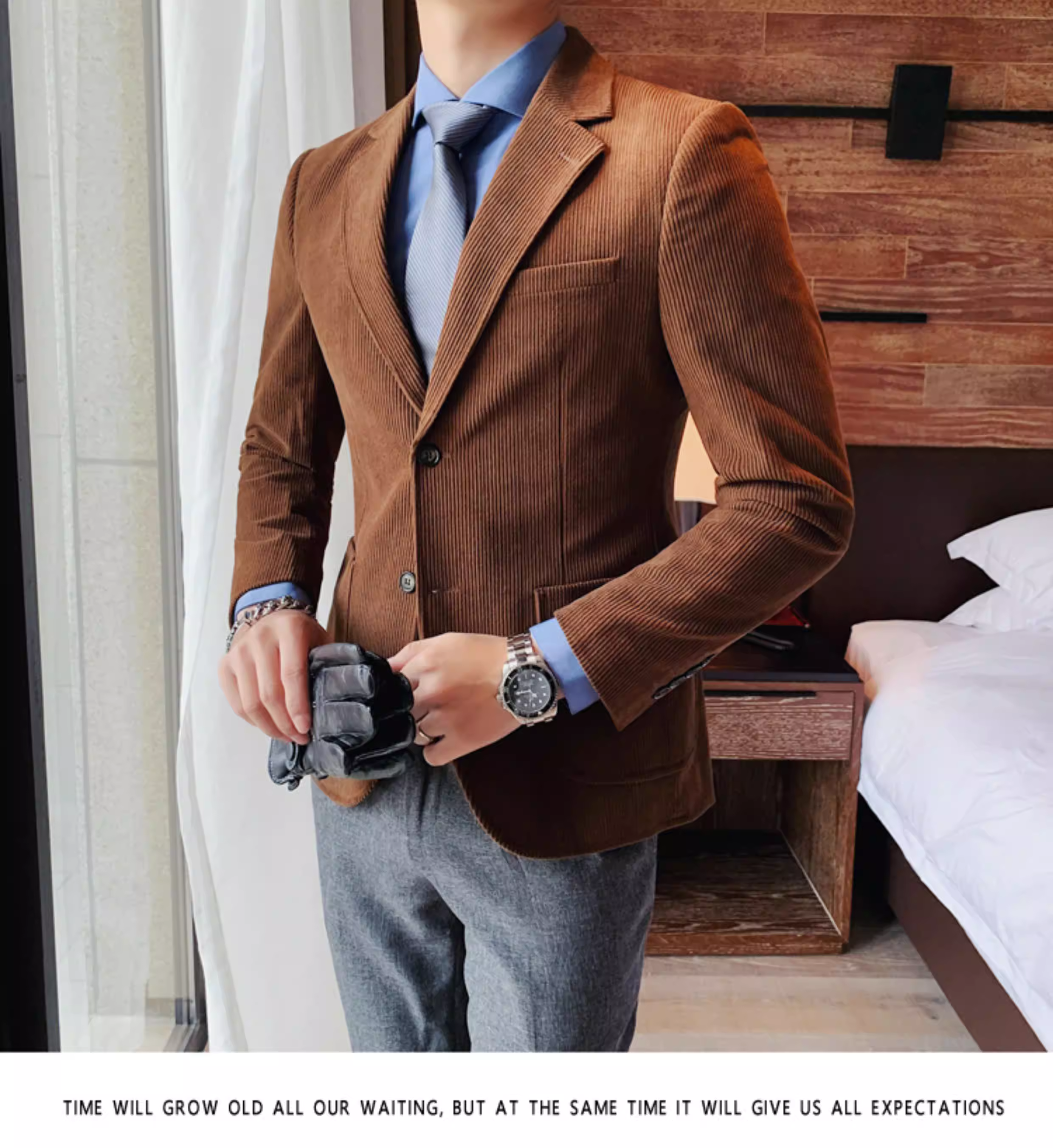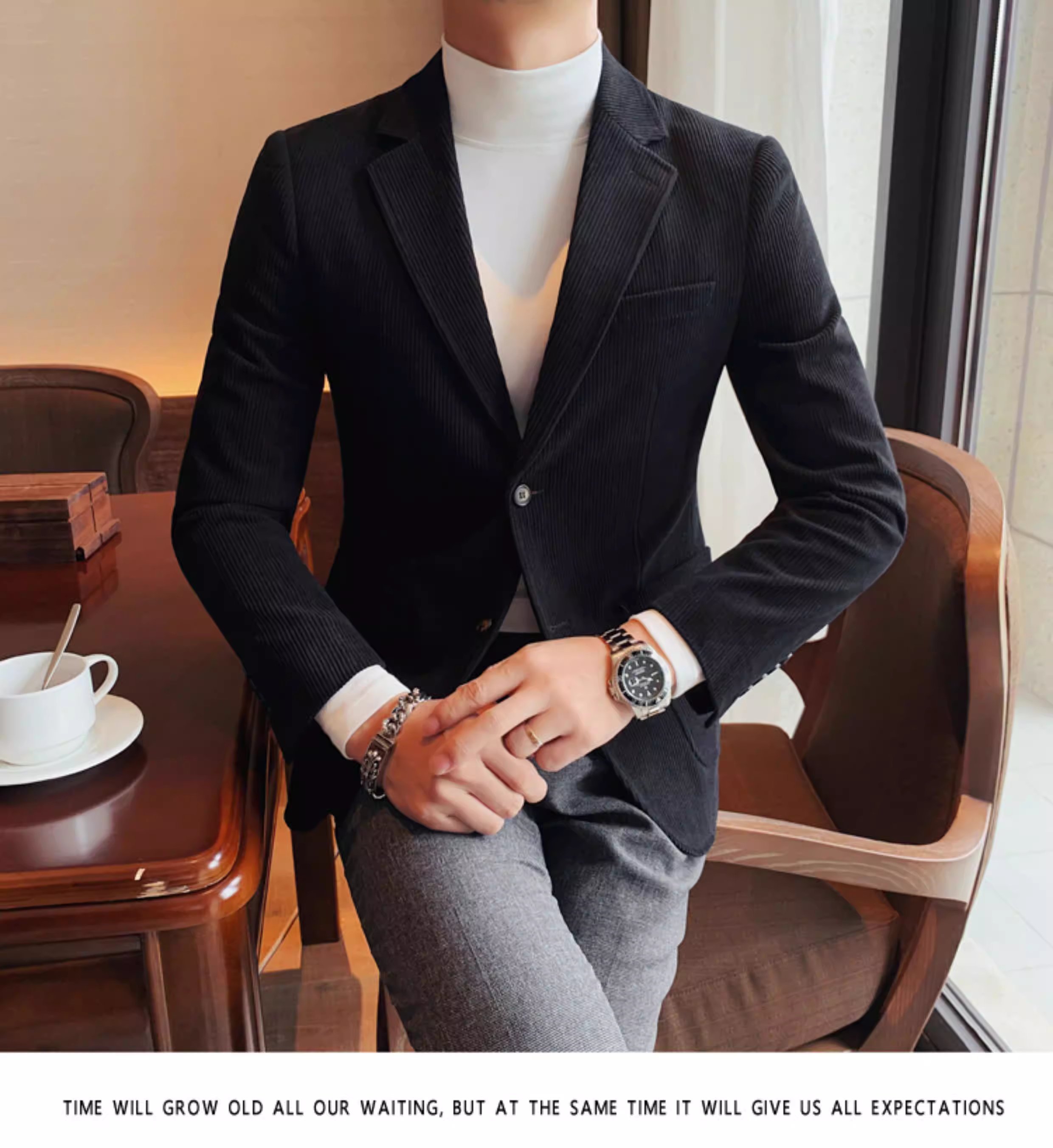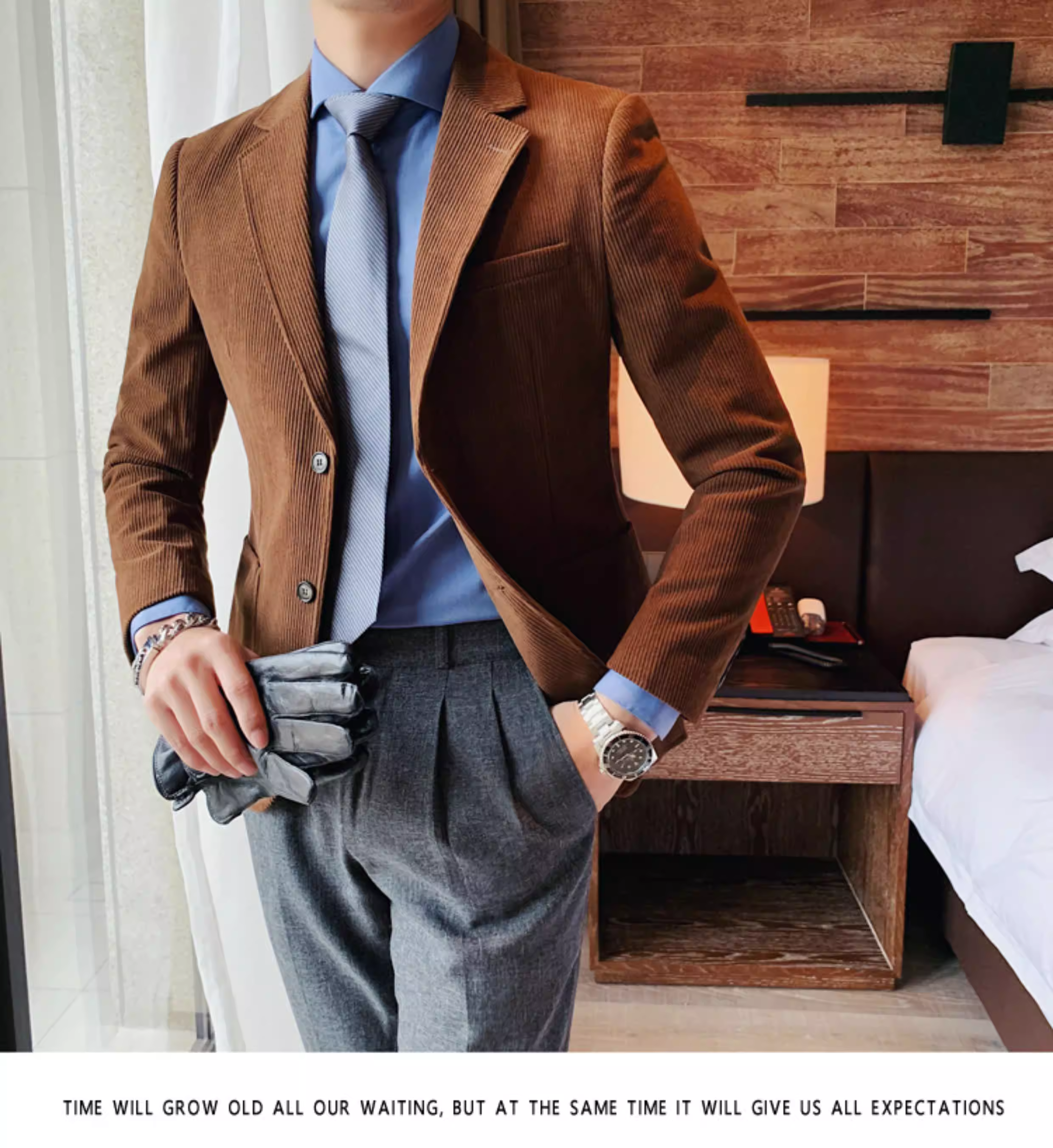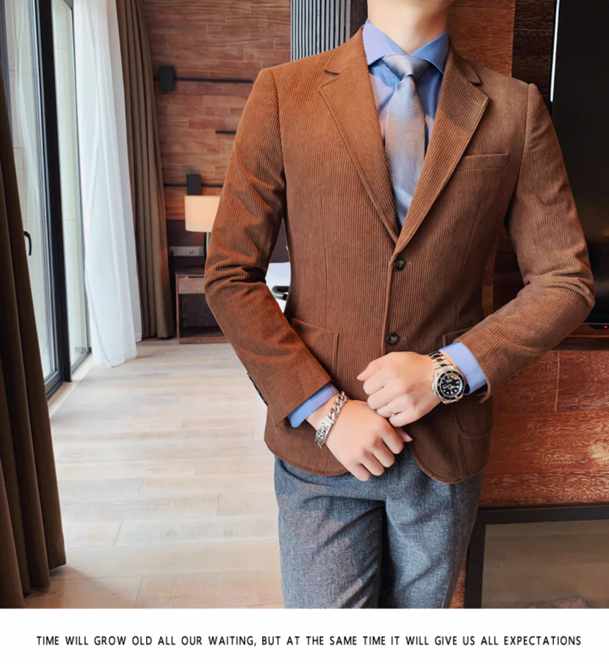 - Áo blazer nam chất liệu corduroy, mùa thu đông, dày dặn, thời trang, hợp xu hướng, kiểu dáng sọc cá tính, dáng ôm, đơn hàng khuy.