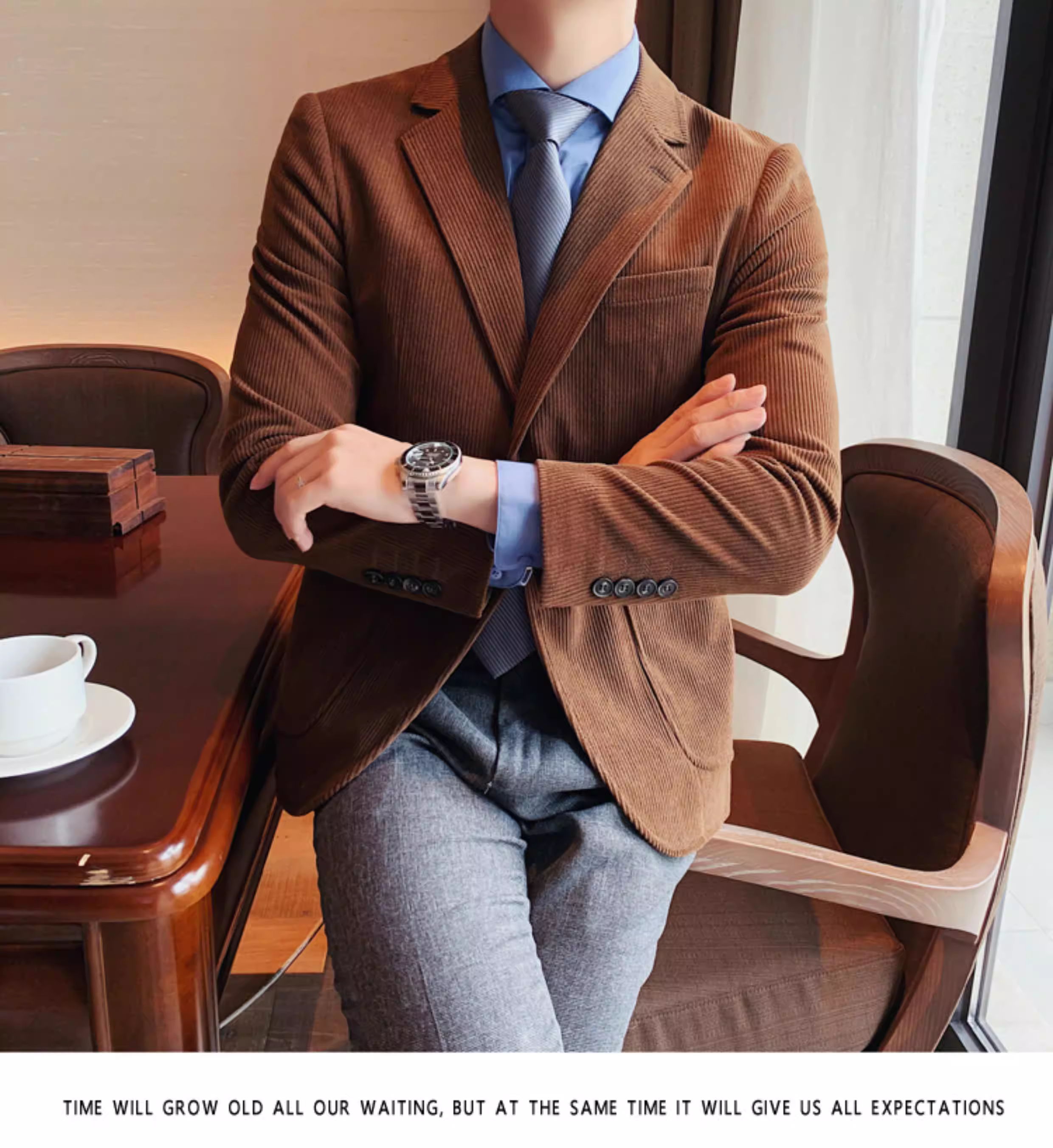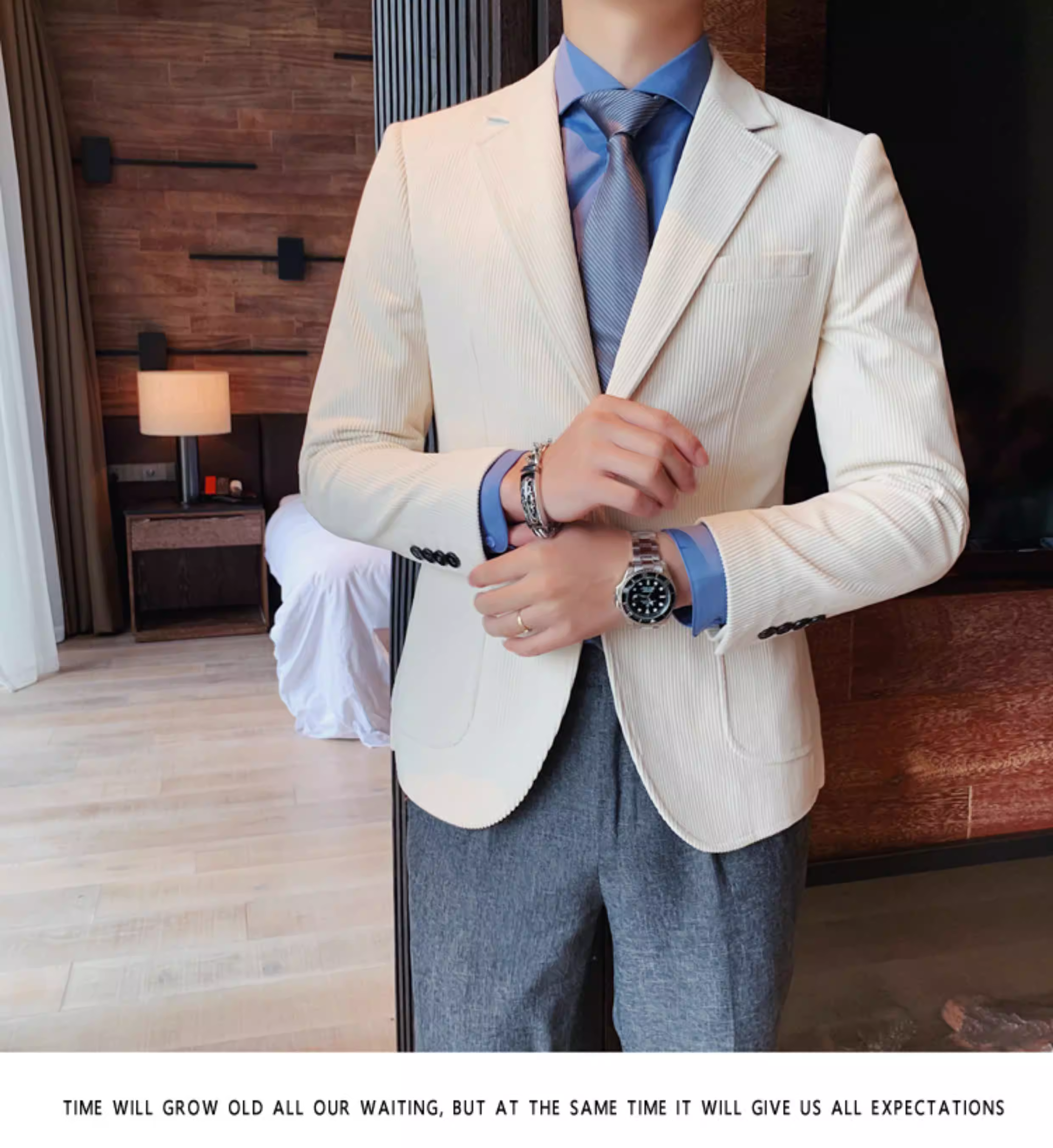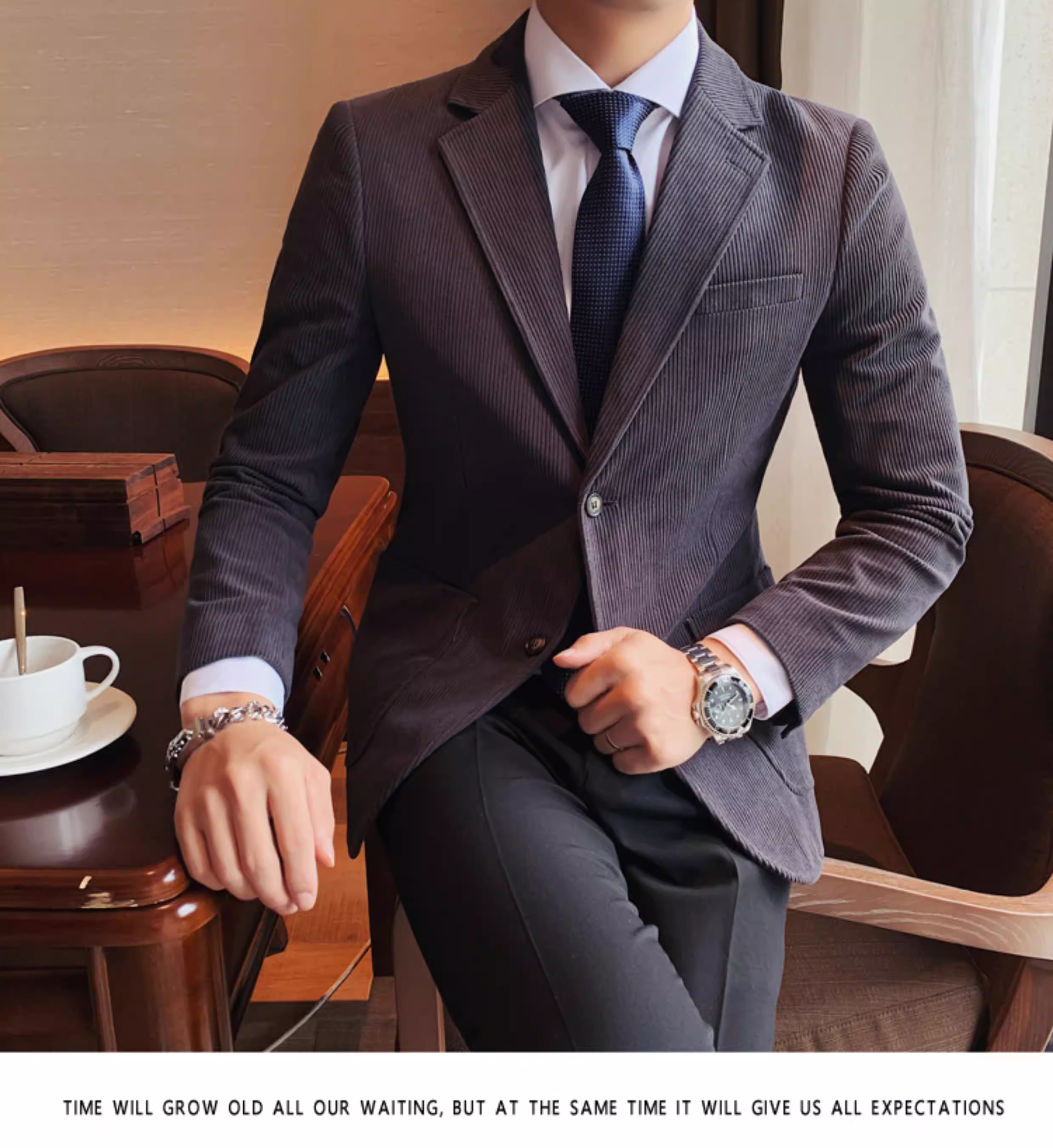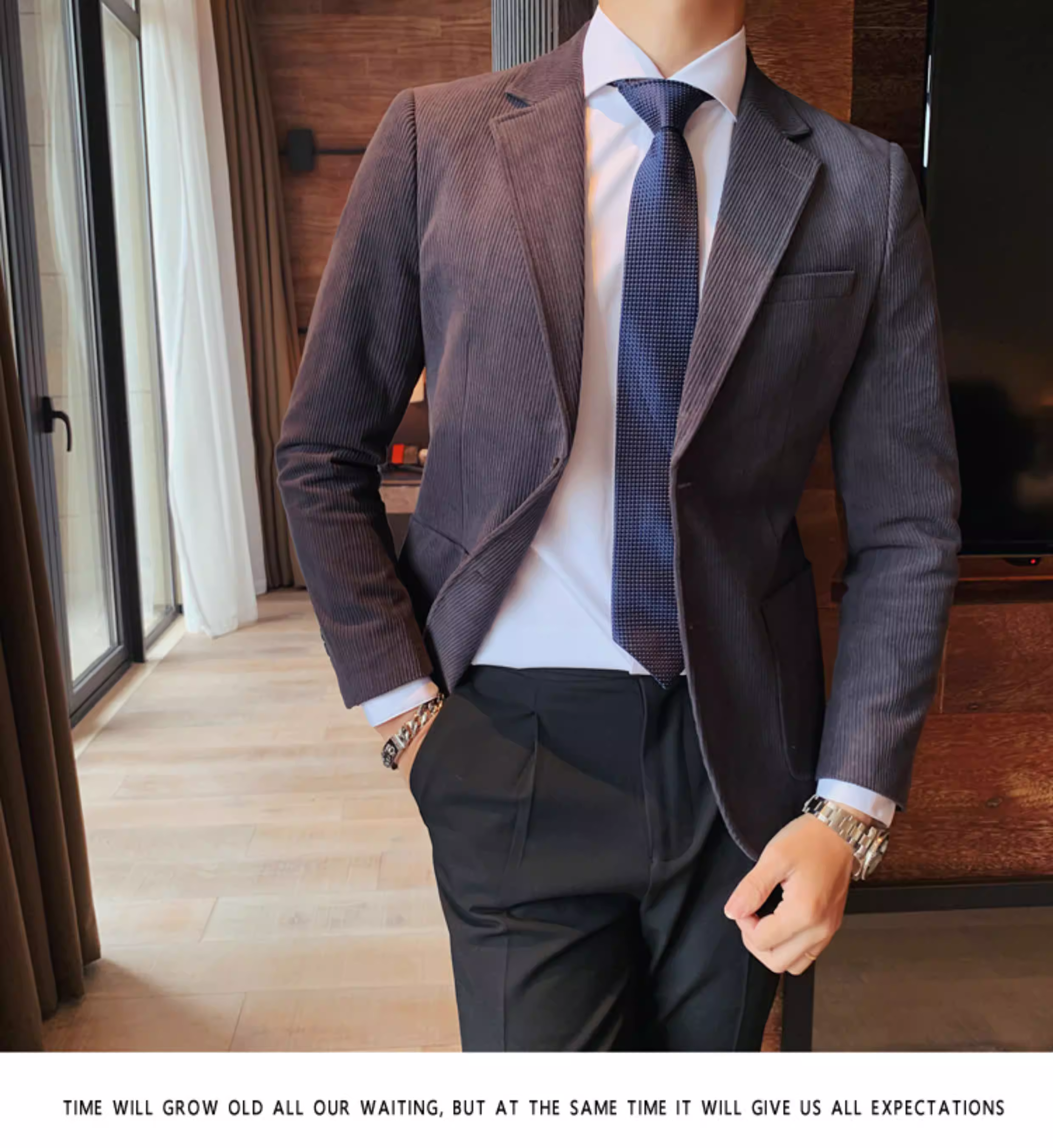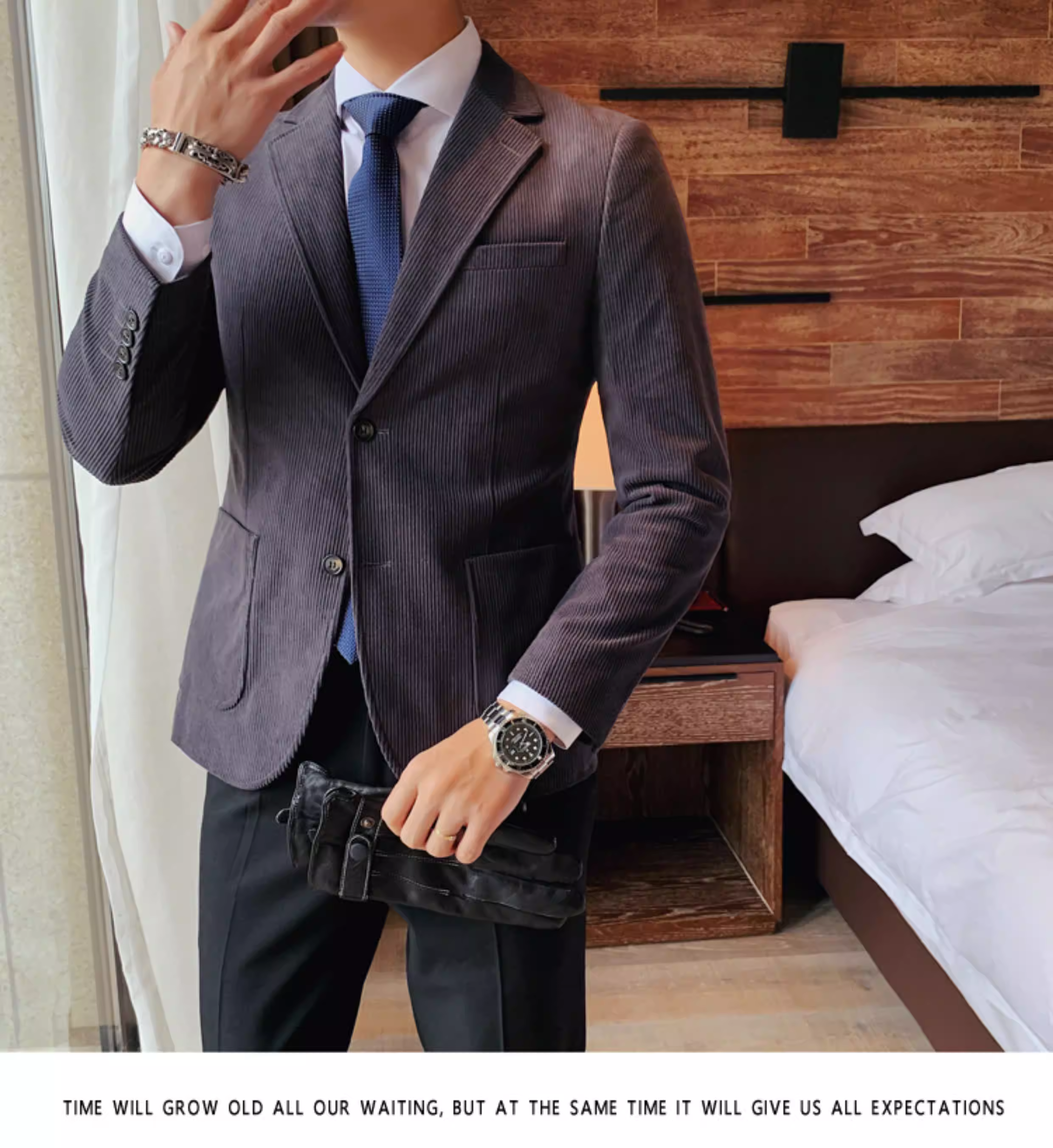 - Áo blazer nam chất liệu corduroy, mùa thu đông, dày dặn, thời trang, hợp xu hướng, kiểu dáng sọc cá tính, dáng ôm, đơn hàng khuy.