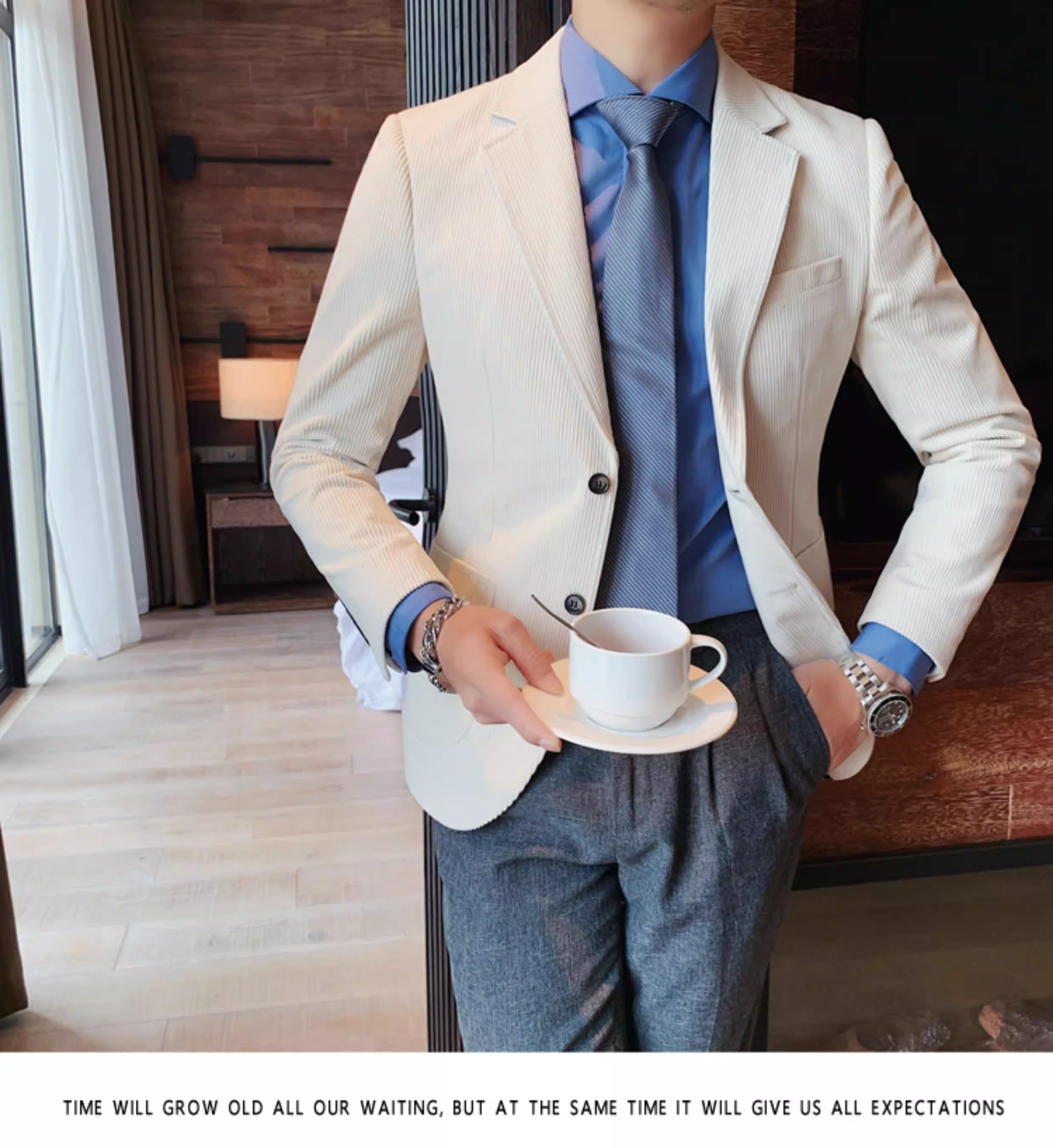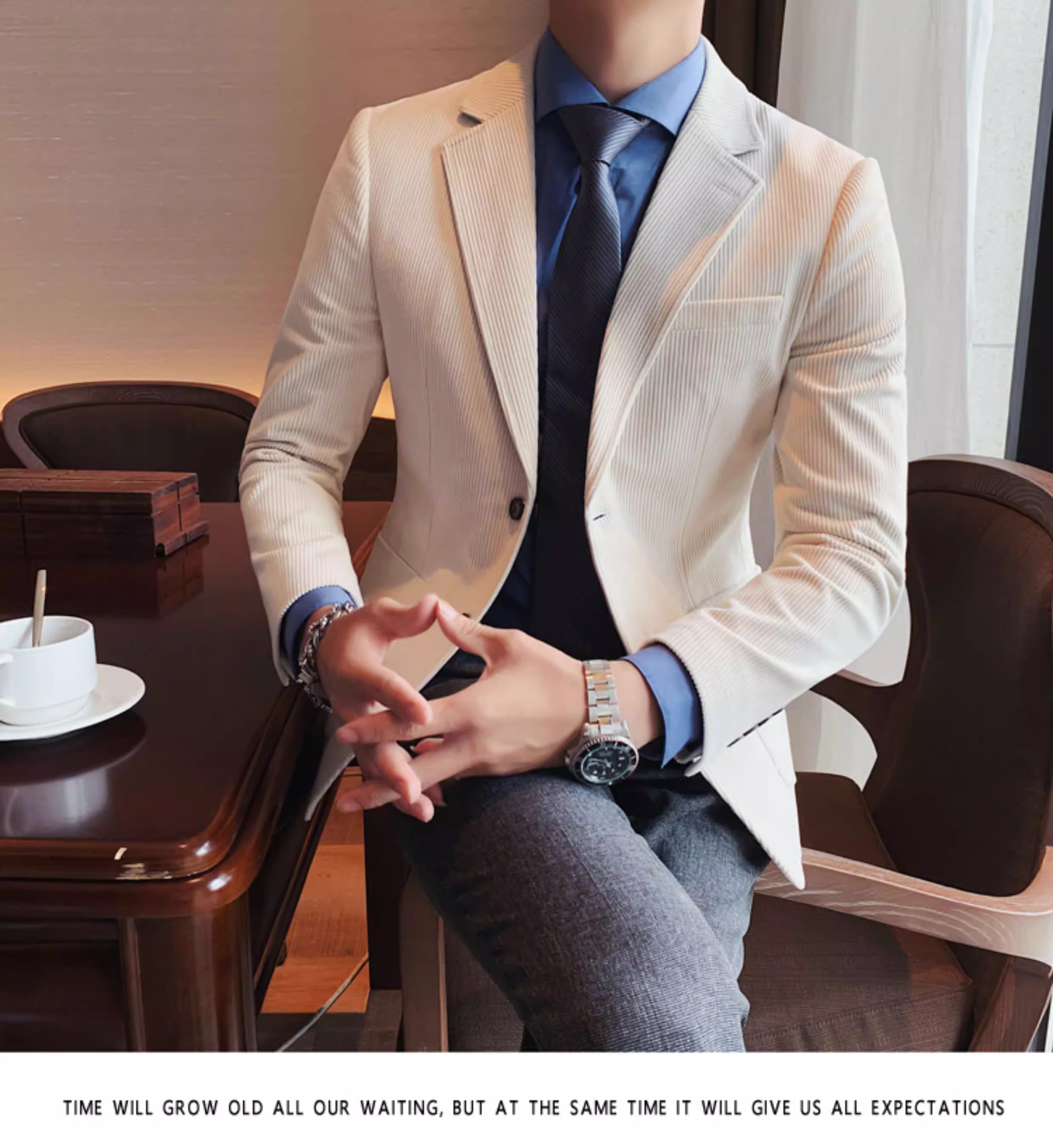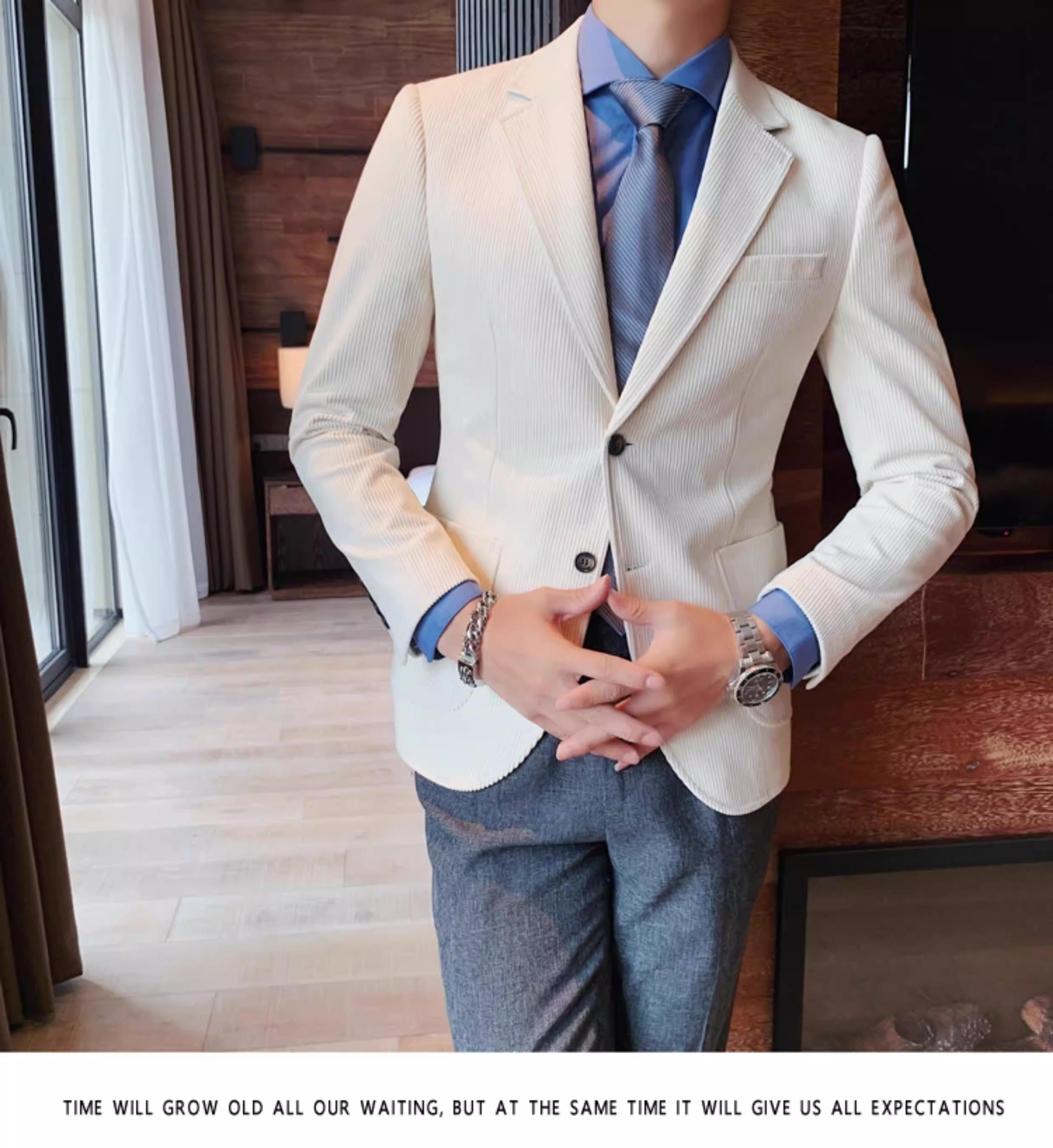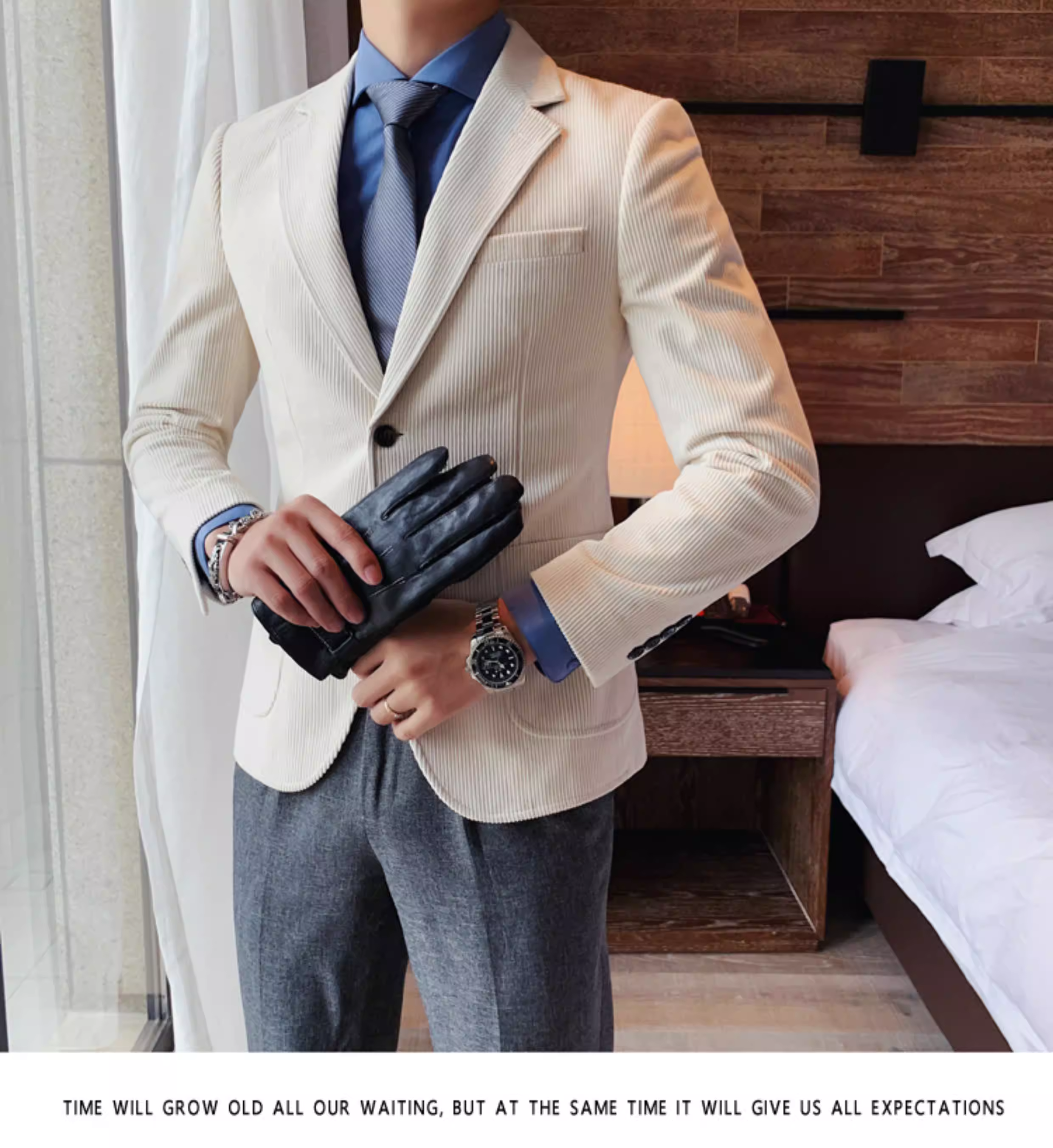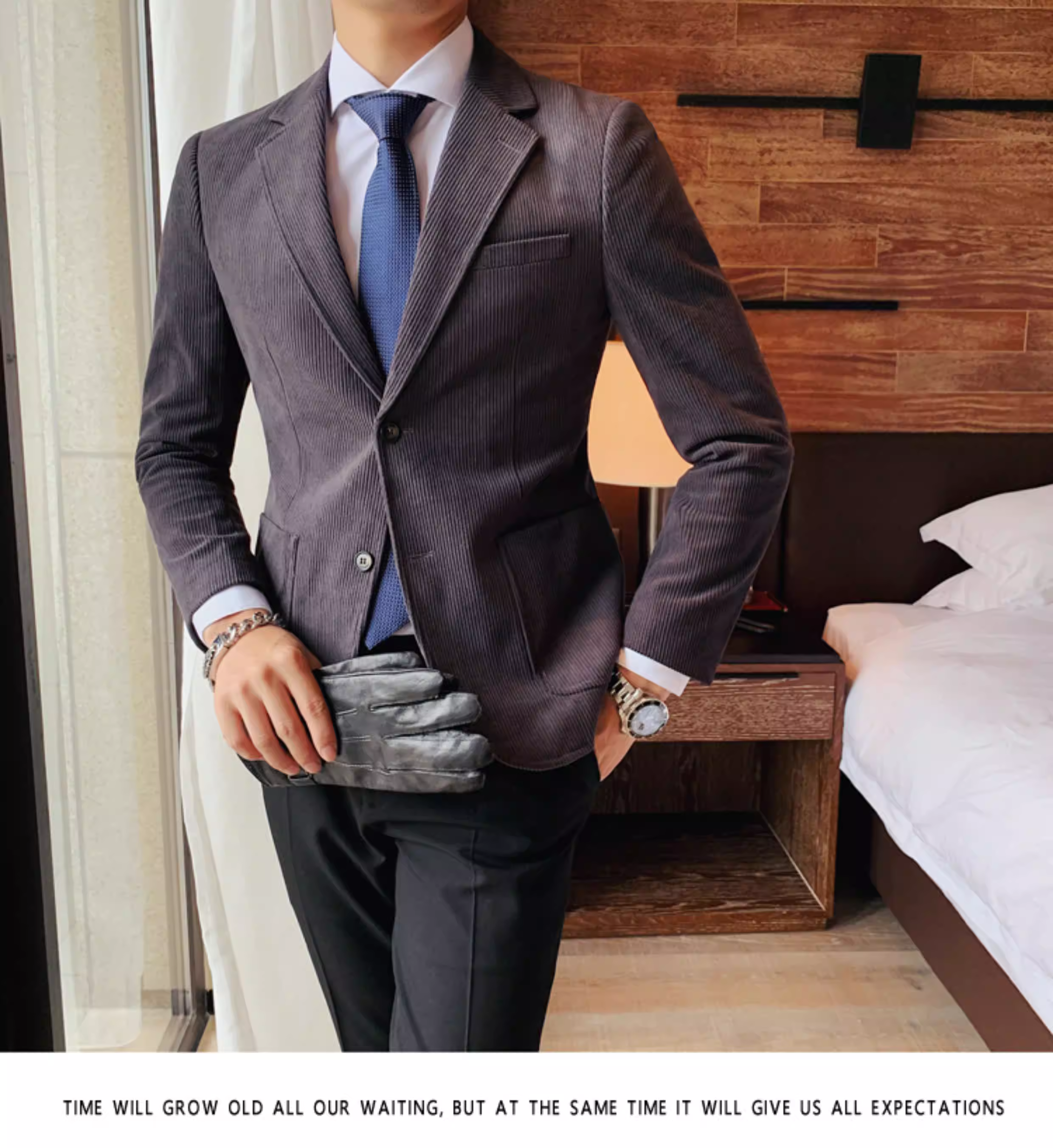 - Áo blazer nam chất liệu corduroy, mùa thu đông, dày dặn, thời trang, hợp xu hướng, kiểu dáng sọc cá tính, dáng ôm, đơn hàng khuy.