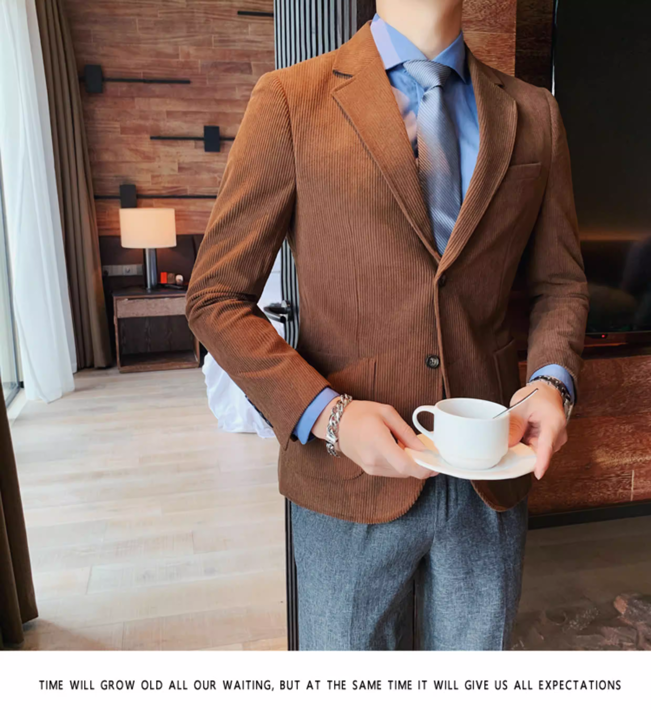 Áo blazer nam chất liệu corduroy, mùa thu đông, dày dặn, thời trang, hợp xu hướng, kiểu dáng sọc cá tính, dáng ôm, đơn hàng khuy.