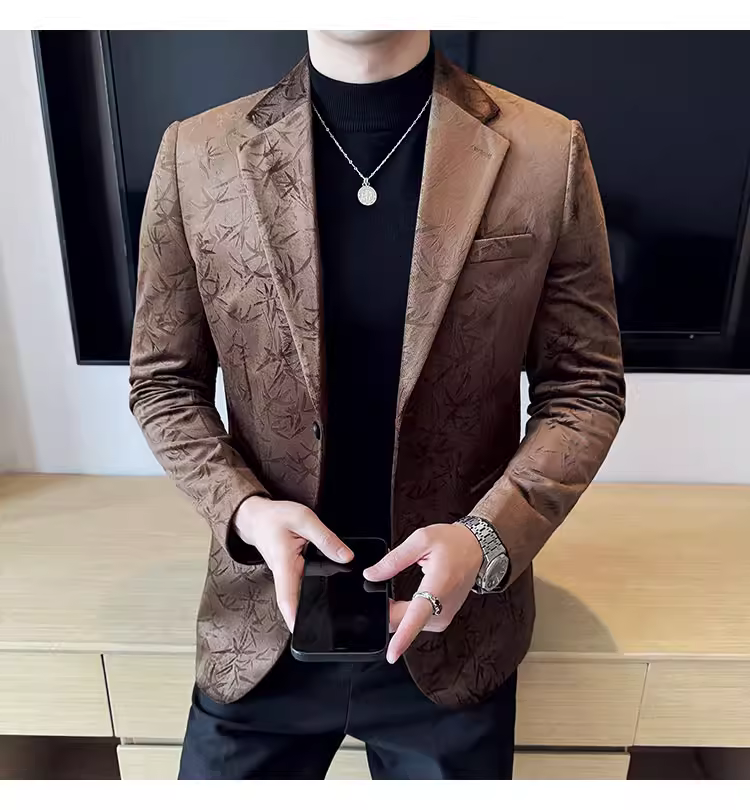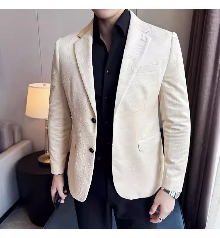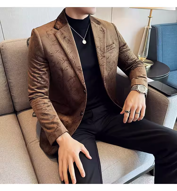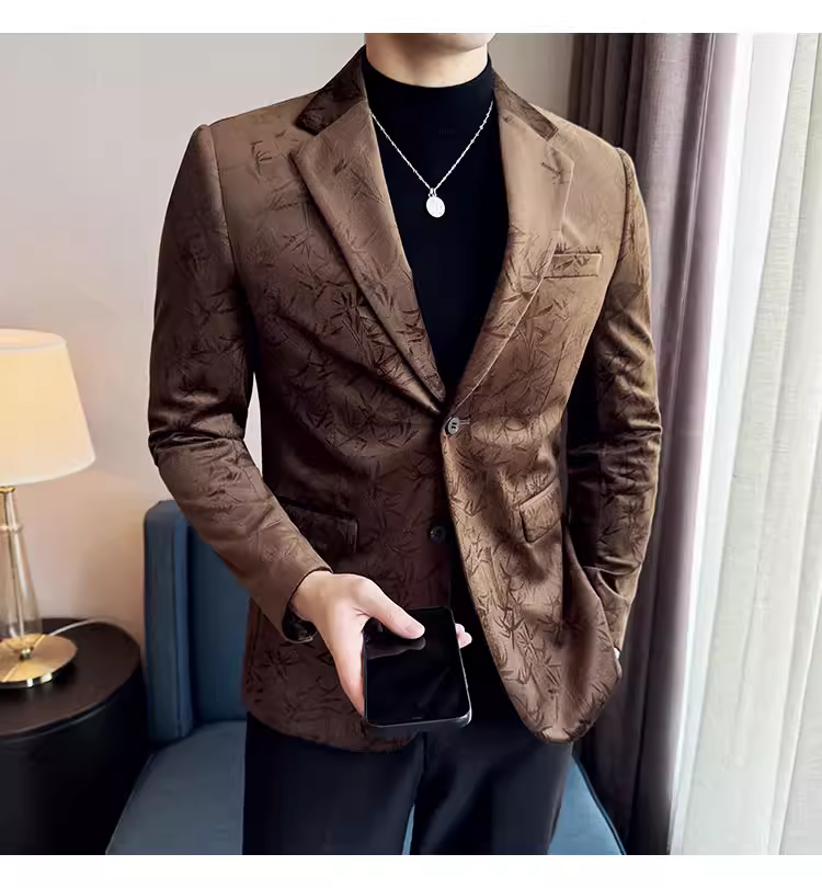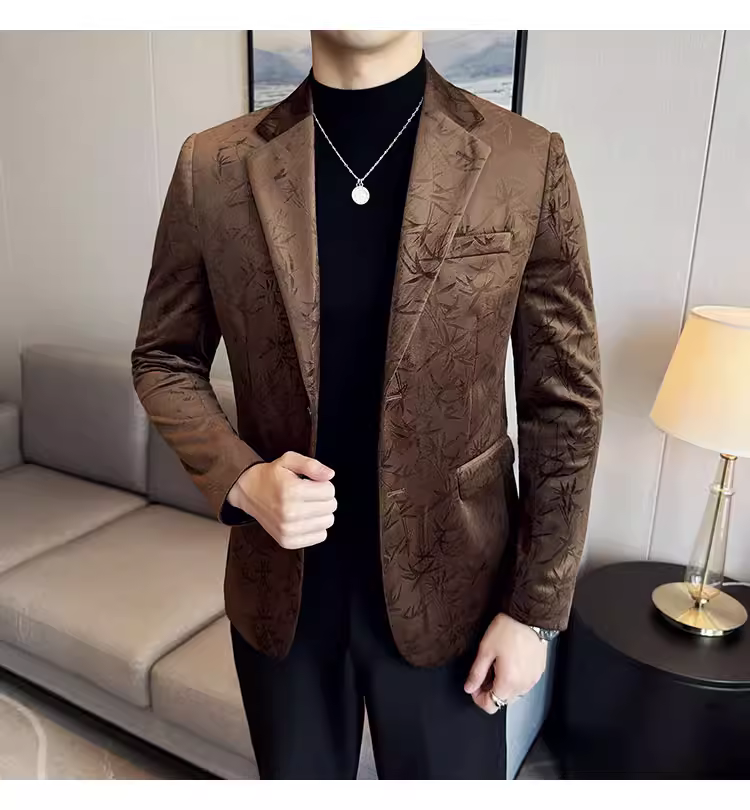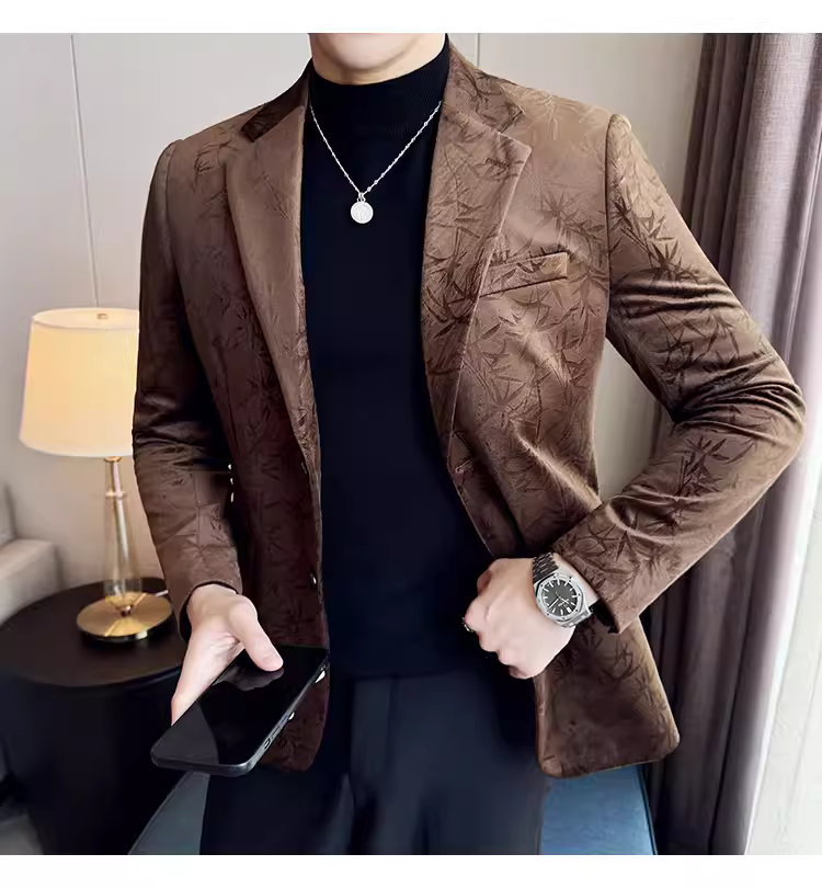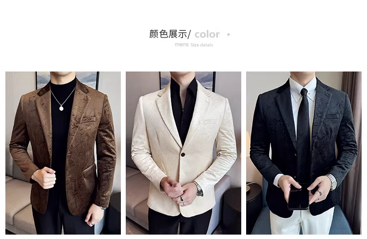 - Áo blazer nam chất liệu nhung jacquard, kiểu dáng mới xuân thu, phong cách công sở lịch lãm, đa năng, ôm dáng, thời trang cổ điển.