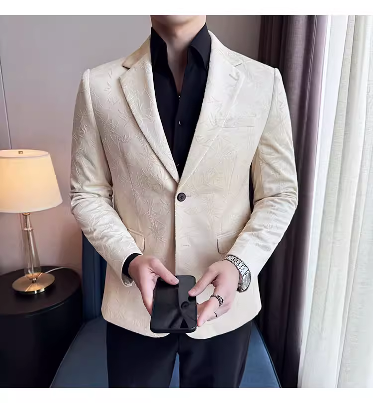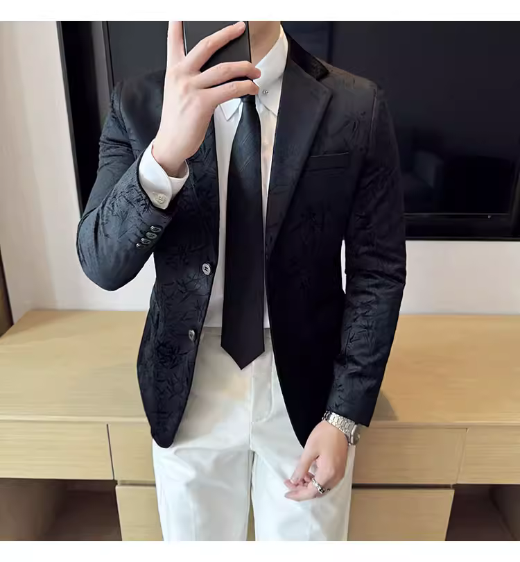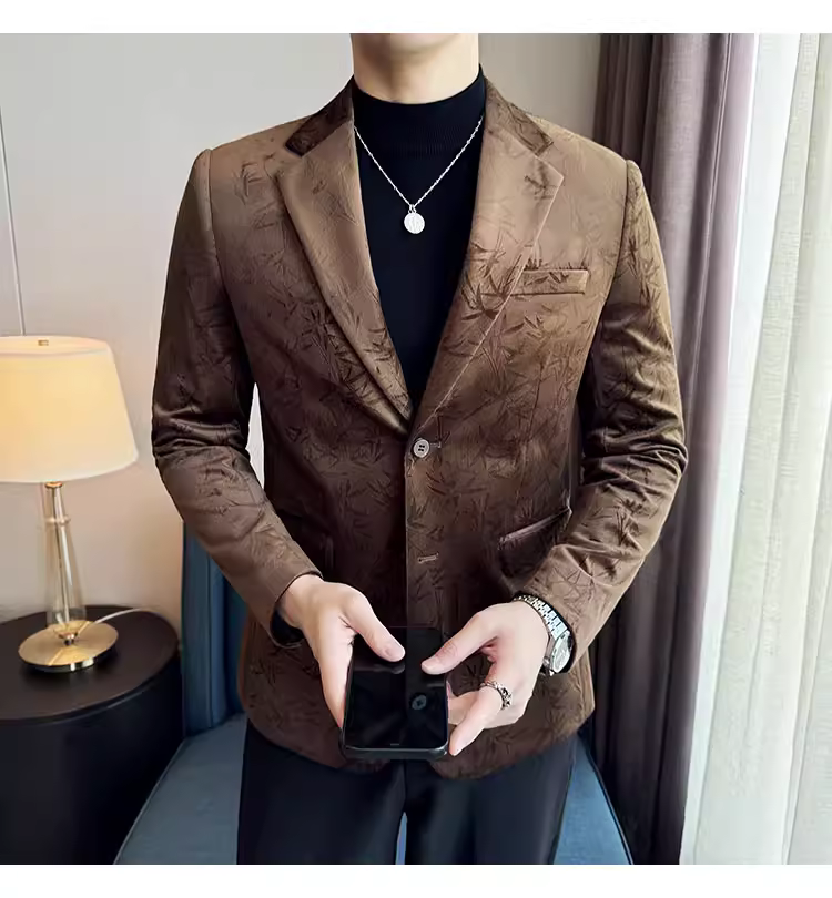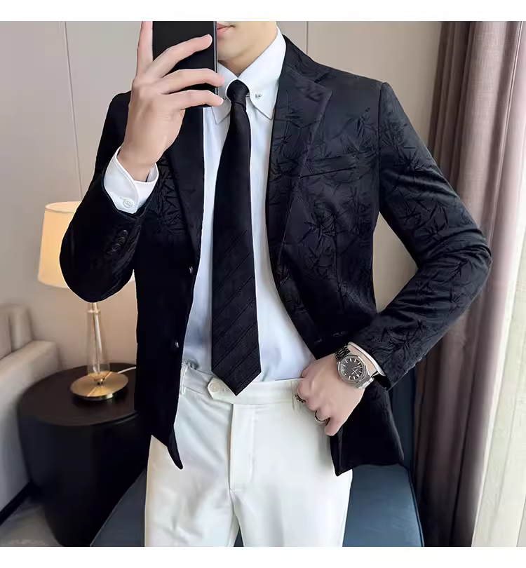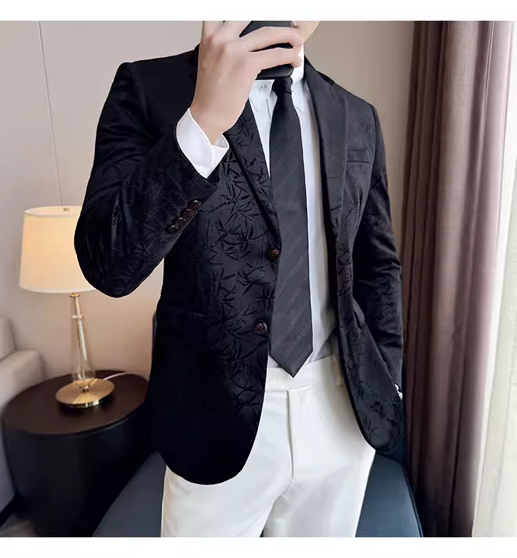 Áo blazer nam chất liệu nhung jacquard, kiểu dáng mới xuân thu, phong cách công sở lịch lãm, đa năng, ôm dáng, thời trang cổ điển.
