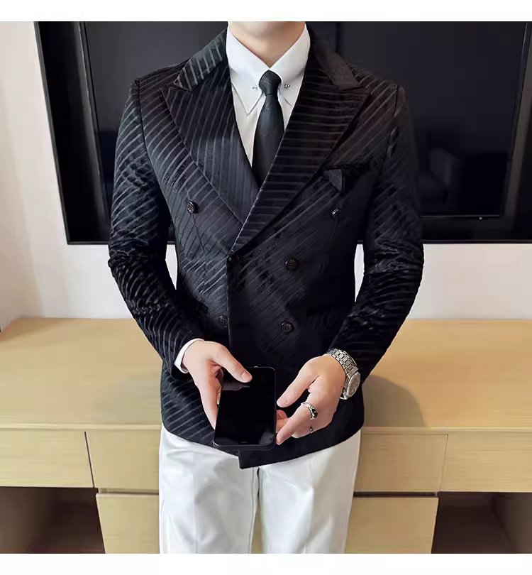 Áo blazer nam chất liệu vải tuýt nhung, dáng hai hàng khuy, kiểu dáng mới năm 2024, phong cách công sở lịch lãm, ôm dáng, cao cấp.