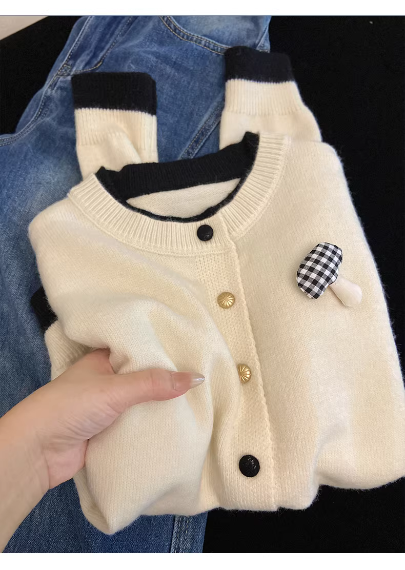 - Áo cardigan dệt kim cổ tròn phối màu xám La Chapelle dành cho nữ 2025 áo khoác len phong cách Hàn Quốc mới mùa thu đông