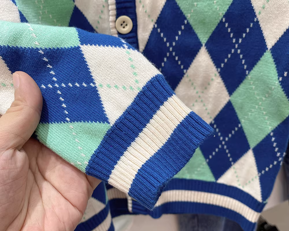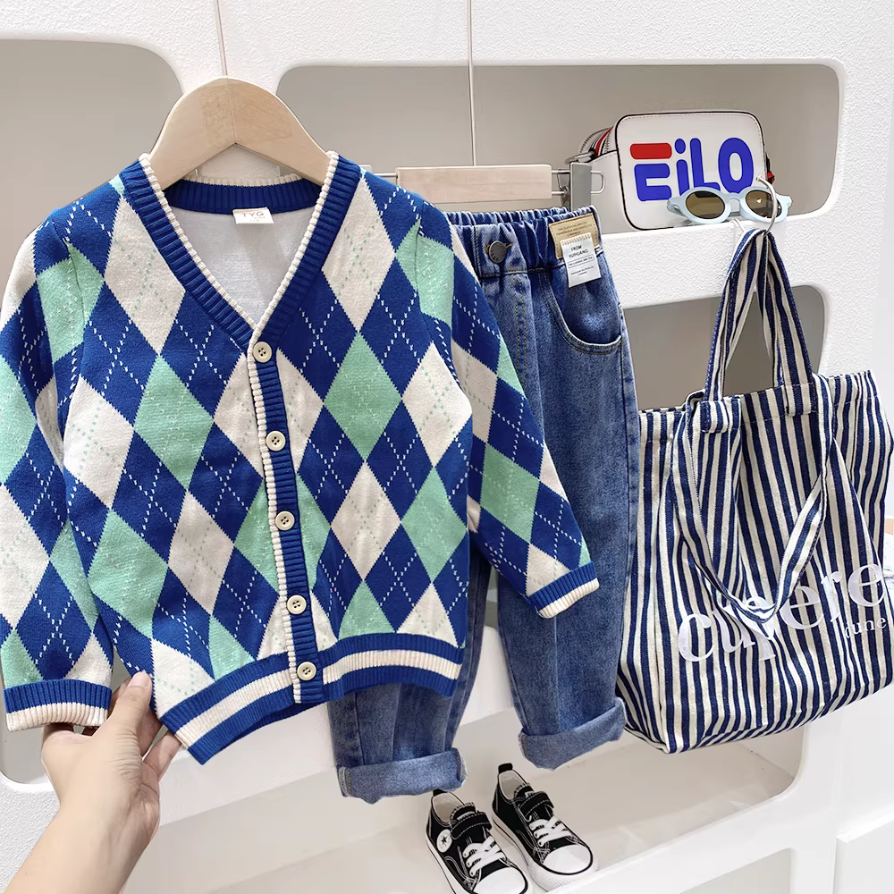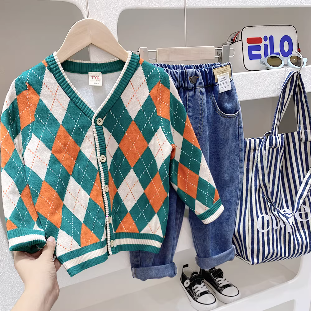 - Áo cardigan họa tiết kim cương cho bé trai Quần áo trẻ em phong cách Âu Mỹ 2025 Áo khoác cổ điển mùa xuân đông trẻ em Áo dệt kim cổ chữ V bằng cotton mở phía trước
