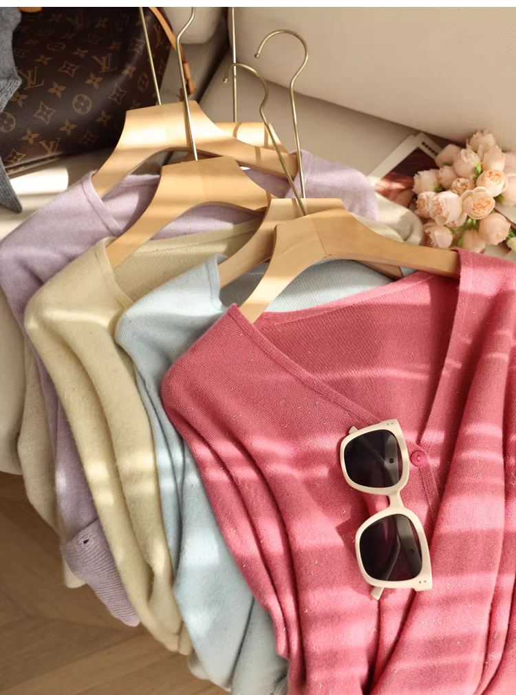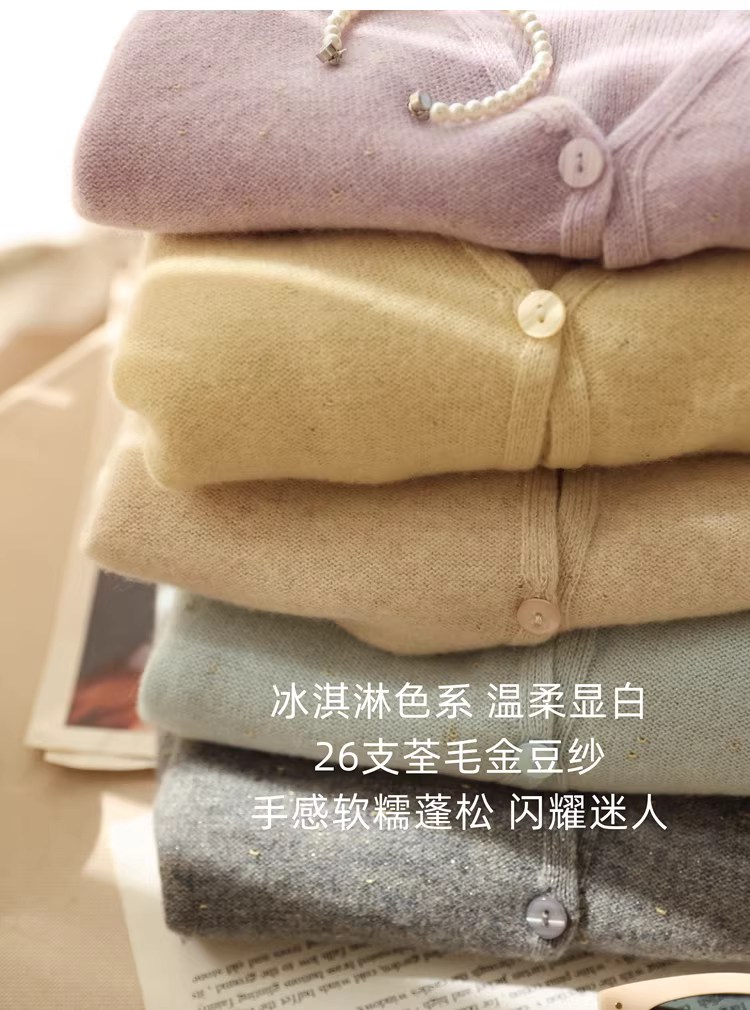 Áo cardigan len dệt kim len merino nguyên chất cổ chữ V kiểu Pháp, chất liệu sợi vàng óng ánh lãng mạn, mới cho mùa thu dành cho nữ