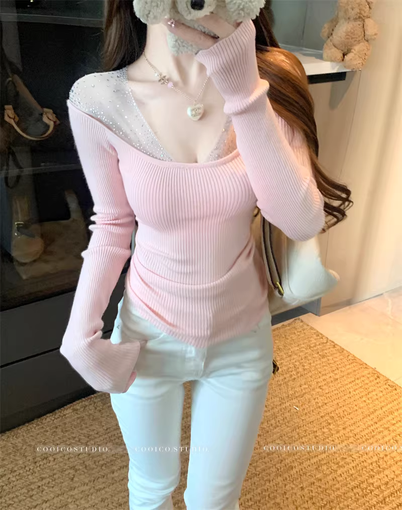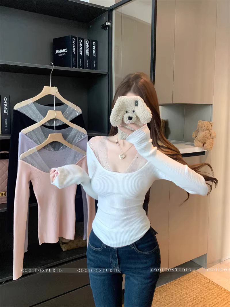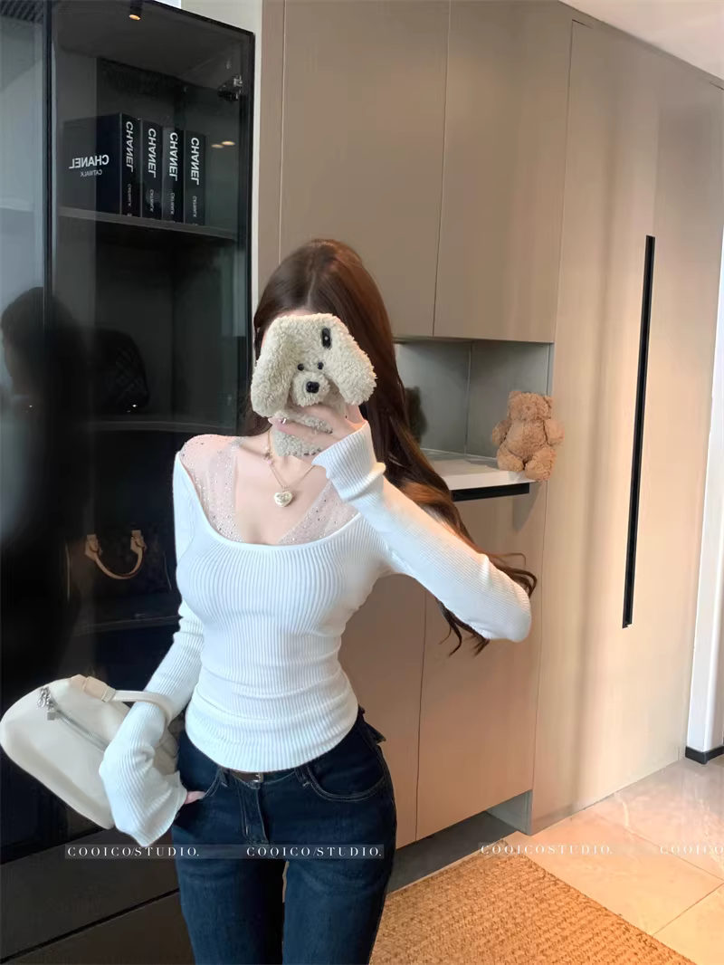 - Áo dệt kim cổ chữ V giả hai mảnh dành cho nữ, áo sơ mi dài tay mùa xuân thu, cổ áo cực thấp gợi cảm, áo mềm mại và xù xì.