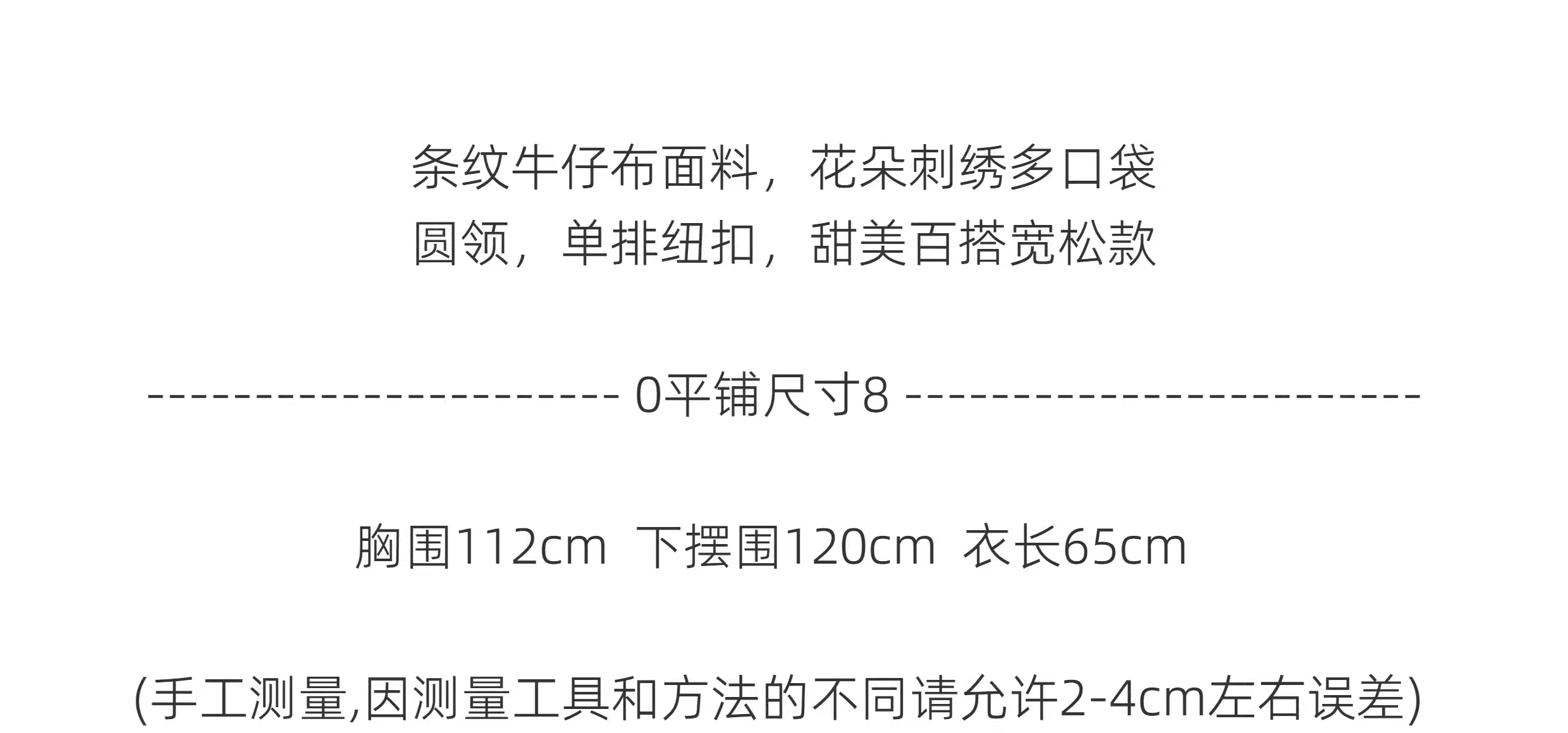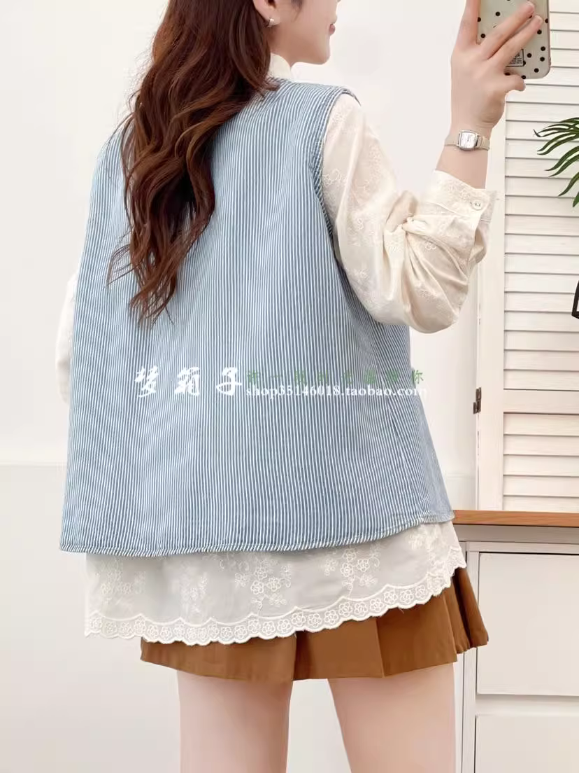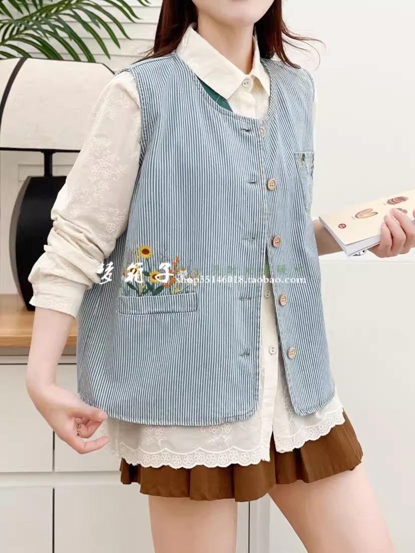 - Áo gile denim kẻ sọc cổ tròn có túi thêu hoa mùa thu mới Dream Box 2025 dành cho nữ