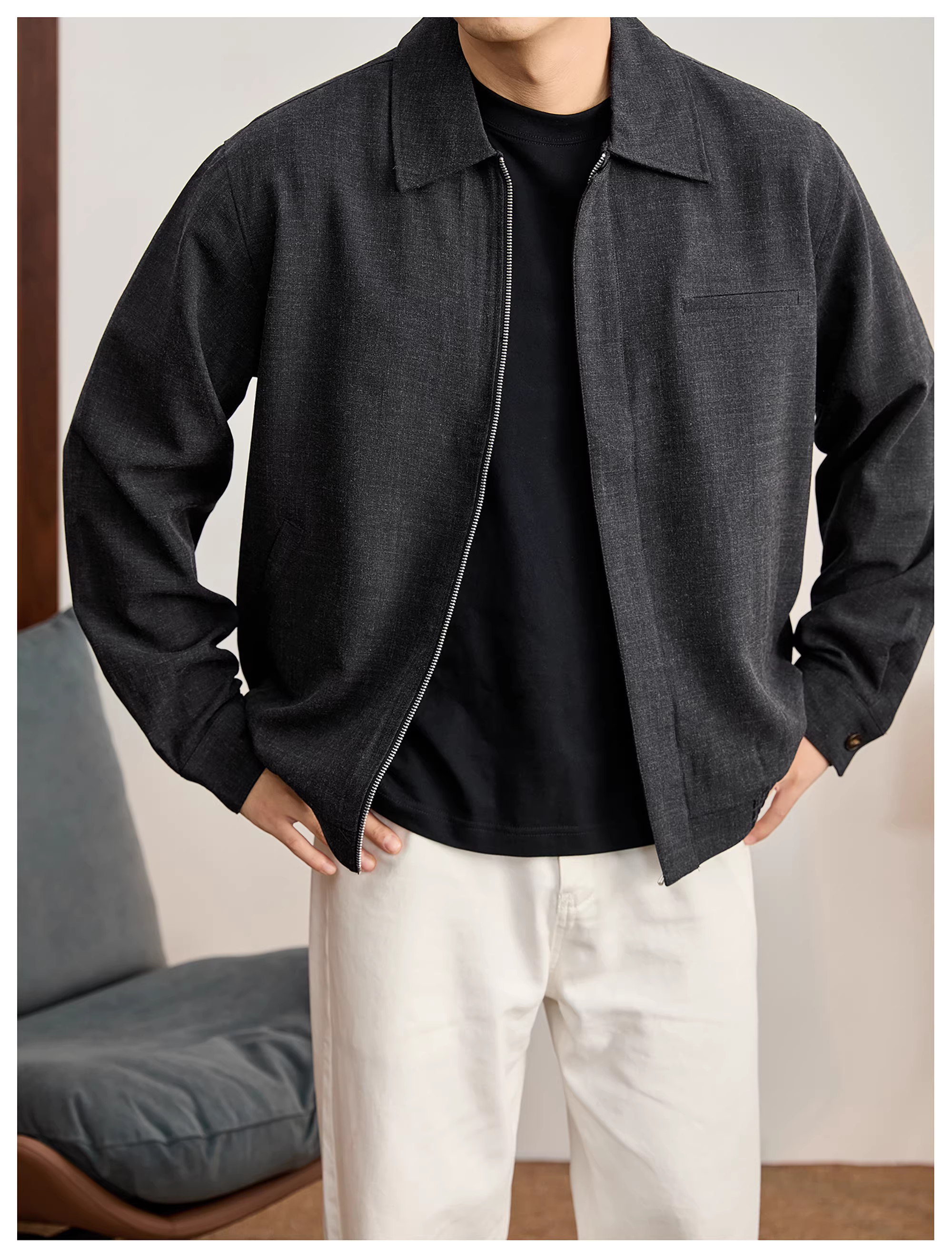 Áo khoác bomber nam kiểu dáng cổ điển màu nâu, chất liệu da lộn, mùa thu đông, dáng ngắn, ve rộng, khóa kéo.