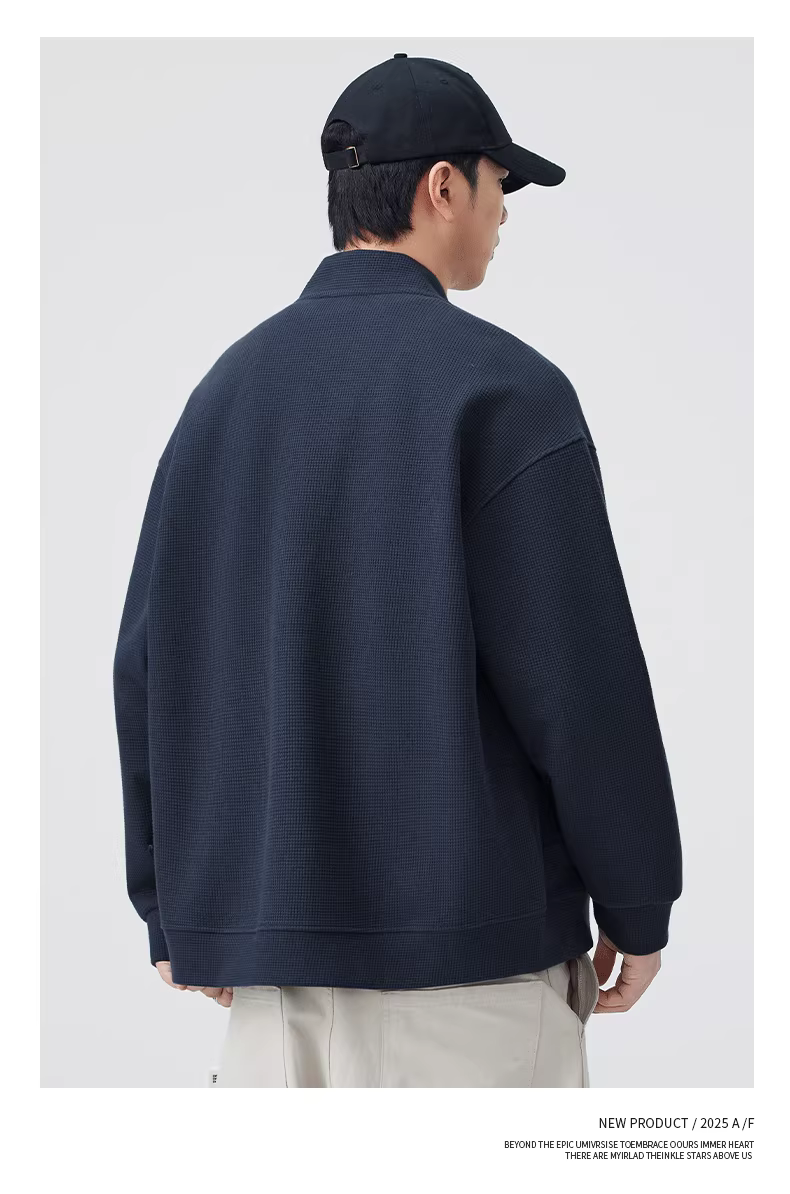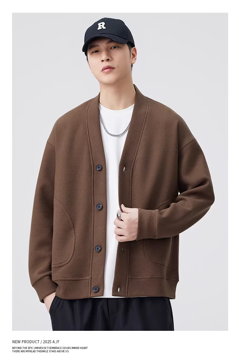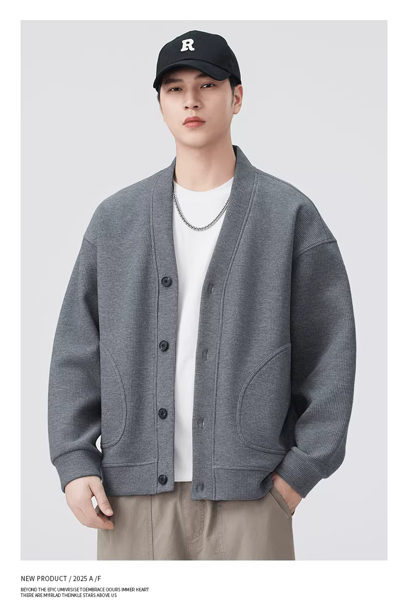 - Áo khoác cardigan waffle hạng nặng 470G dành cho nam, kiểu dáng mùa thu phong cách Mỹ, dáng rộng, áo khoác cổ V phong cách lười cao cấp