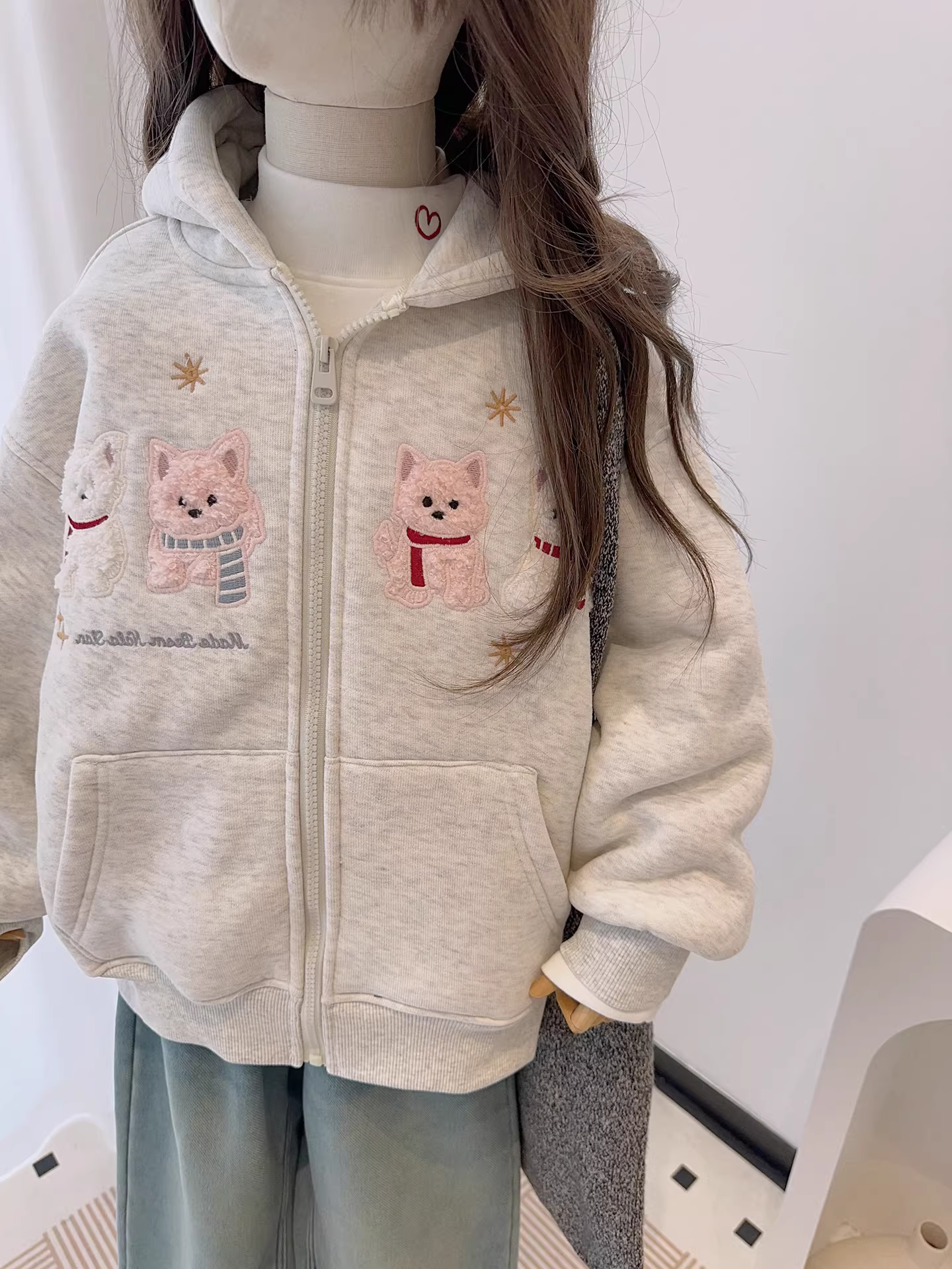 Áo khoác có mũ trùm đầu lót lông cừu mùa thu đông dành cho bé trai và bé gái, áo len có khóa kéo thêu hình chú chó con, lót lông cừu và dày dặn, kiểu dáng giản dị và rộng rãi.