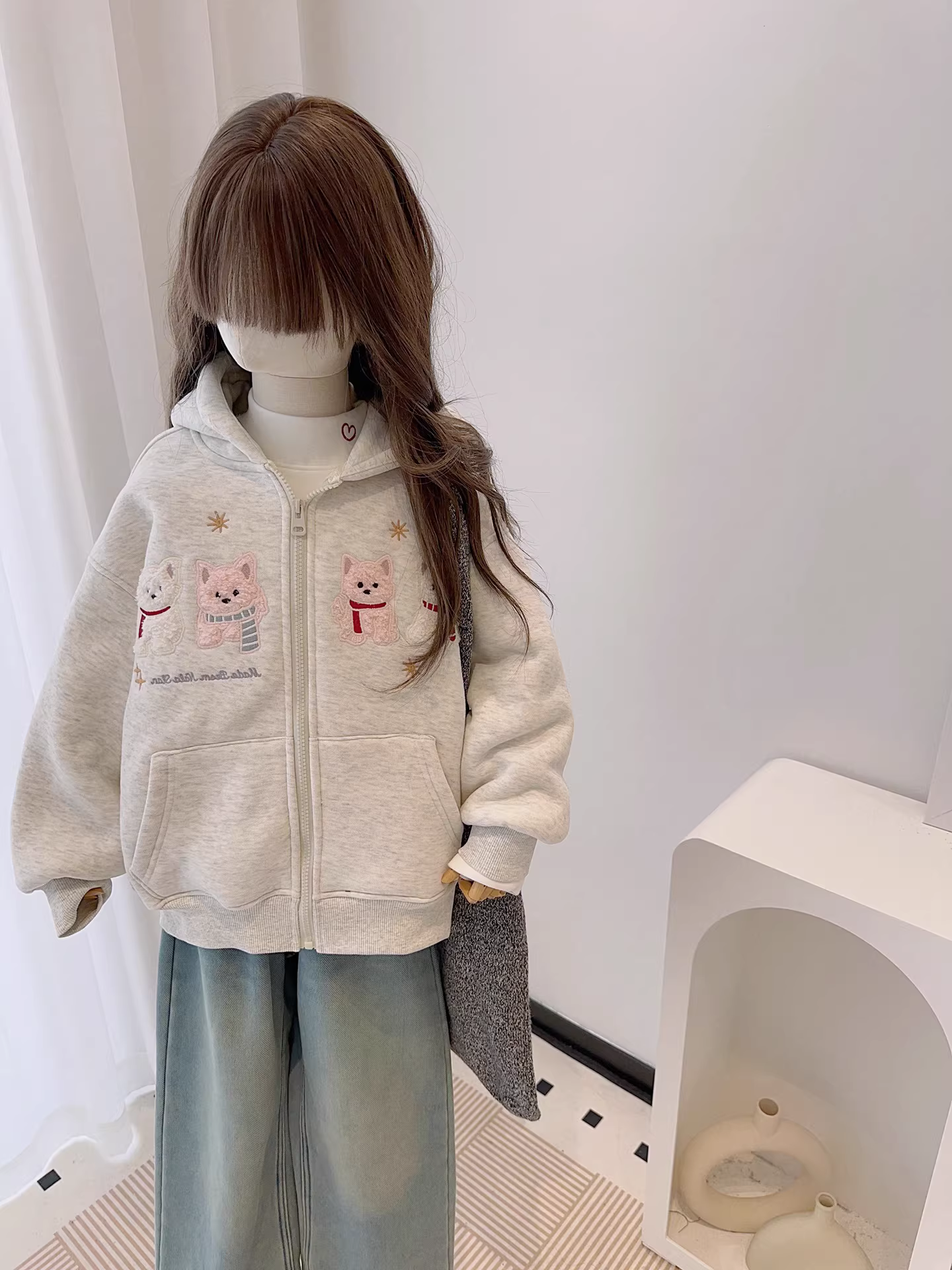 - Áo khoác có mũ trùm đầu lót lông cừu mùa thu đông dành cho bé trai và bé gái, áo len có khóa kéo thêu hình chú chó con, lót lông cừu và dày dặn, kiểu dáng giản dị và rộng rãi.