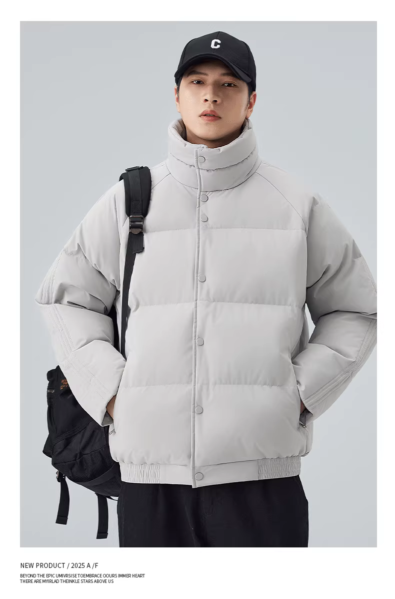 Áo khoác cotton cổ đứng kiểu Mỹ dành cho nam, áo khoác dày dặn ấm áp mùa đông, áo khoác cotton dày màu trơn, dáng rộng.
