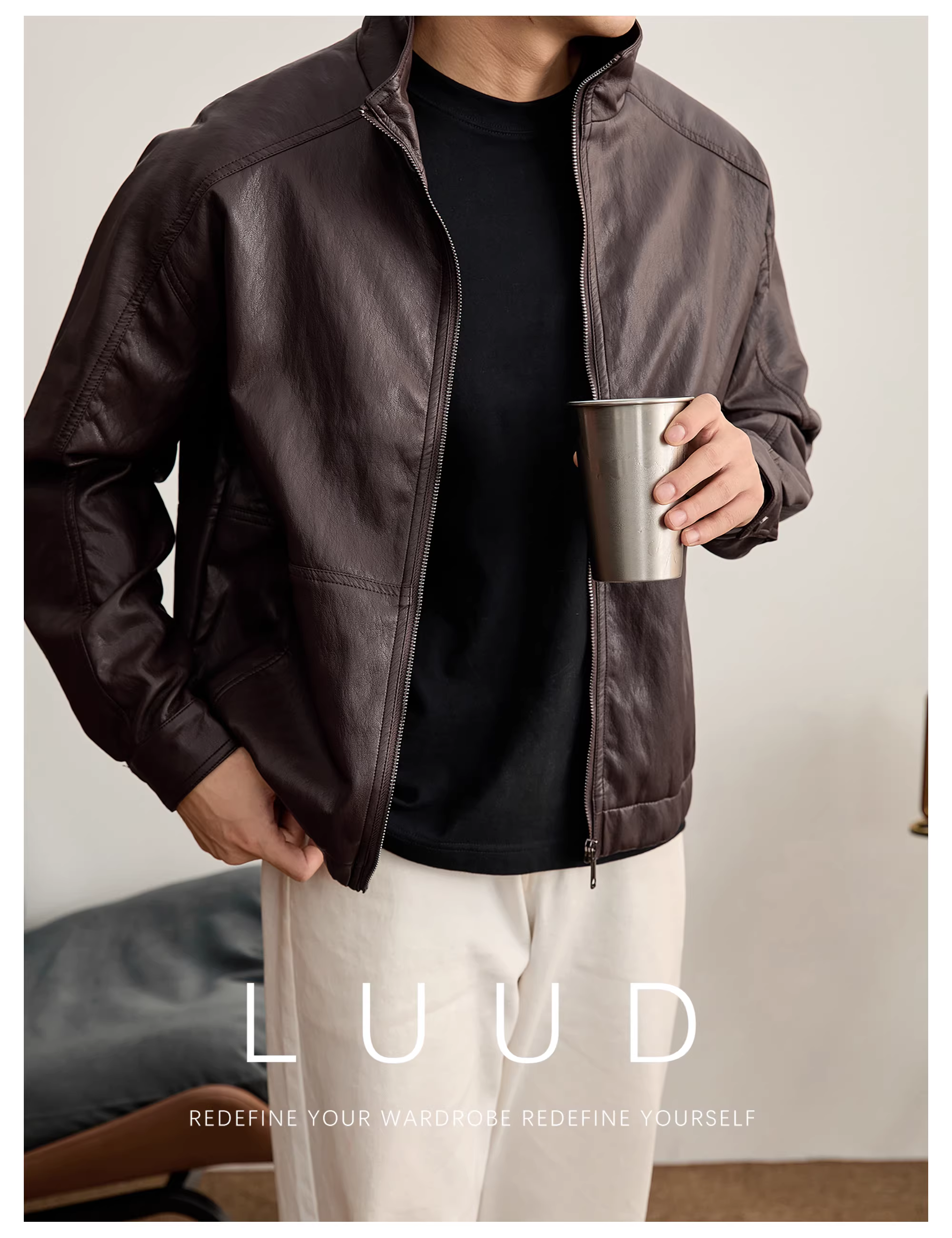 - Áo khoác da cổ đứng dáng ngắn LUUD Melard dành cho nam mùa đông, chất liệu da PU bóng, kiểu dáng biker.