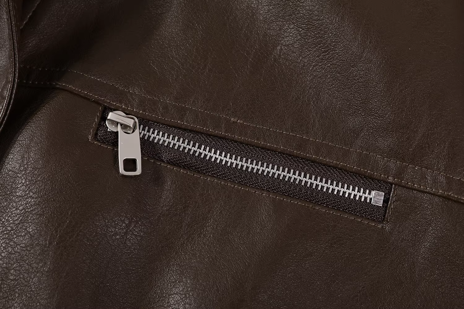 Áo khoác da cổ đứng màu nâu retro Maillard dành cho nữ trong mùa thu đông, áo khoác len cừu dài vừa phải cao cấp kiểu Mỹ