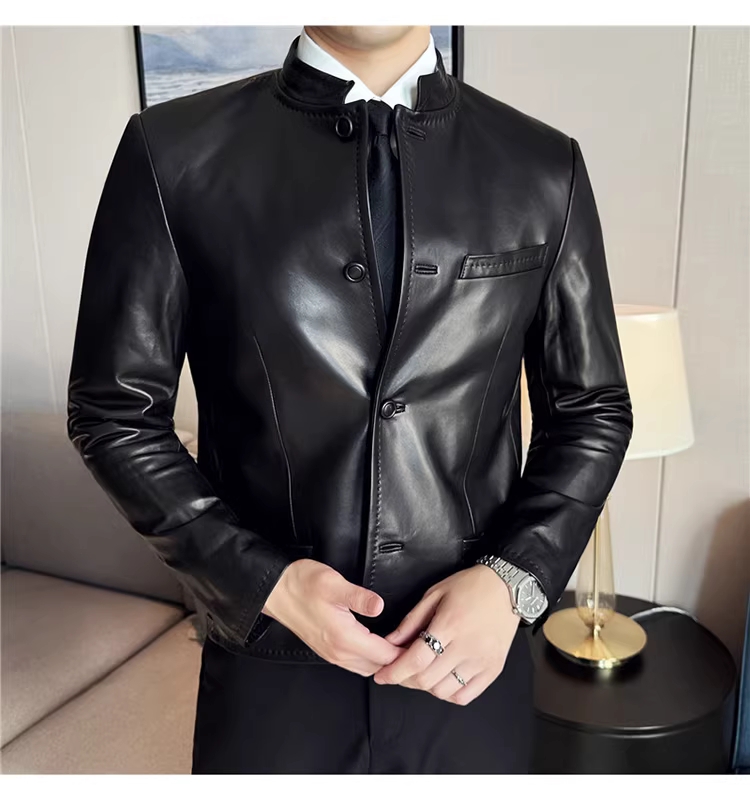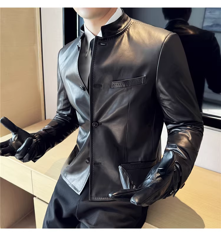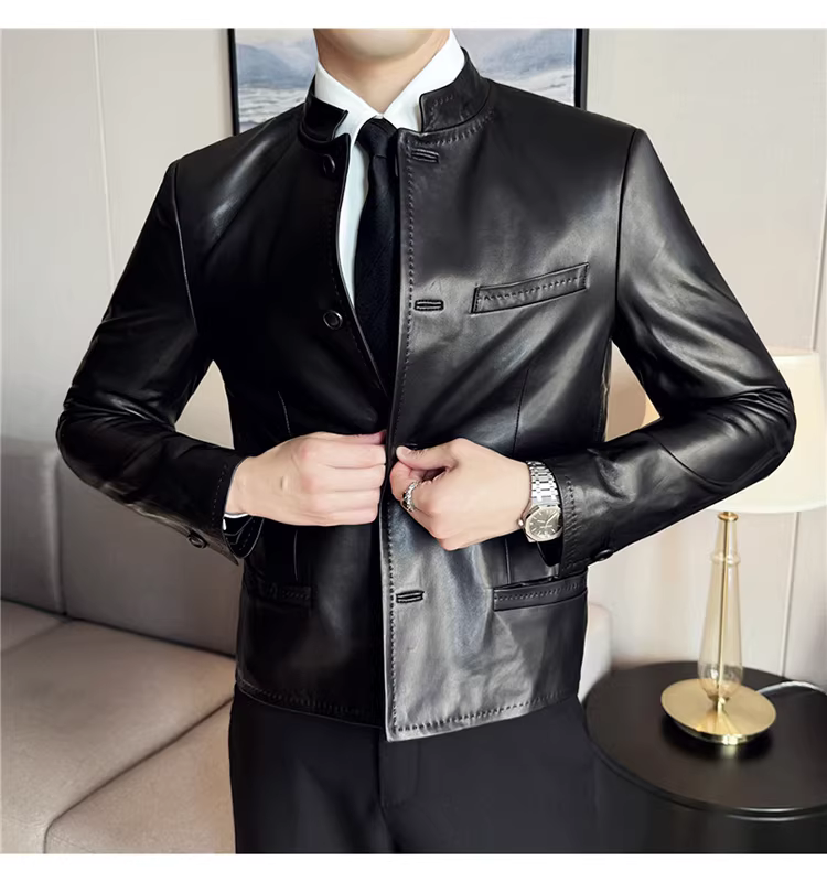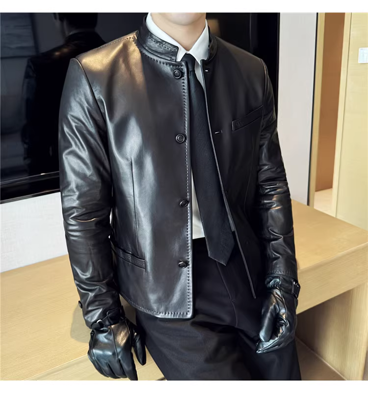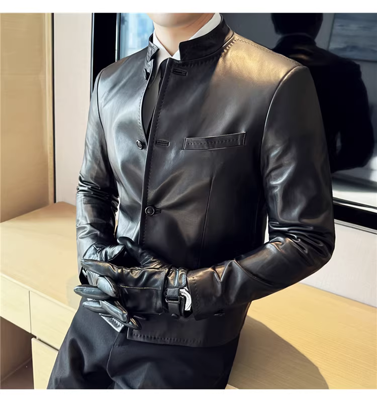 - Áo khoác da kiểu Trung Quốc cổ đứng dành cho nam, mẫu mới mùa thu 2024, áo khoác ngắn PU cao cấp ôm dáng