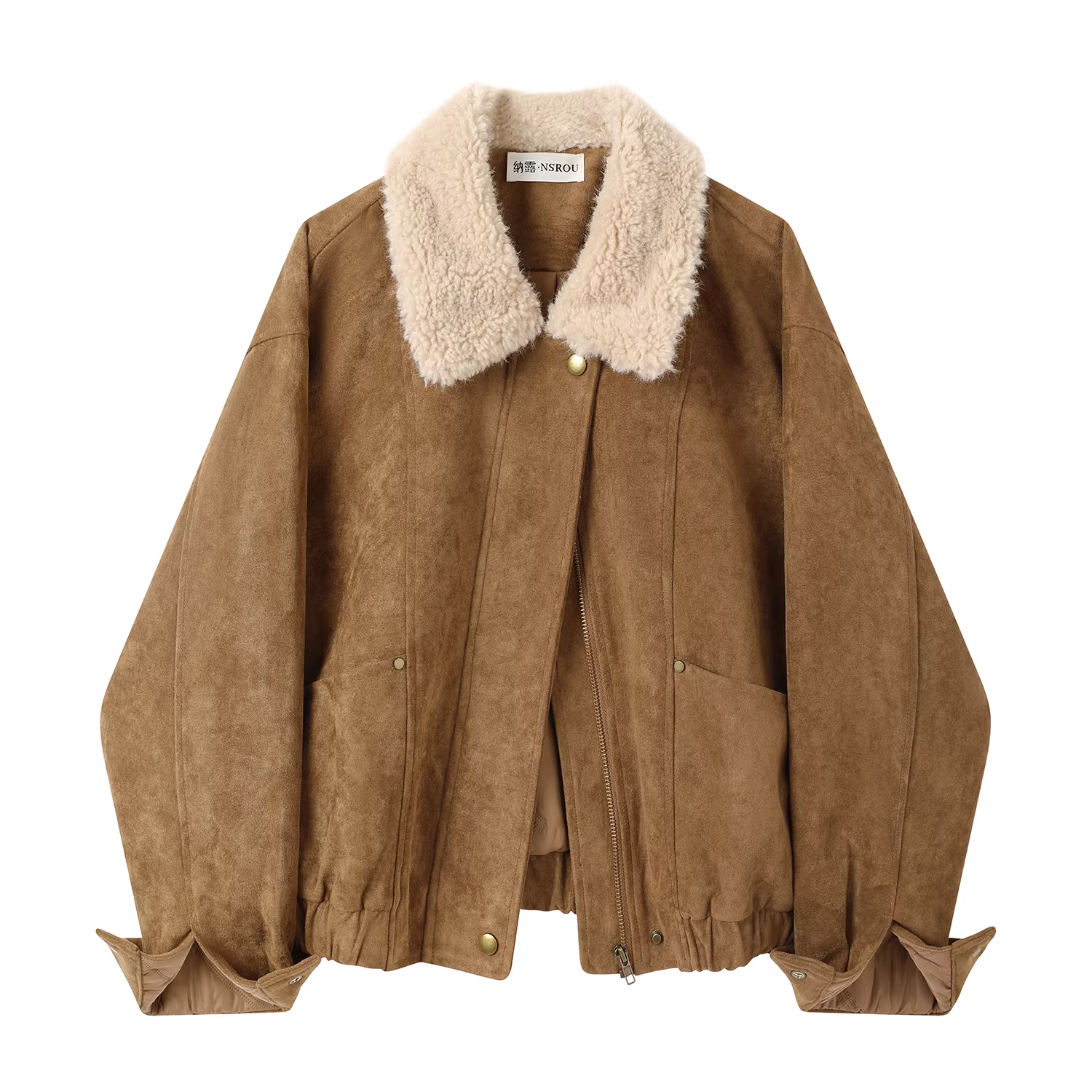 - Áo khoác da lộn cổ lông cừu kiểu cổ điển, áo khoác da ngắn nữ mùa thu đông màu nâu, kiểu dáng ôm dáng