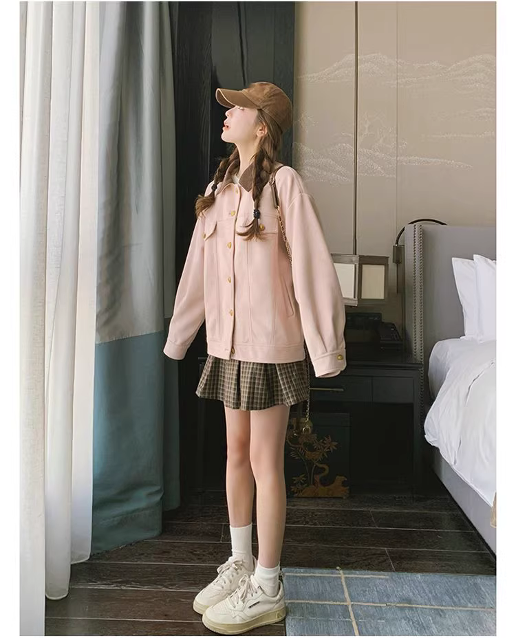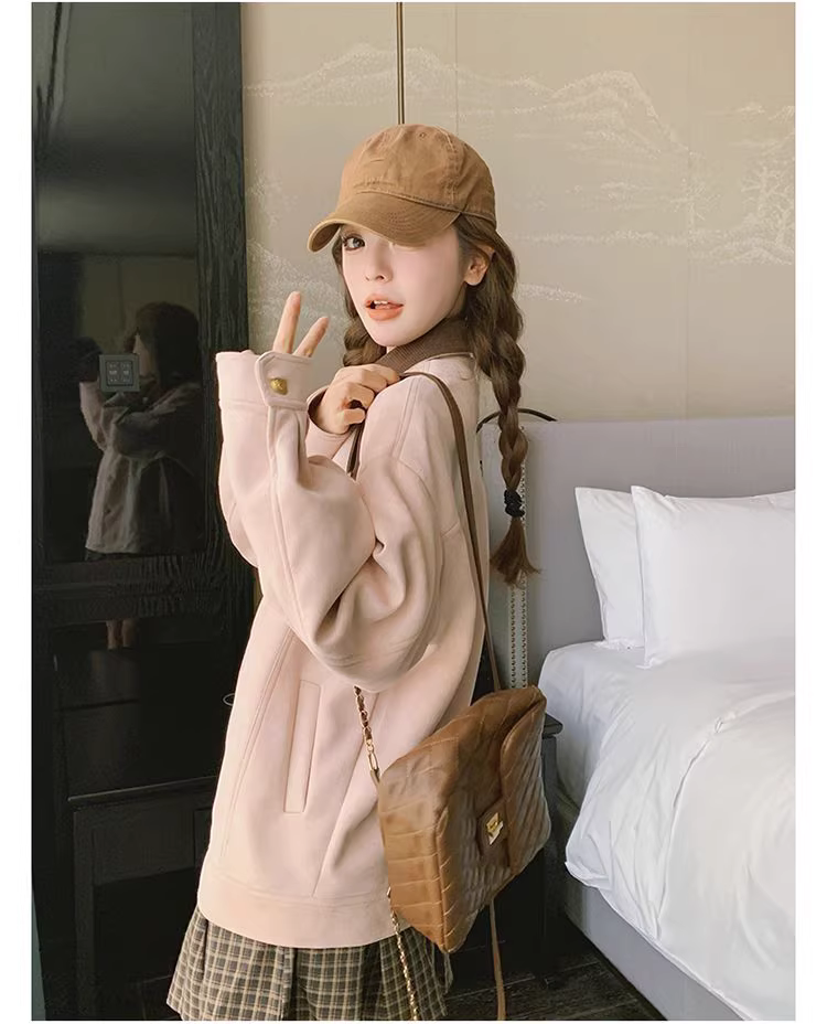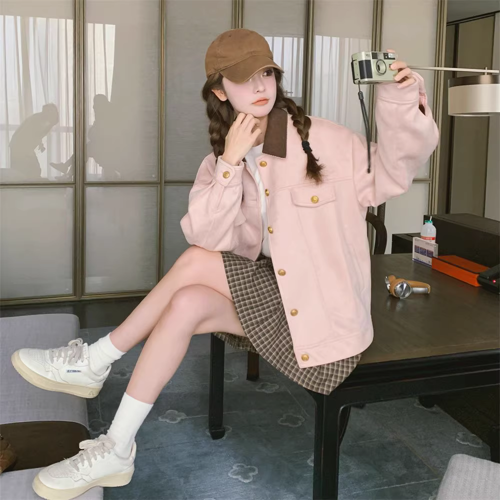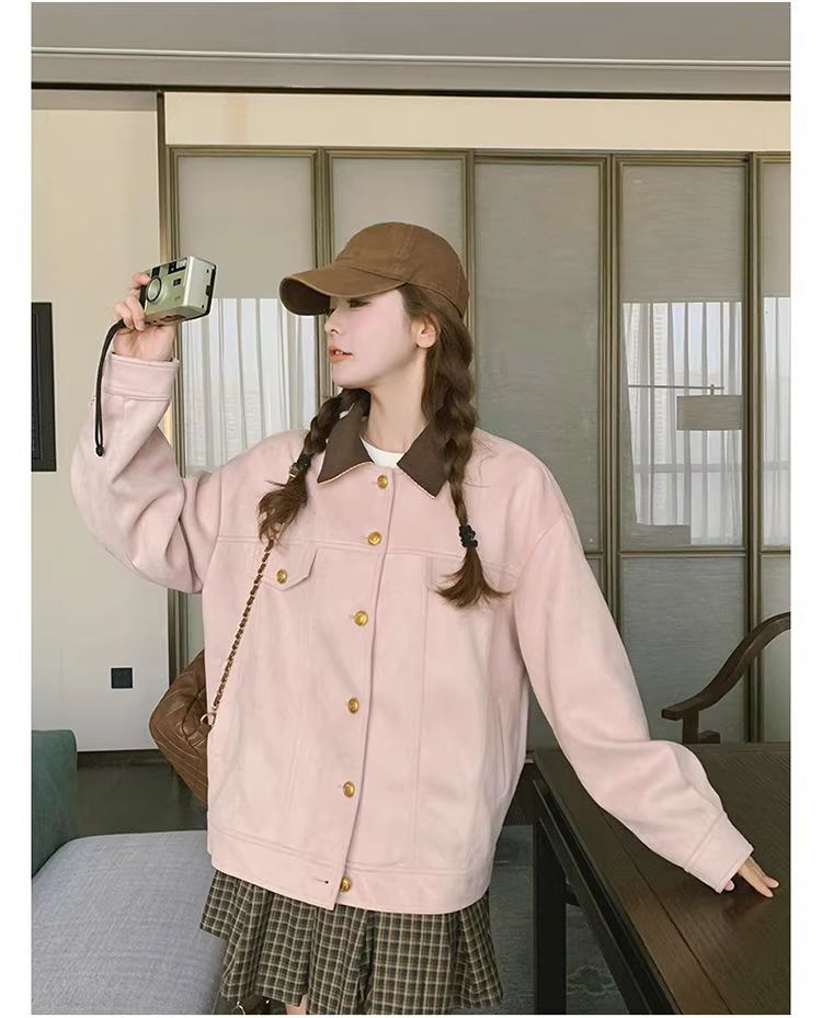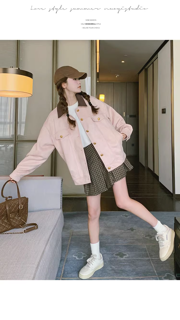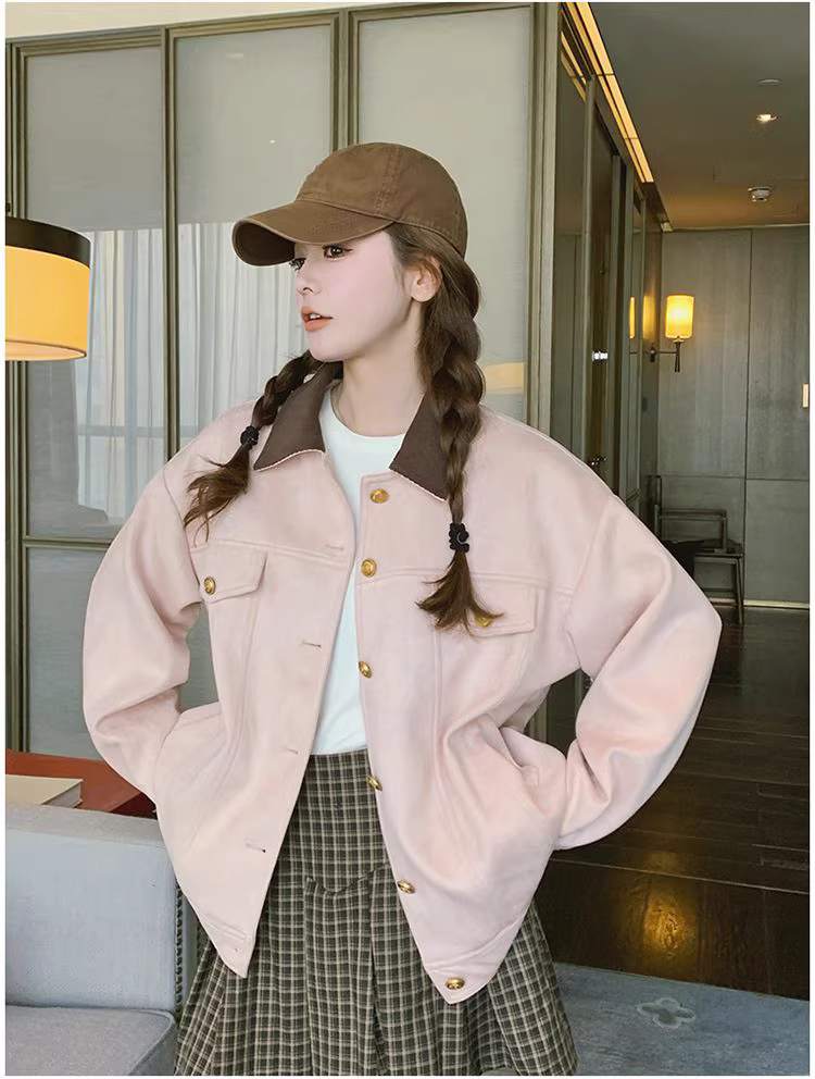 Áo khoác da lộn màu hồng La Chapelle dành cho nữ, kiểu mới thu đông 2025, áo khoác dáng rộng, size nhỏ