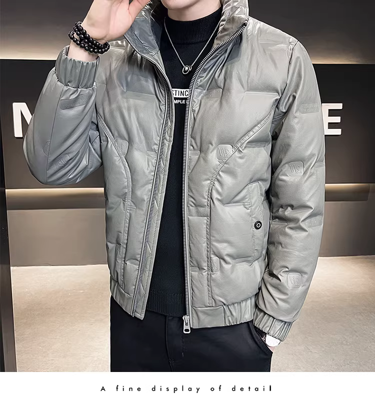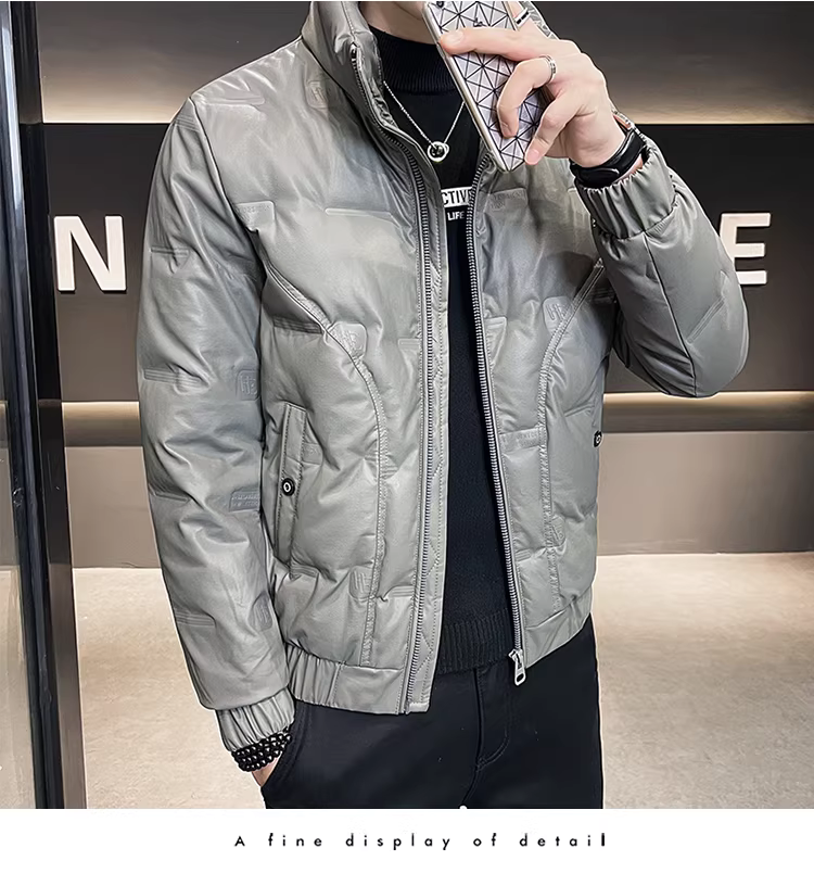 Áo khoác da PU cổ đứng dành cho nam, mùa đông 2024, kiểu dáng mới thời thượng, cao cấp, ngắn, nhẹ, ấm áp