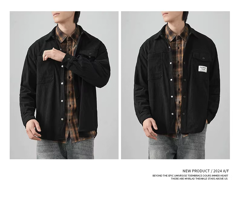 - Áo khoác dài tay bằng vải nhung dày dành cho nam, mùa xuân và mùa thu, cao cấp, mát mẻ và cổ điển, có ve áo và túi.