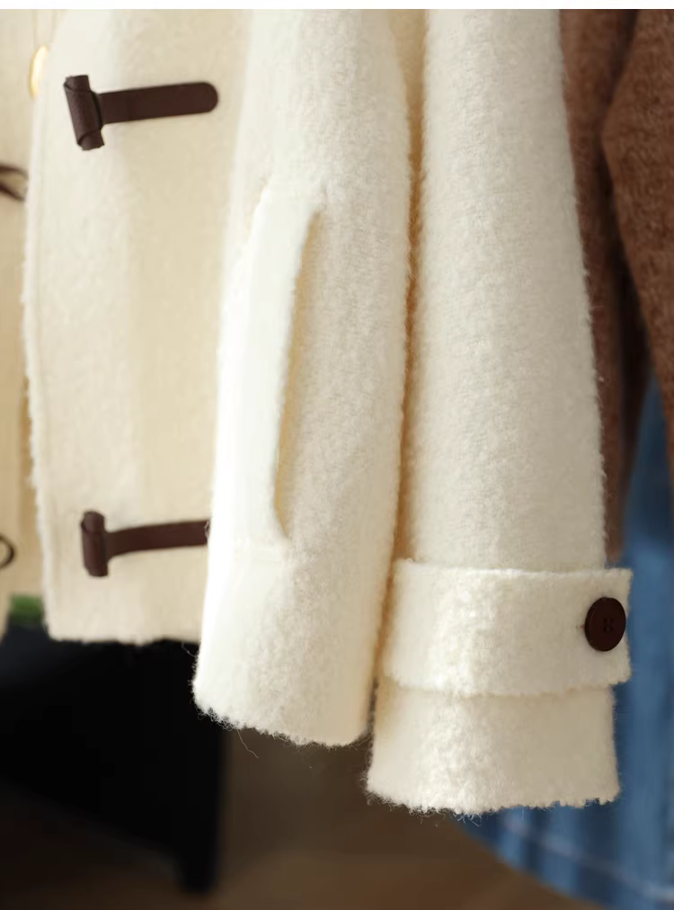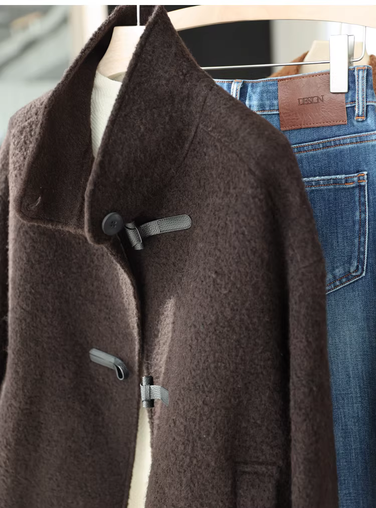 Áo khoác len alpaca Suli có cổ đứng và thiết kế khóa da, áo khoác len hai mặt dành cho phụ nữ nhỏ nhắn, mùa thu đông.