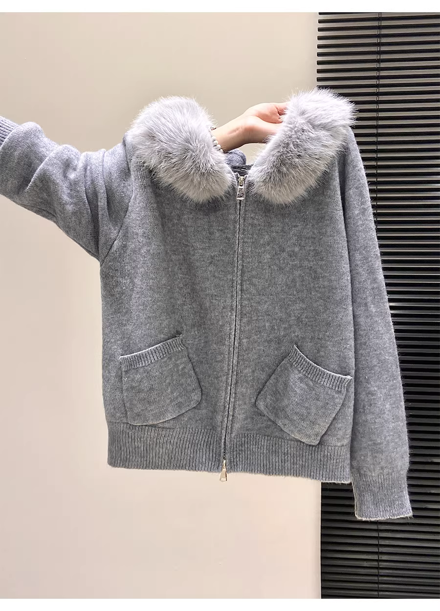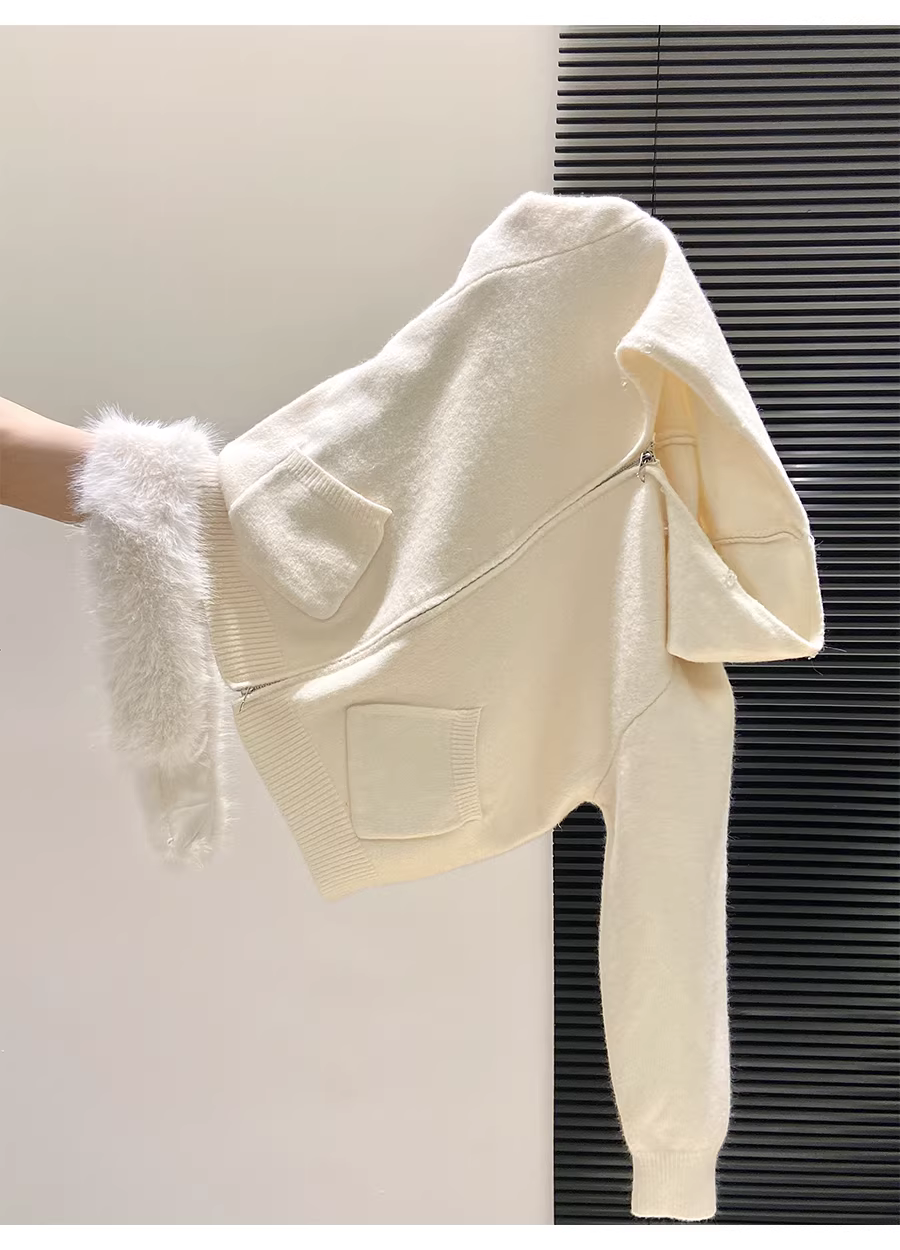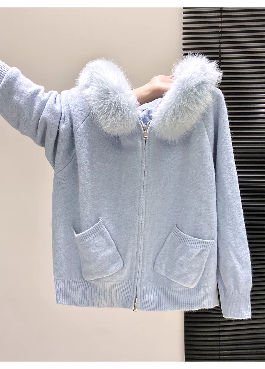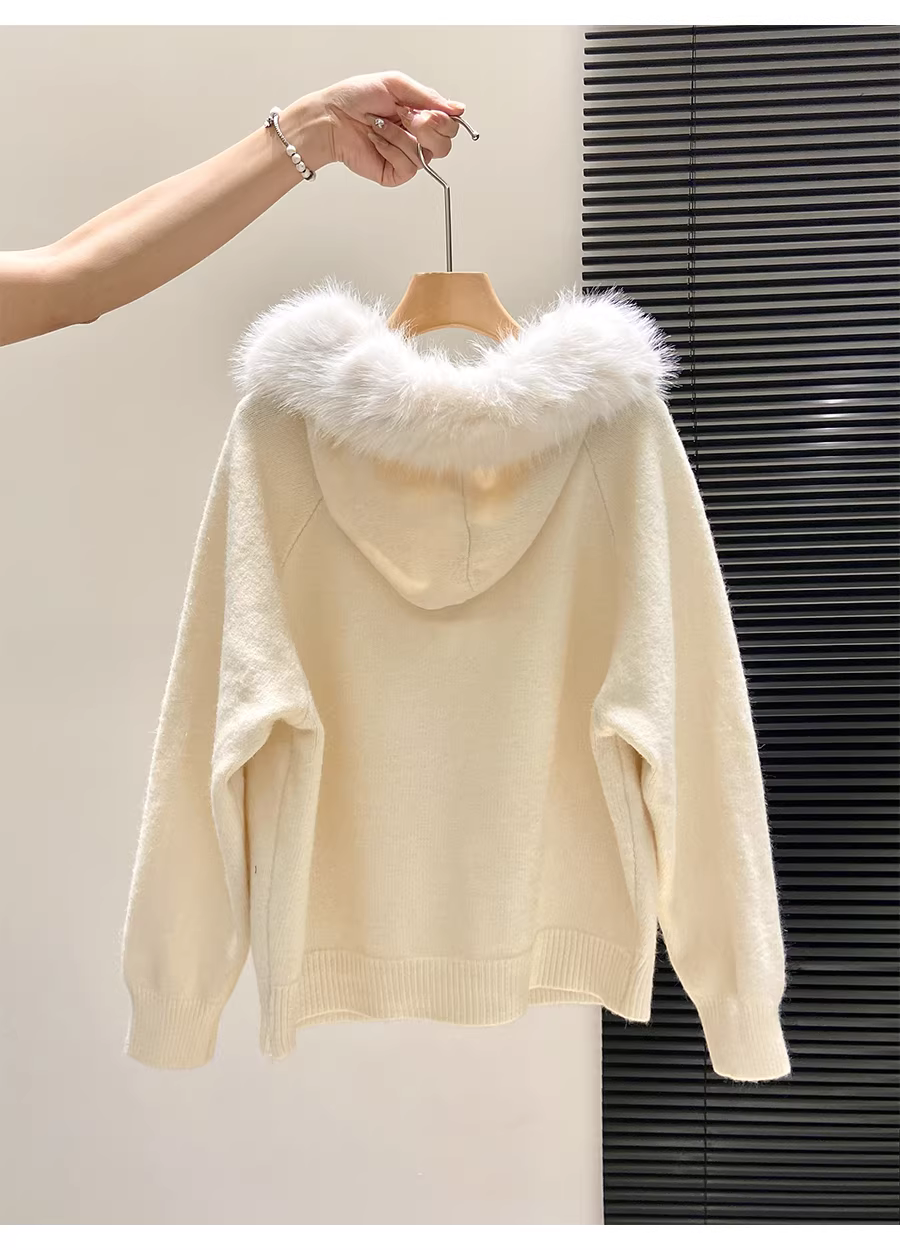 - Áo khoác len dệt kim có mũ kiểu lười La Chapelle dành cho nữ, mẫu mới thu đông 2025, cổ lông ấm áp