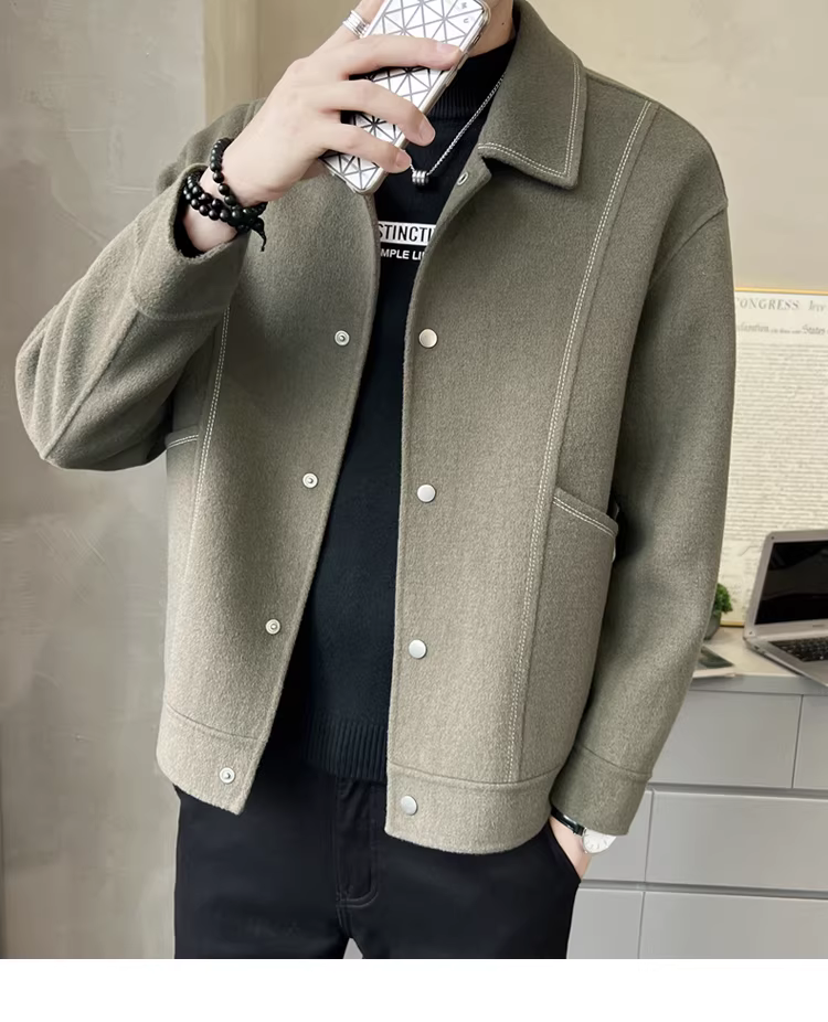- Áo khoác len nam mùa thu đông, kiểu ngắn, cao cấp, sang trọng nhẹ nhàng, hợp thời trang, giản dị, có ve áo, áo khoác len nam hai mặt bằng cashmere.