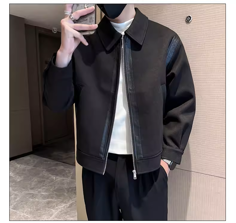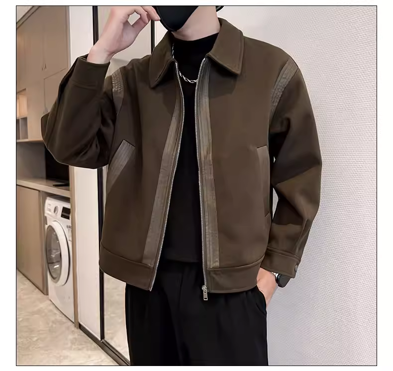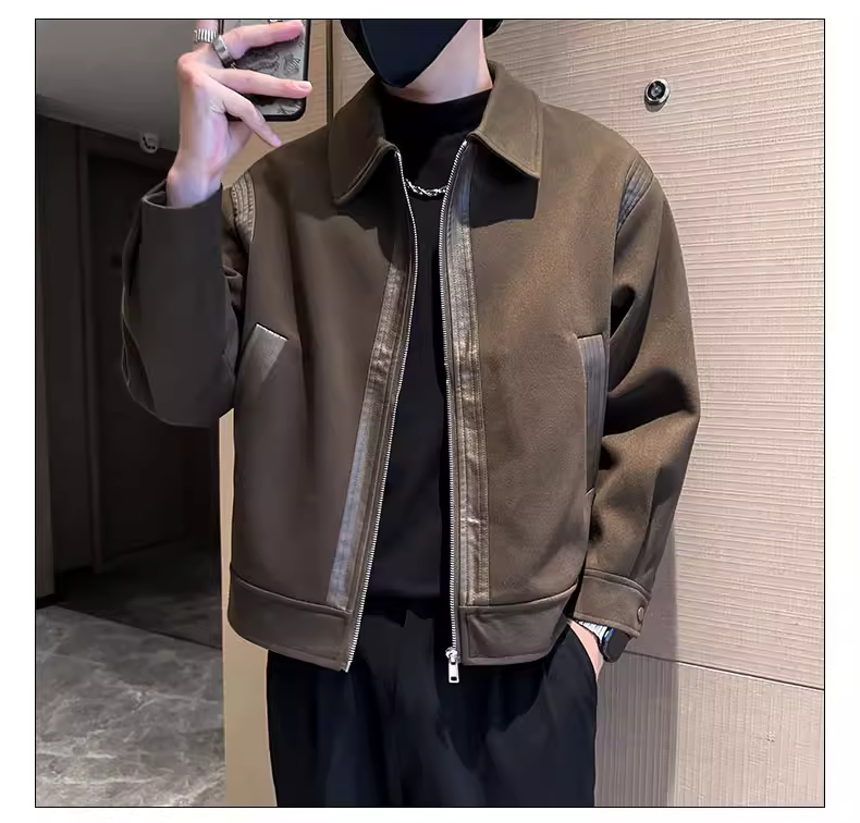 Áo khoác len nam phối da cho mùa thu đông, có đệm và dày dặn, kiểu dáng thời trang đa năng cao cấp