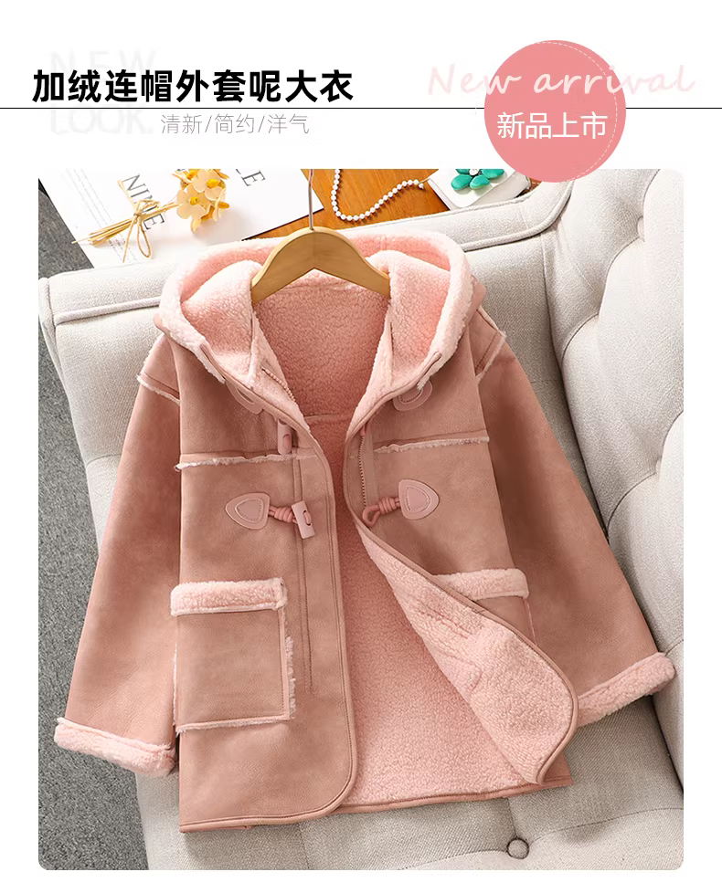- Áo khoác lông cừu dày dặn có mũ trùm đầu cho bé gái mùa thu đông 2025, áo khoác lông cừu tích hợp mới