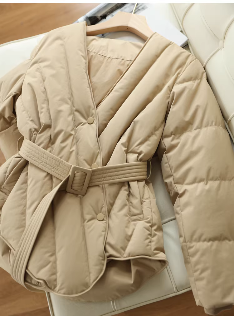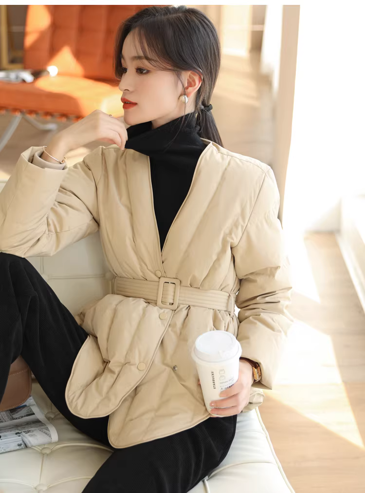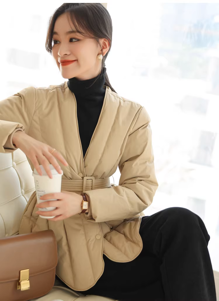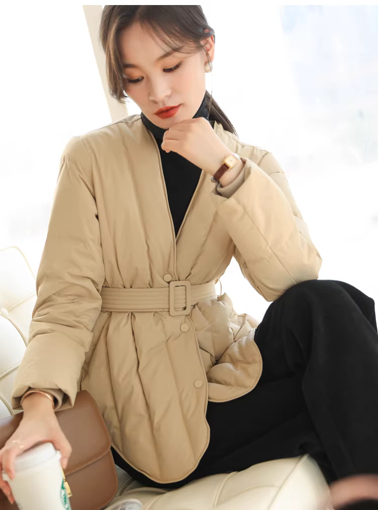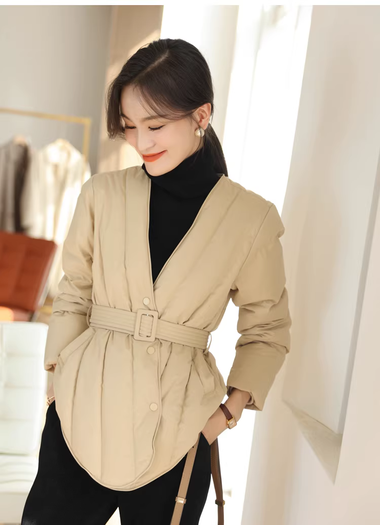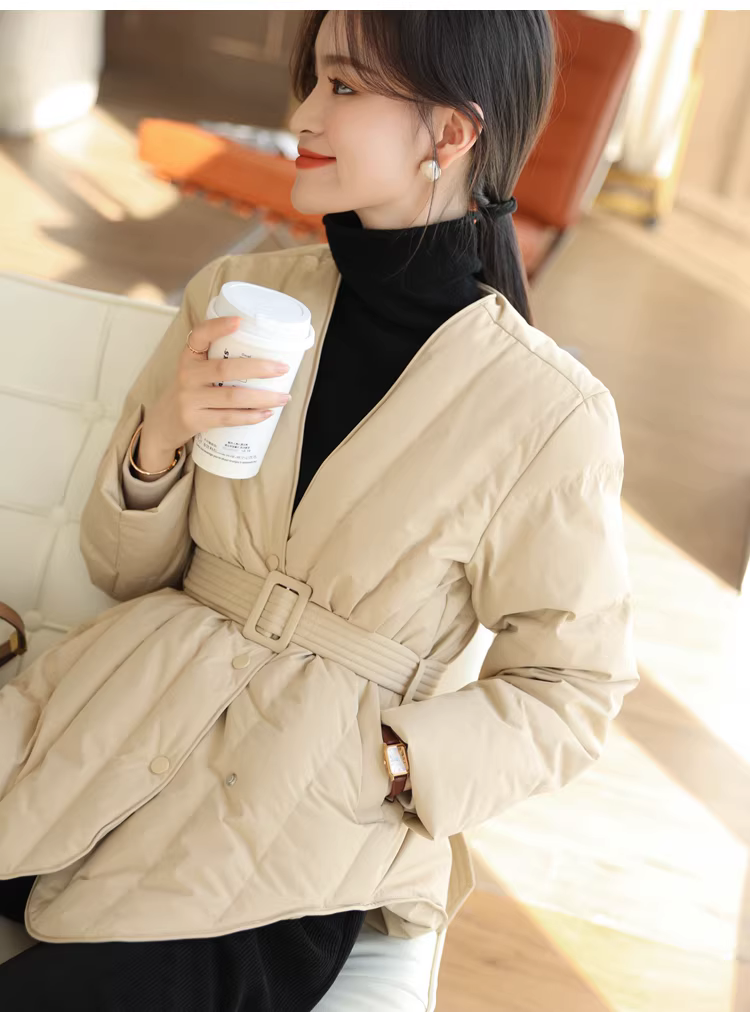Áo khoác lông ngỗng trắng 90 cổ chữ V có đường may chéo thắt lưng thon gọn có thắt lưng