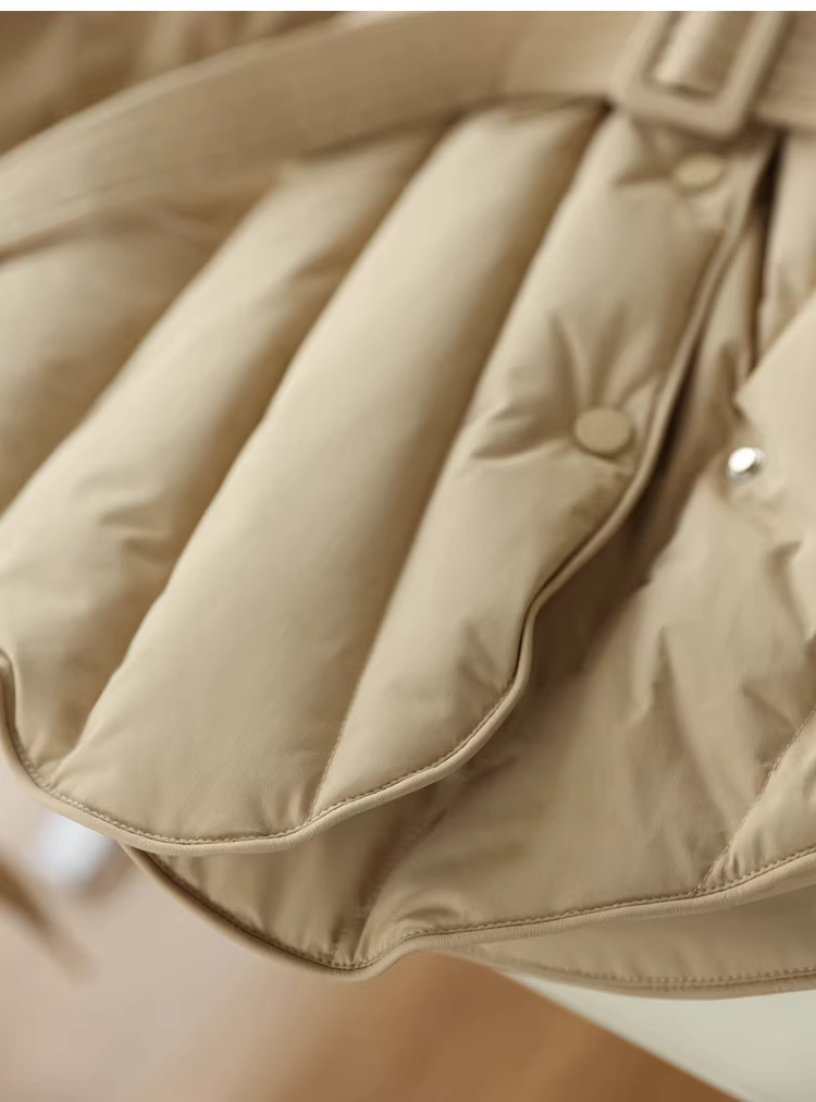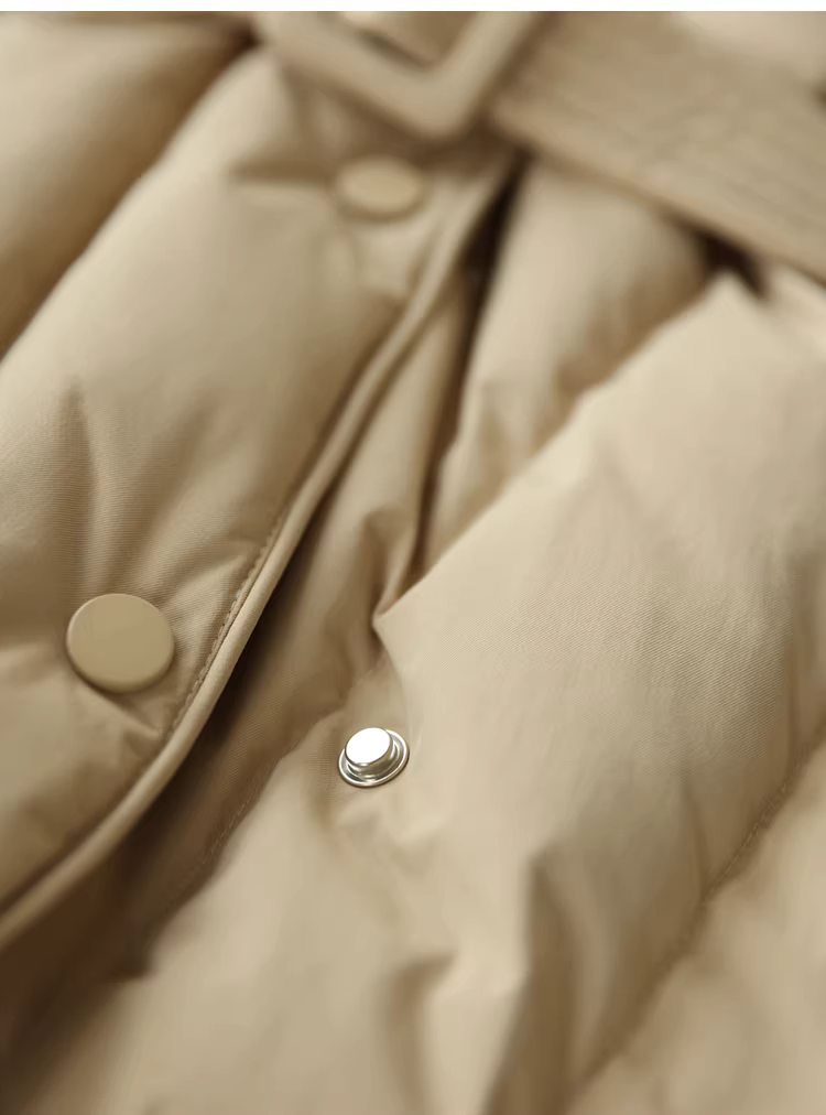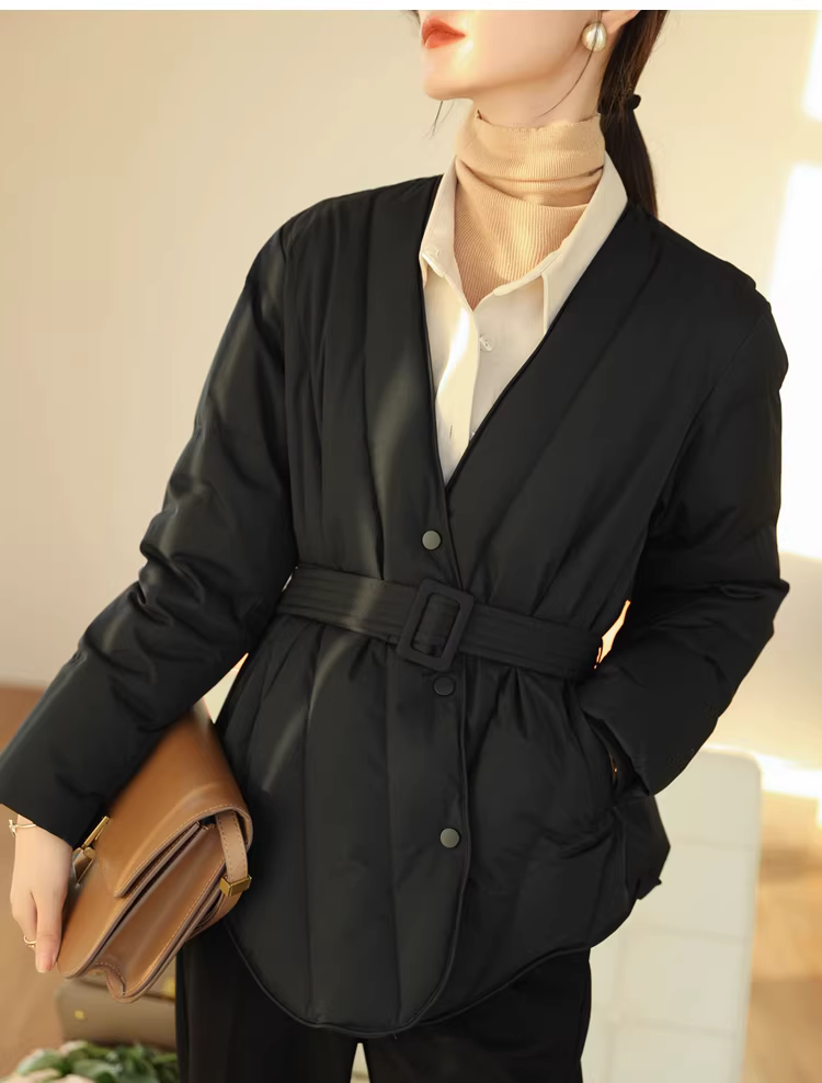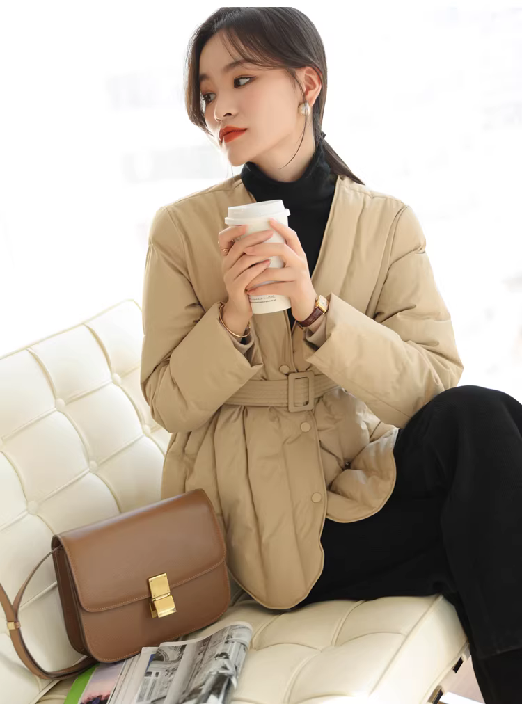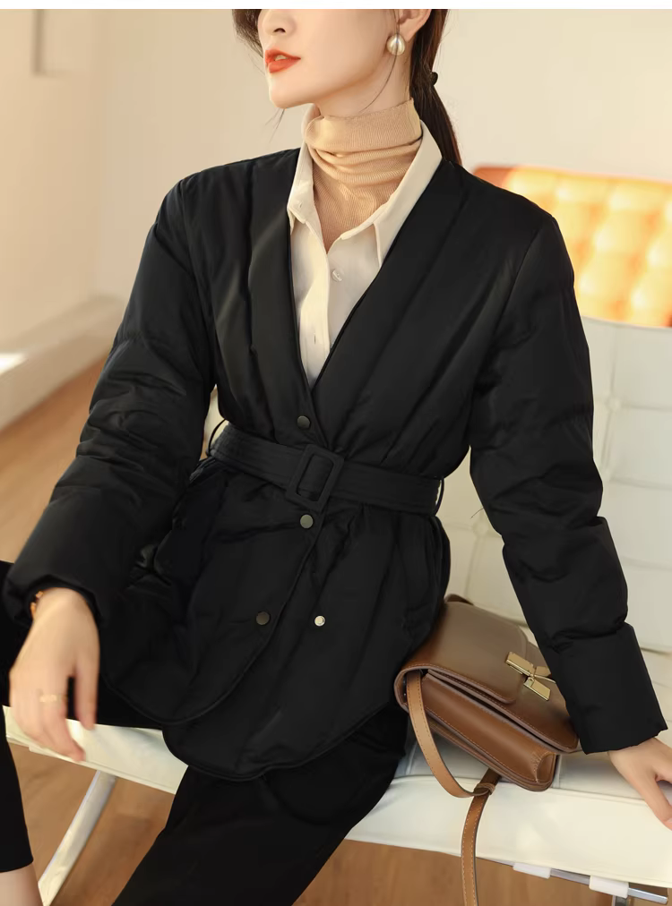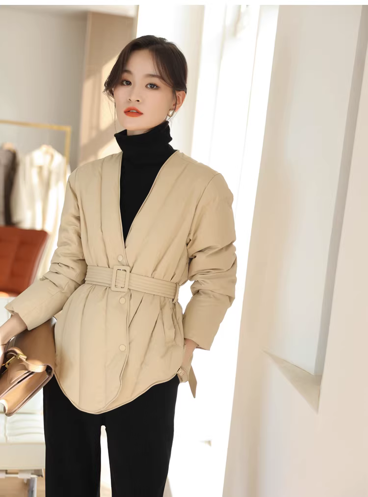 Áo khoác lông ngỗng trắng 90 cổ chữ V có đường may chéo thắt lưng thon gọn có thắt lưng