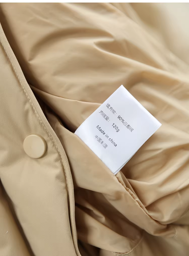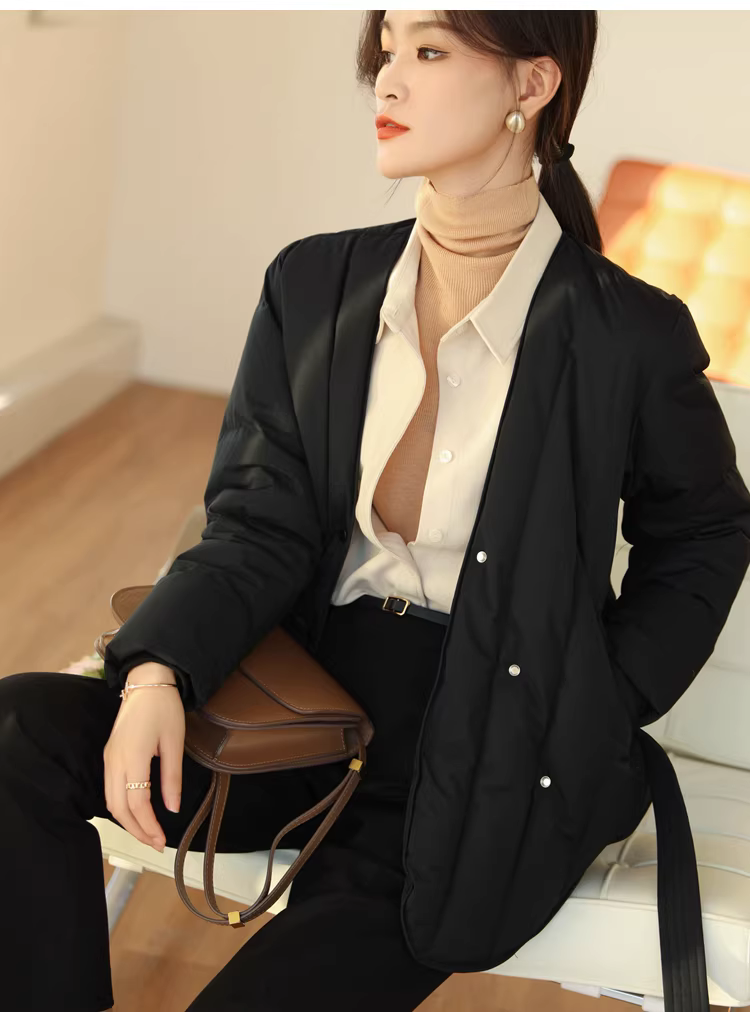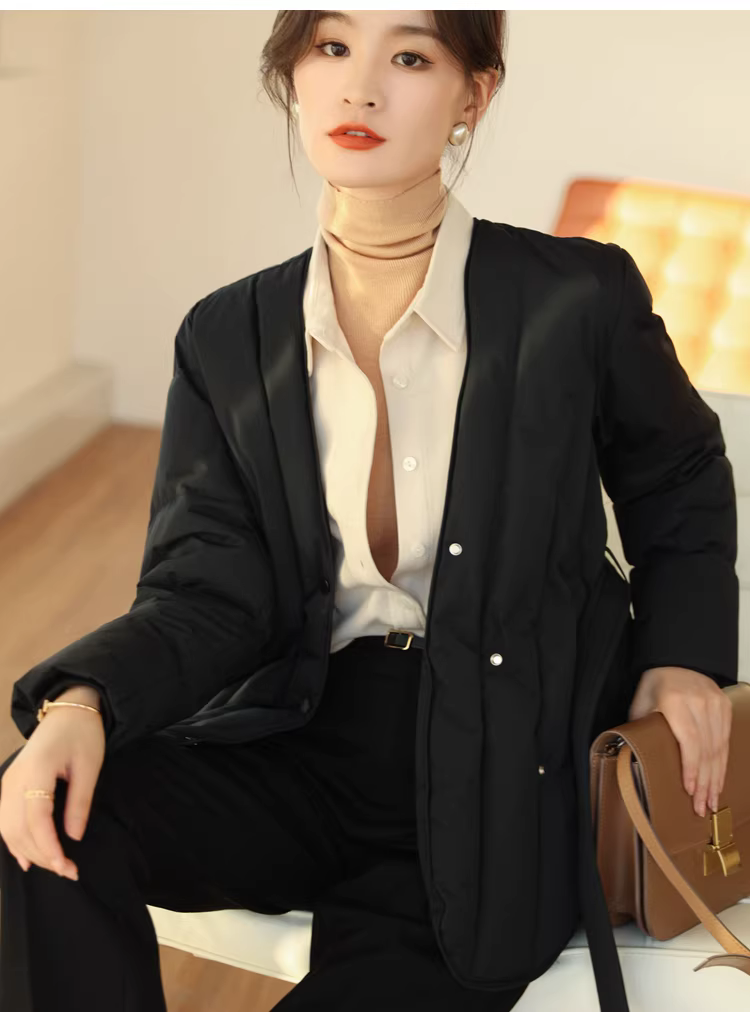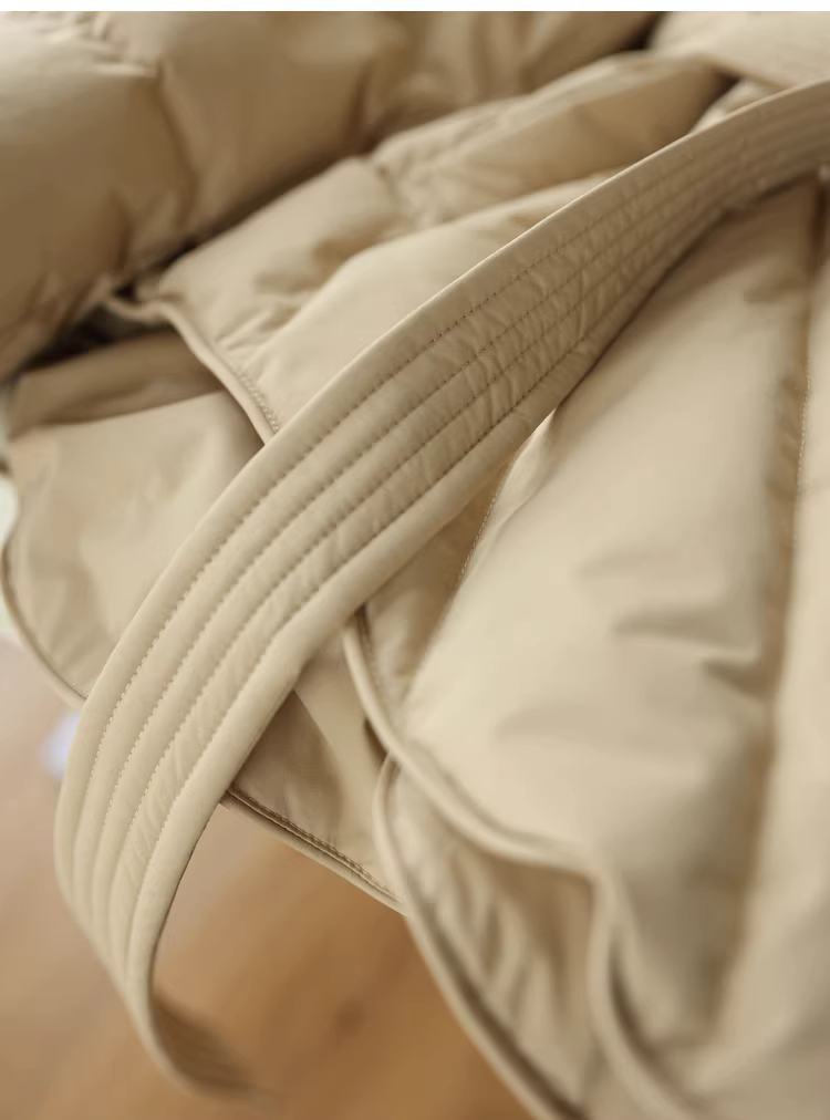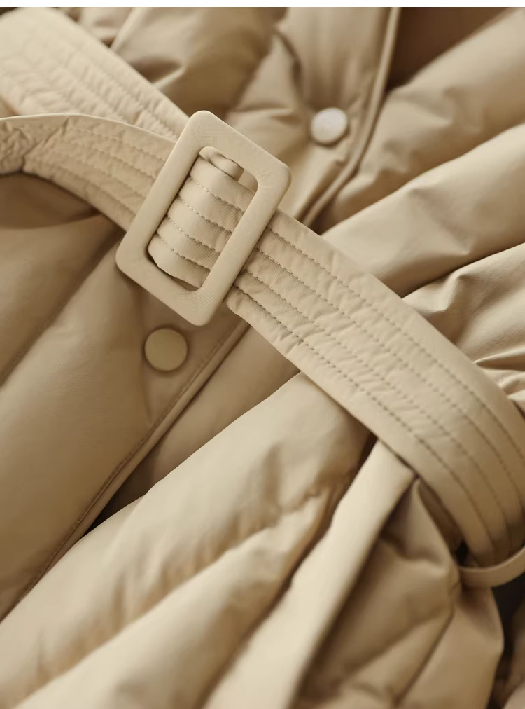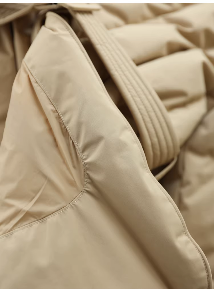 Áo khoác lông ngỗng trắng 90 cổ chữ V có đường may chéo thắt lưng thon gọn có thắt lưng