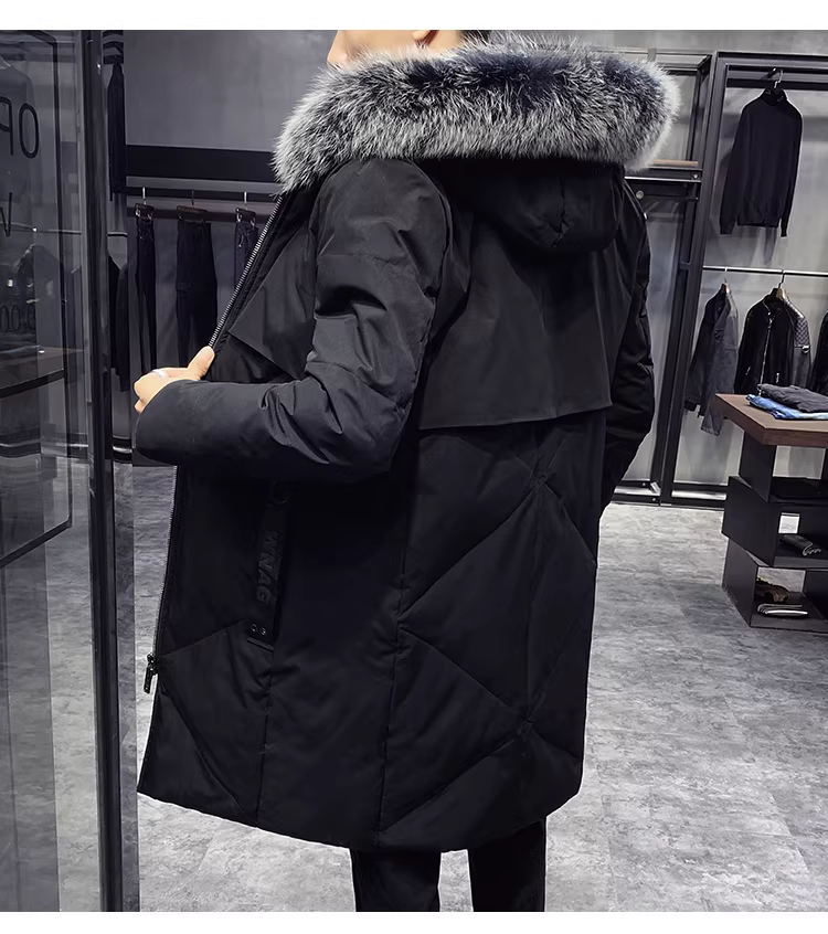 Áo khoác lông vũ có cổ lông cáo dành cho nam, áo khoác dài qua đầu gối, kiểu dáng dày dặn ấm áp mùa đông, đa năng và chất lượng cao.
