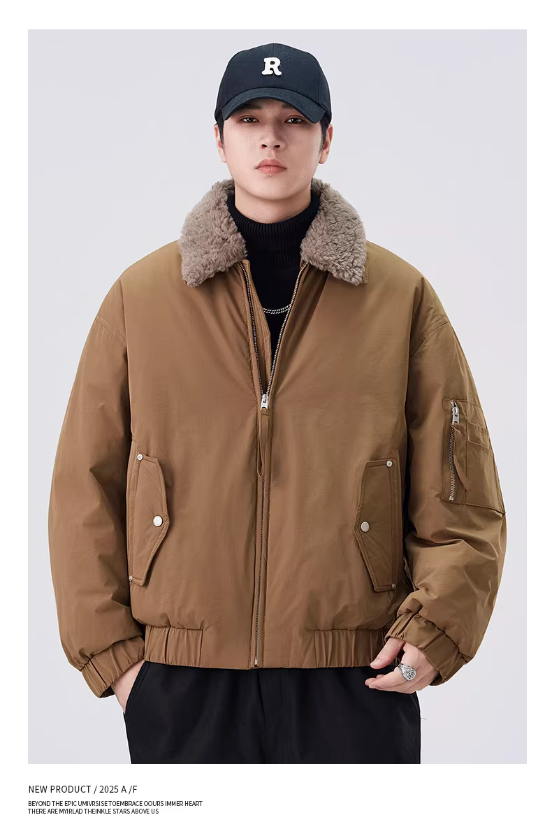 Áo khoác lông vũ cổ lông cừu nguyên chất 90% dành cho nam, áo khoác cotton dày dặn ấm áp mùa đông, áo khoác phi công, áo khoác bảo hộ lao động kiểu Mỹ.