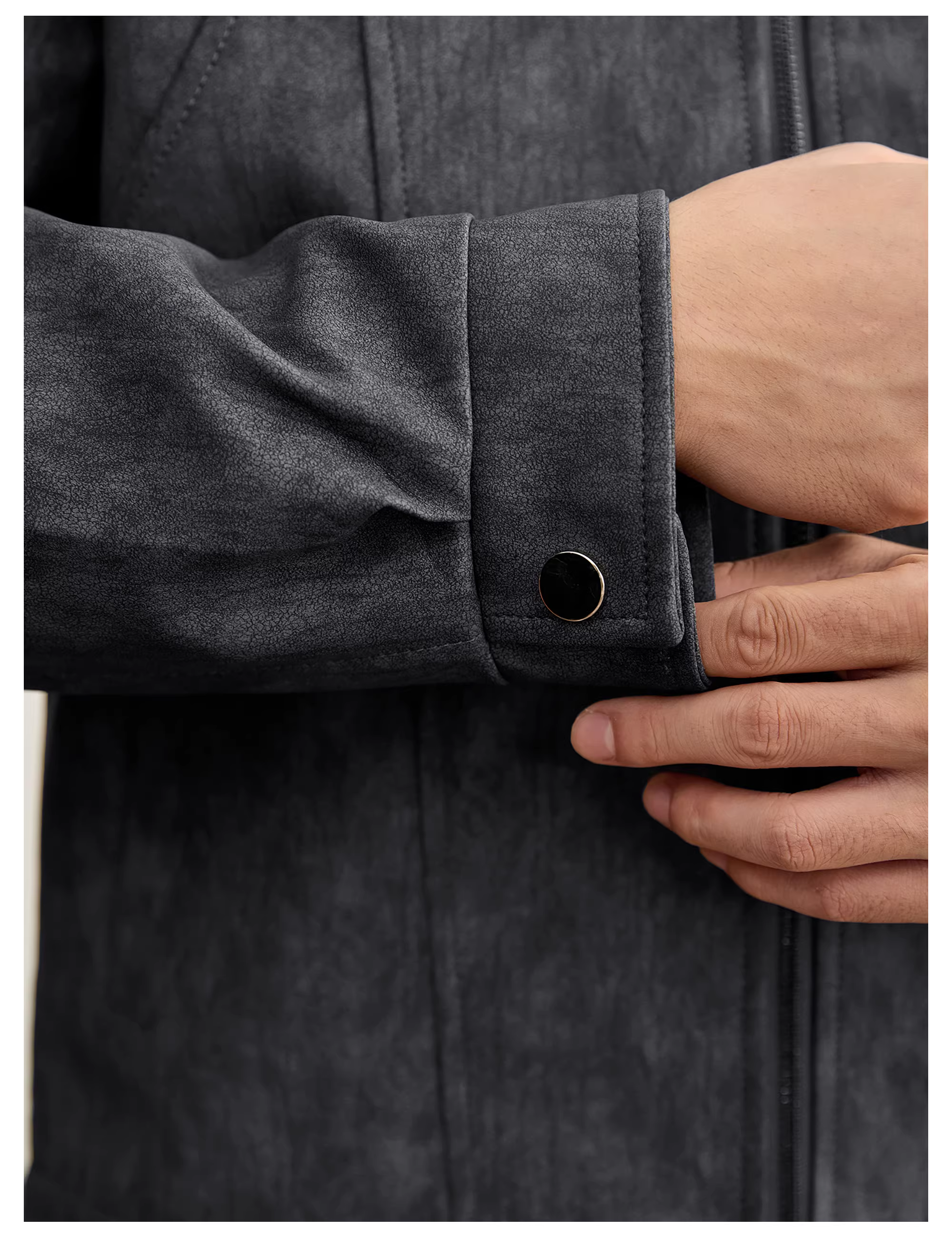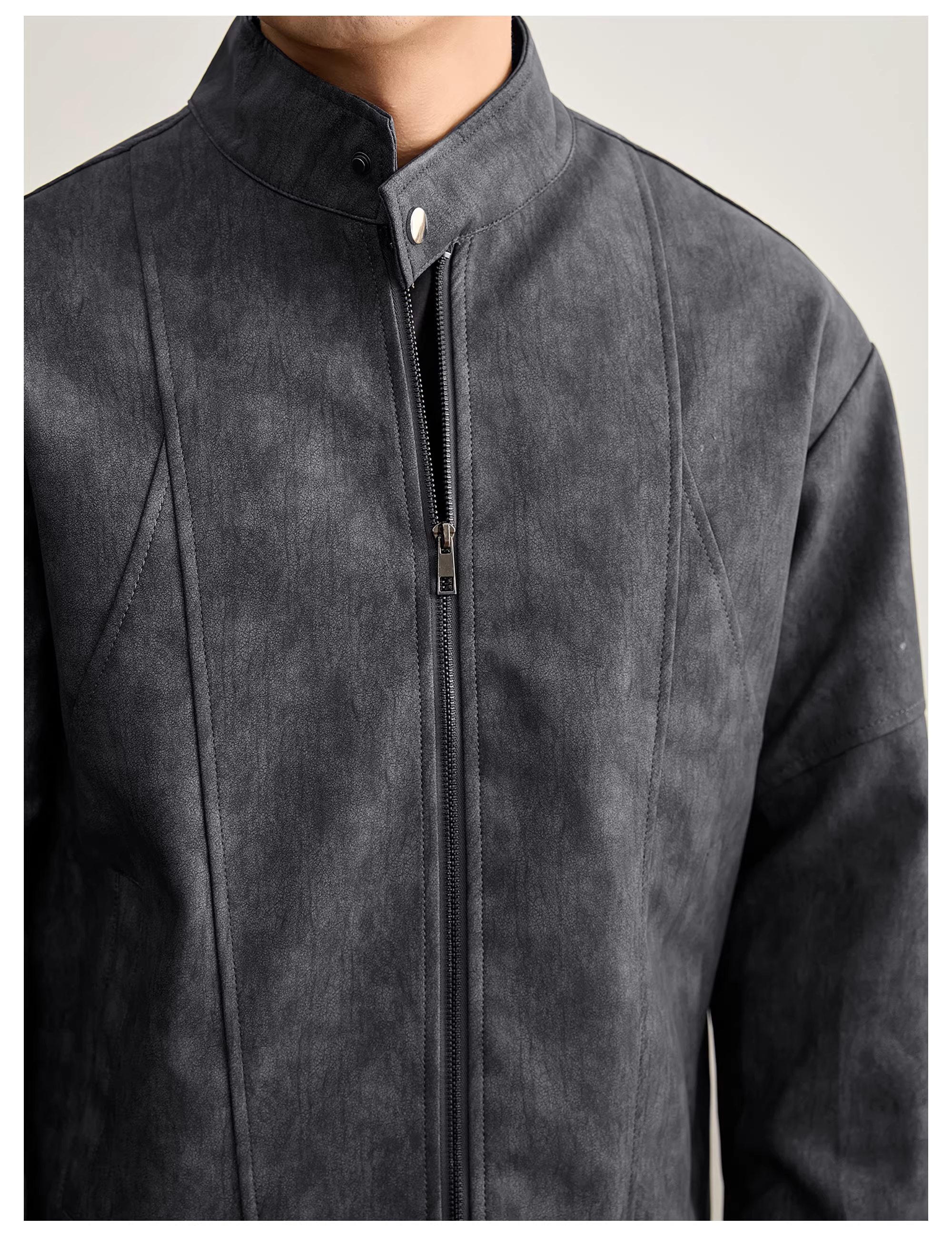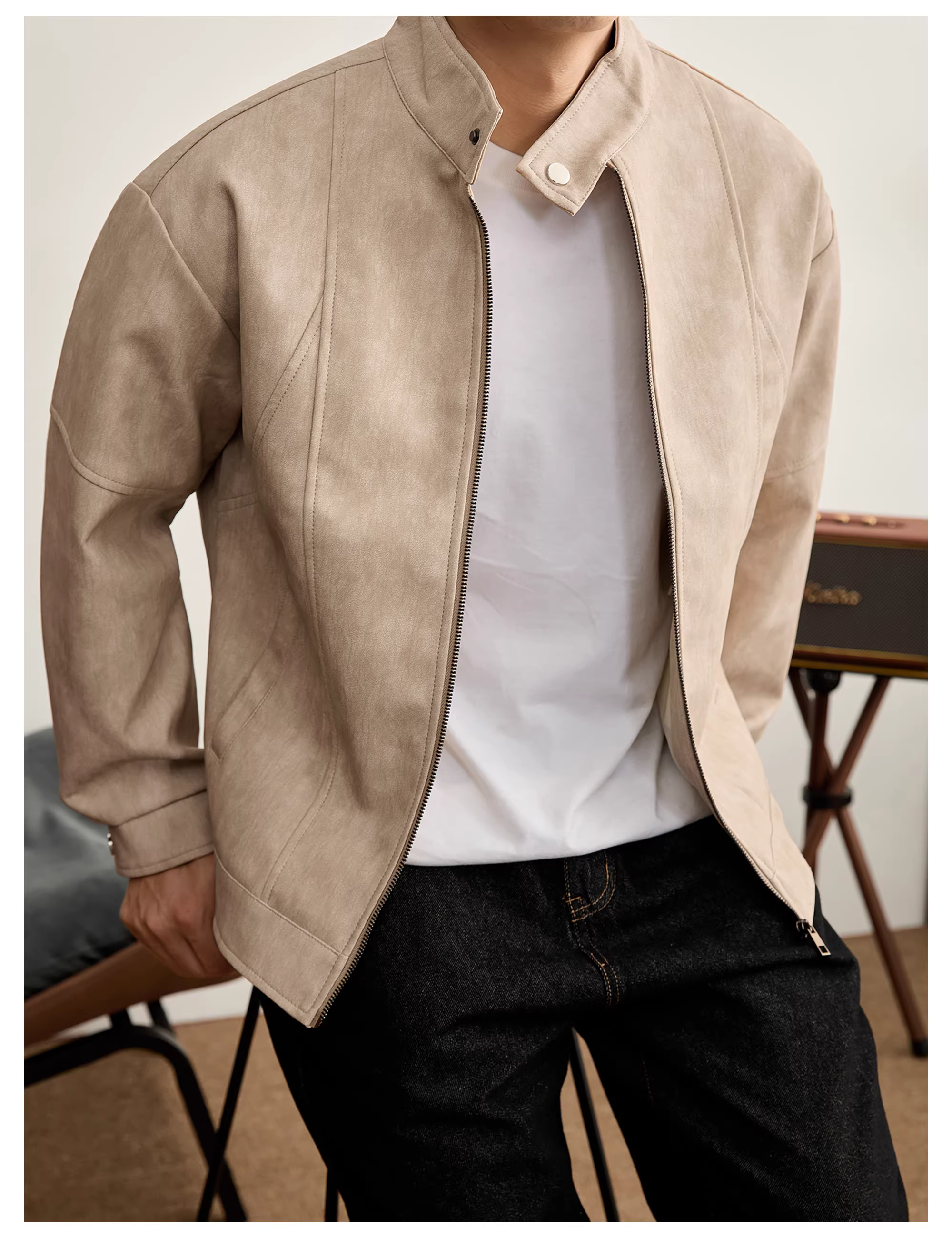 Áo khoác nam kiểu dáng cổ đứng, thiết kế retro, chất liệu da PU chống gió, kiểu dáng casual, có đường may ba chiều.