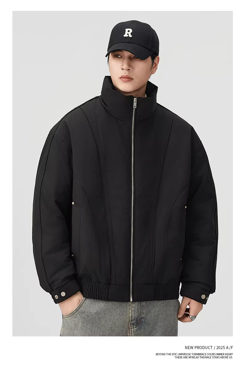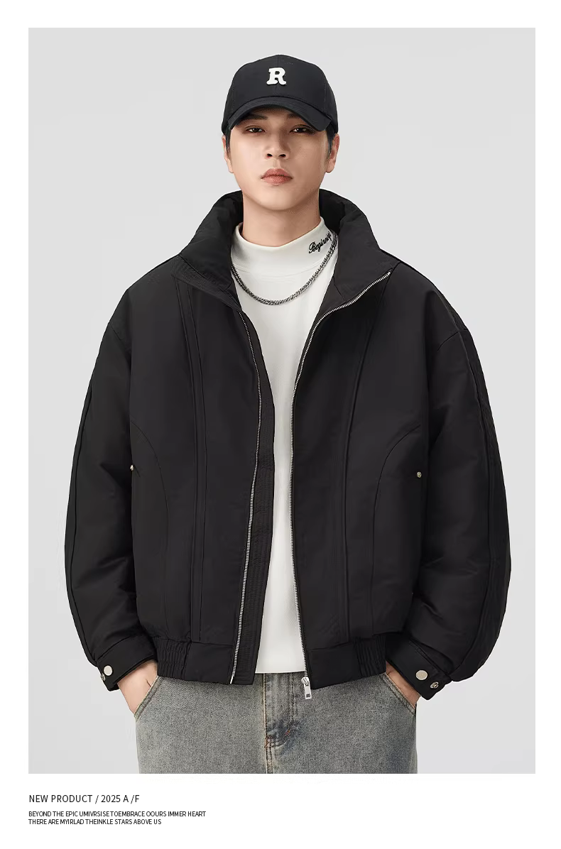 - Áo khoác nam mùa đông 2025 kiểu dáng mới, rộng rãi, dày dặn, phong cách Mỹ, kiểu dáng gọn gàng, có cổ đứng và lớp lông vũ.