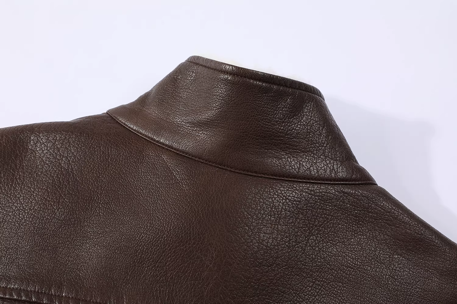 Áo khoác ngắn có cổ đứng màu cà phê phong cách CuteGirl Melard dành cho nữ, khí chất mùa thu, áo khoác da rộng rãi và đa năng