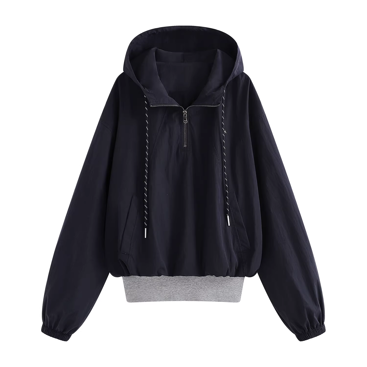 - Áo khoác ngắn có mũ trùm đầu kiểu dáng cổ điển giả hai mảnh phong cách retro của Mỹ dành cho nữ, áo khoác gió dáng ôm