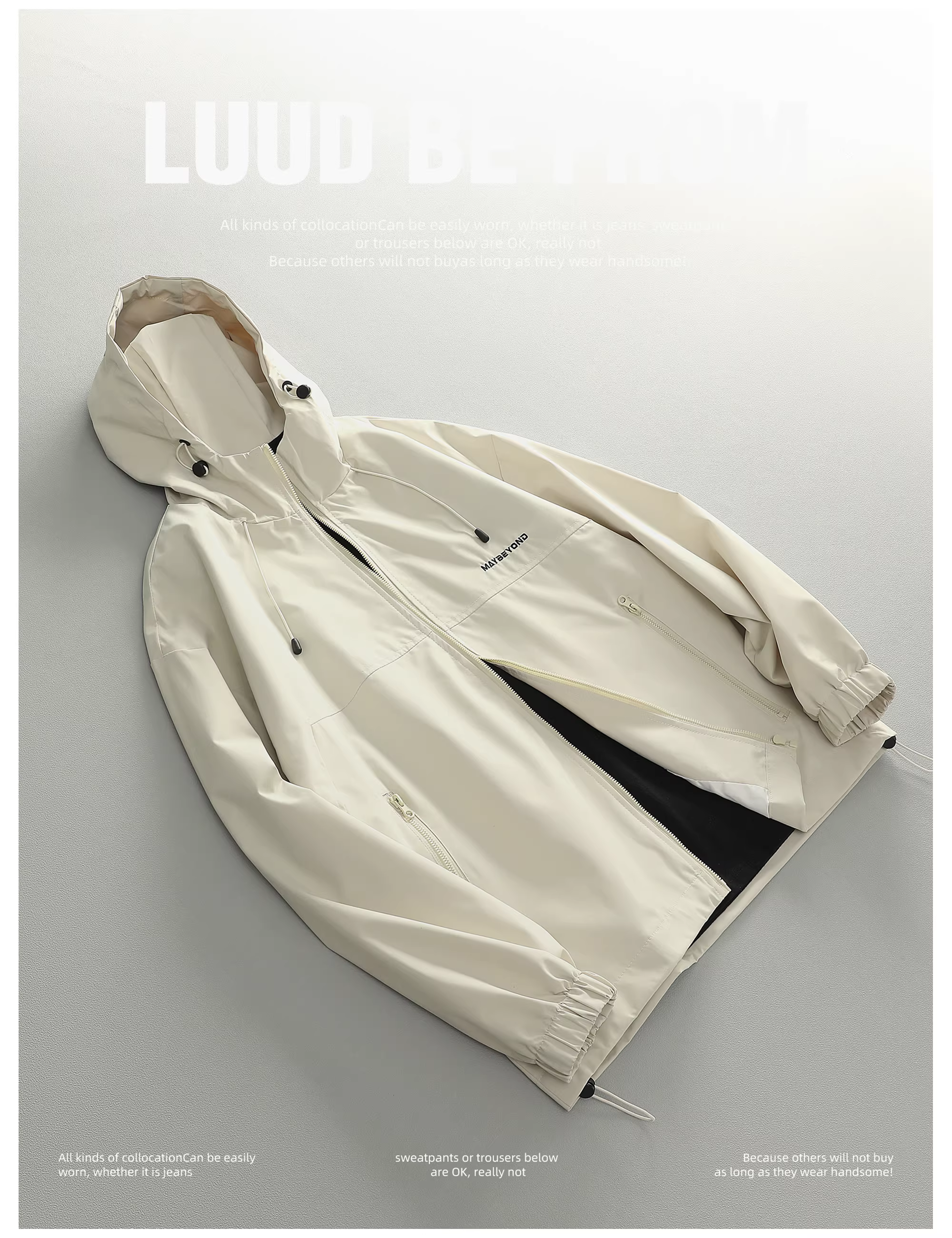 - Áo khoác ngoài thường ngày có mũ trùm đầu phong cách retro, có túi khóa kéo, áo gió nam LUUD