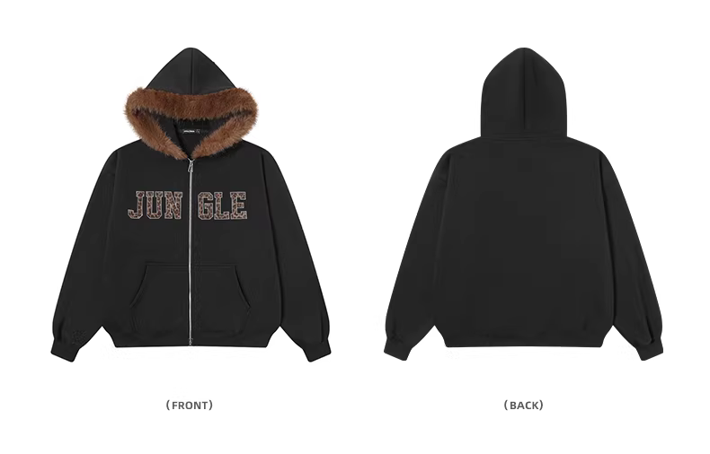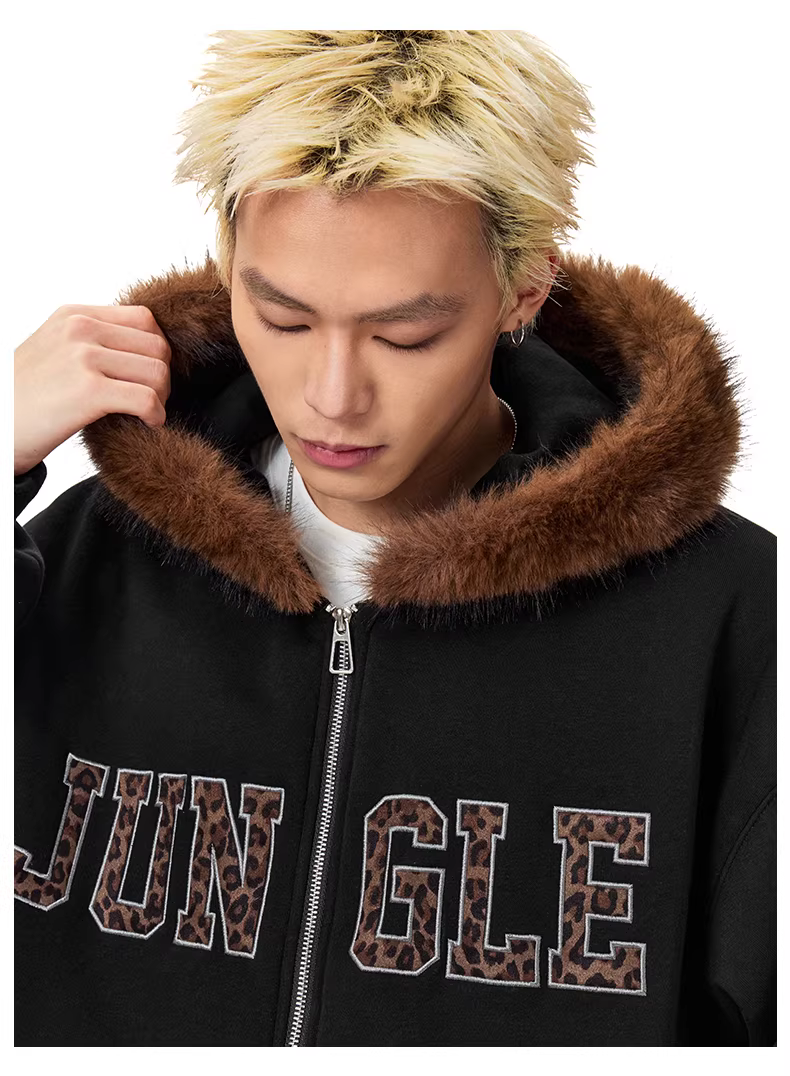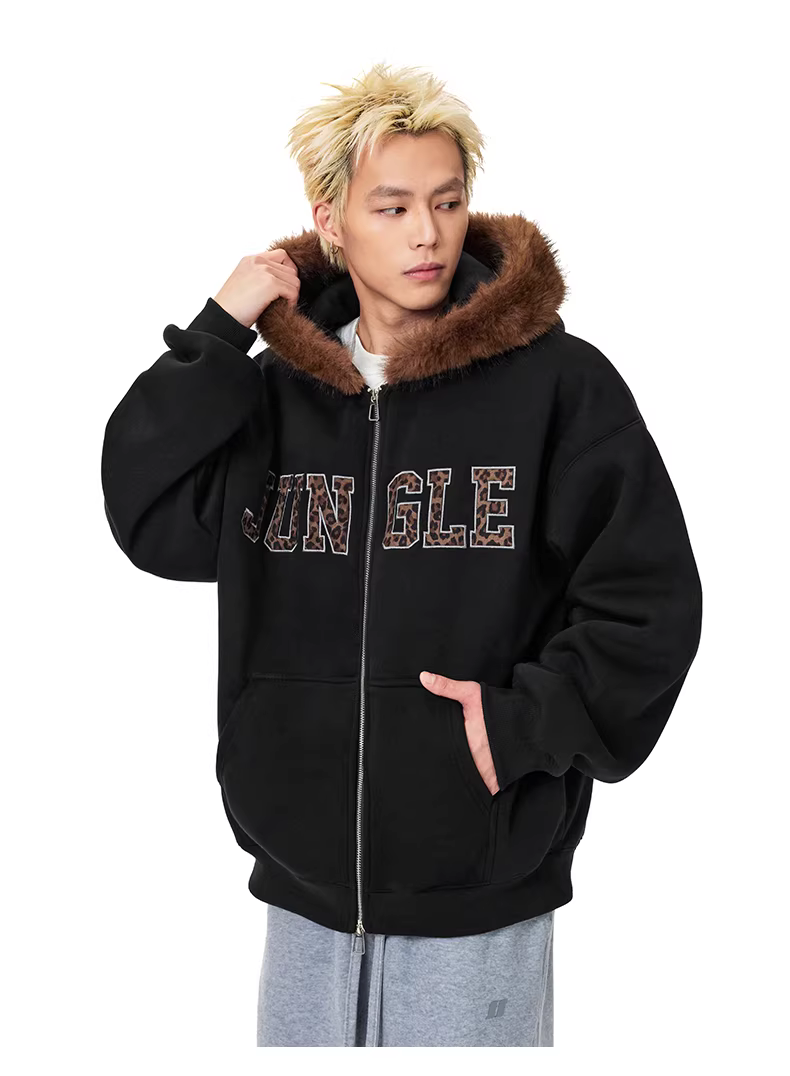 - Áo khoác nỉ nam có mũ trùm đầu, cổ lông thêu họa tiết báo đốm, khóa kéo, kiểu dáng Mỹ, chất liệu dày dặn