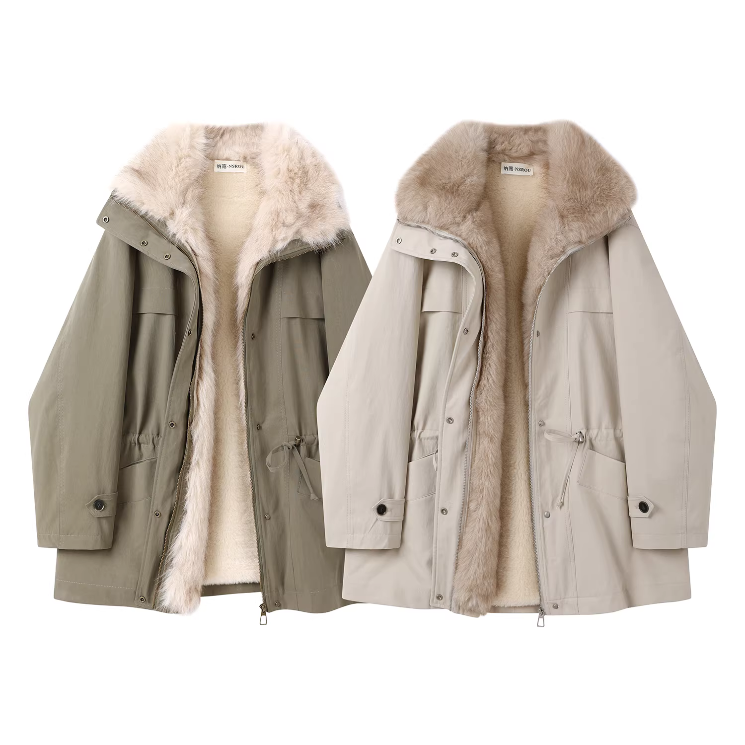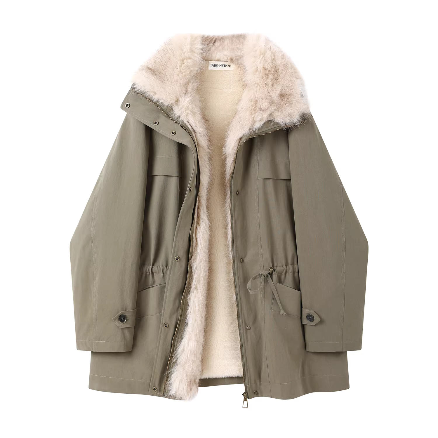 Áo khoác parka cổ lông đa năng kiểu dáng rộng theo phong cách cổ điển của Mỹ dành cho nữ, áo khoác cotton dài vừa phải lót lông cừu mùa đông.